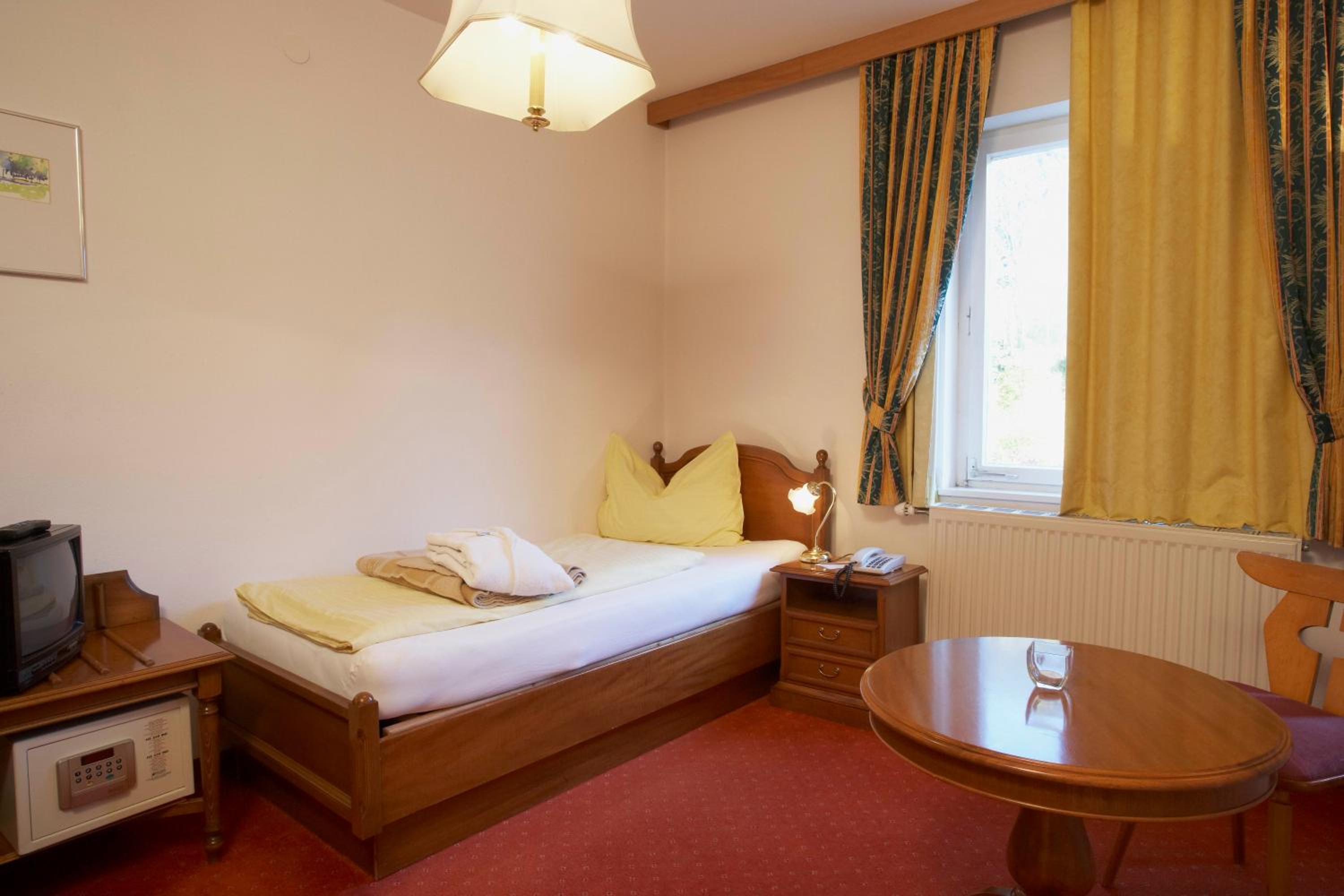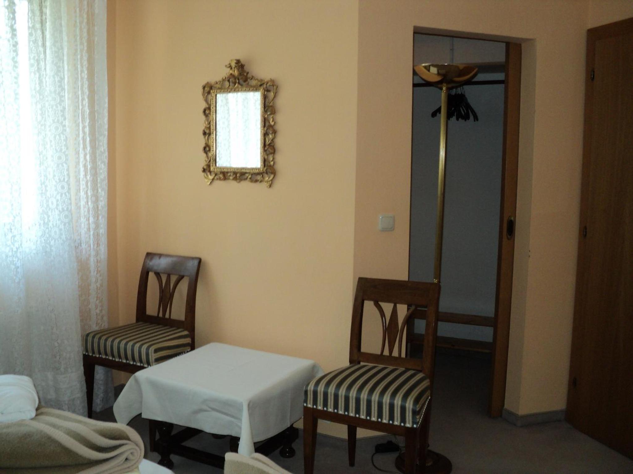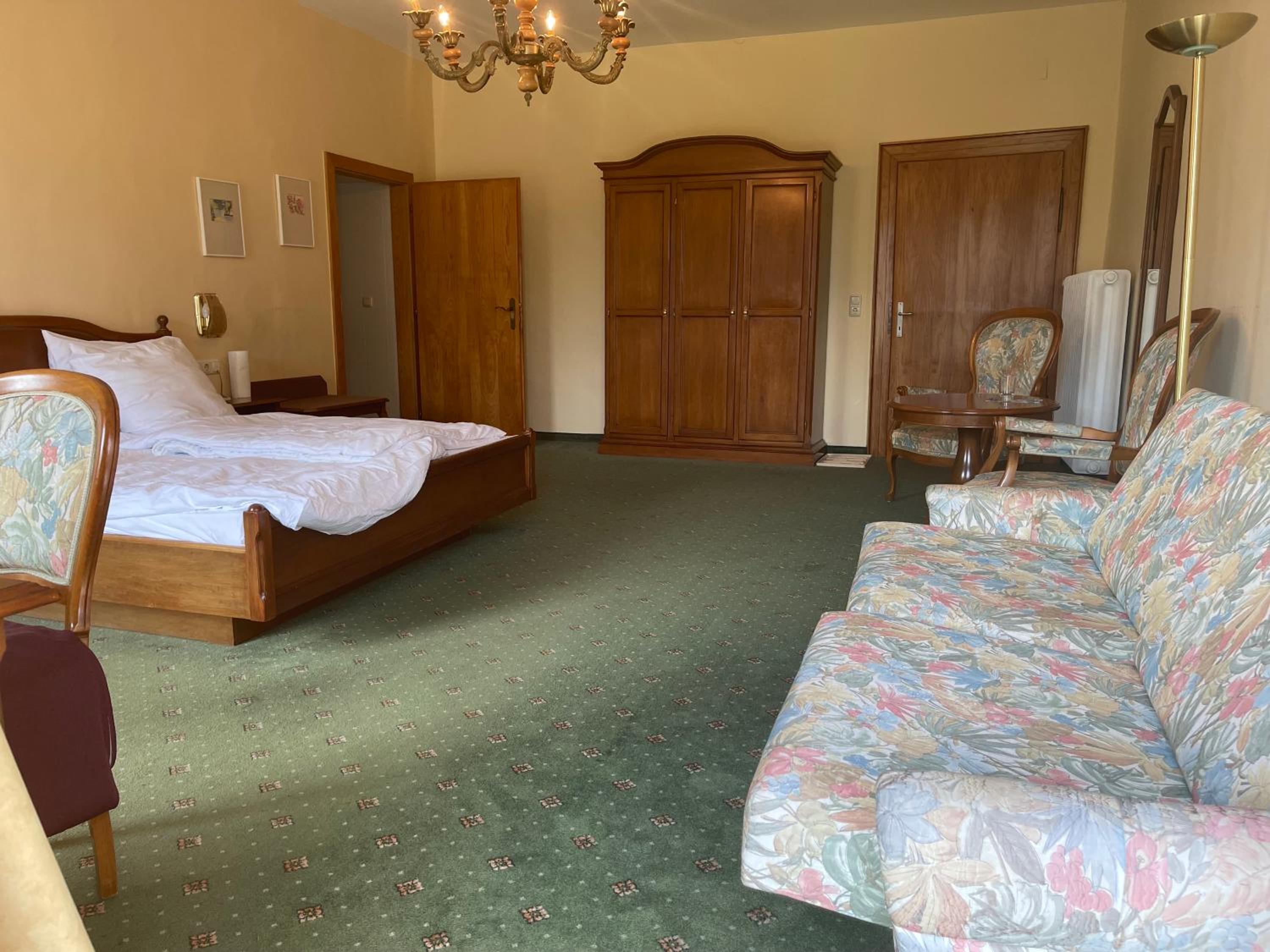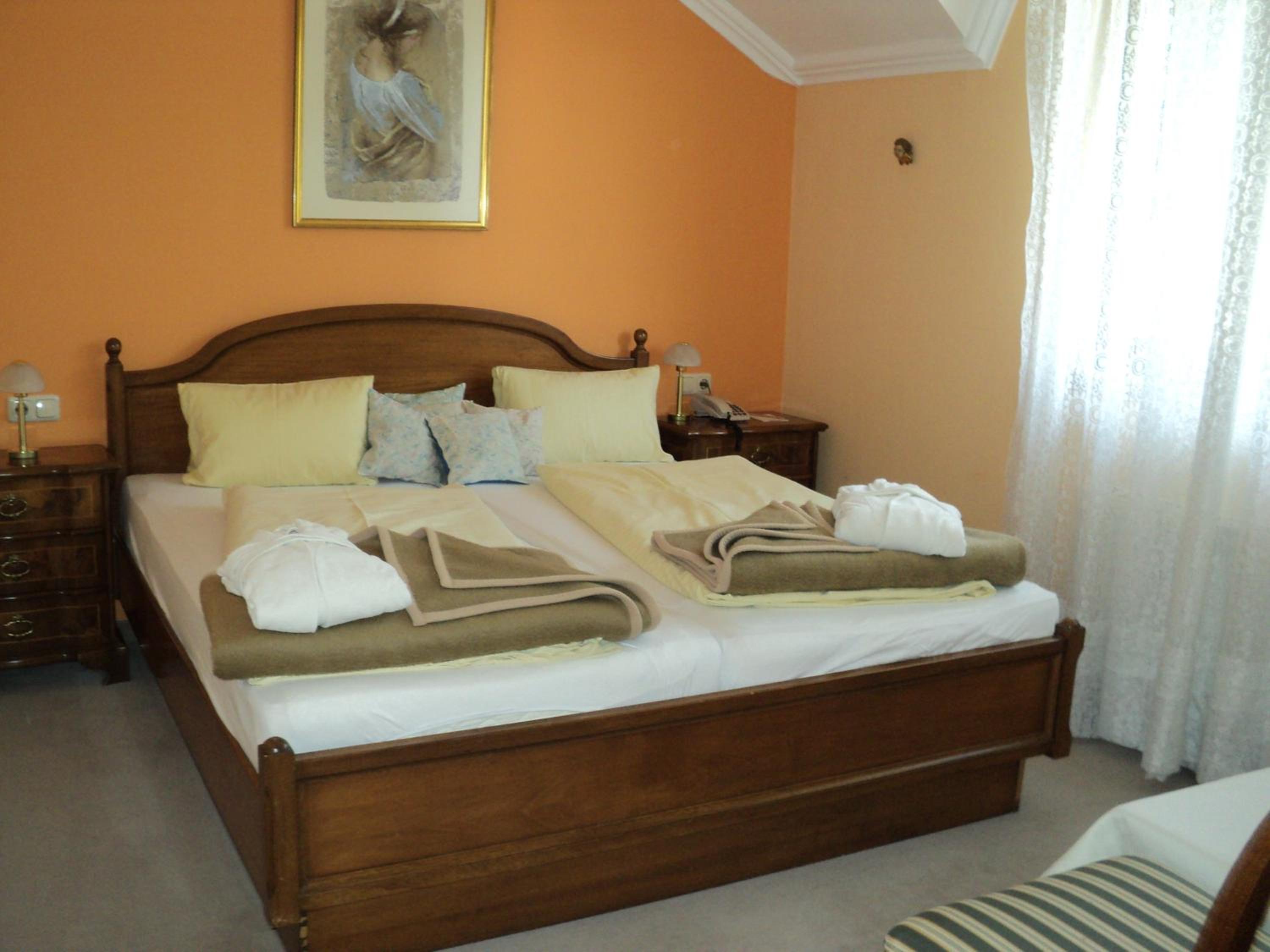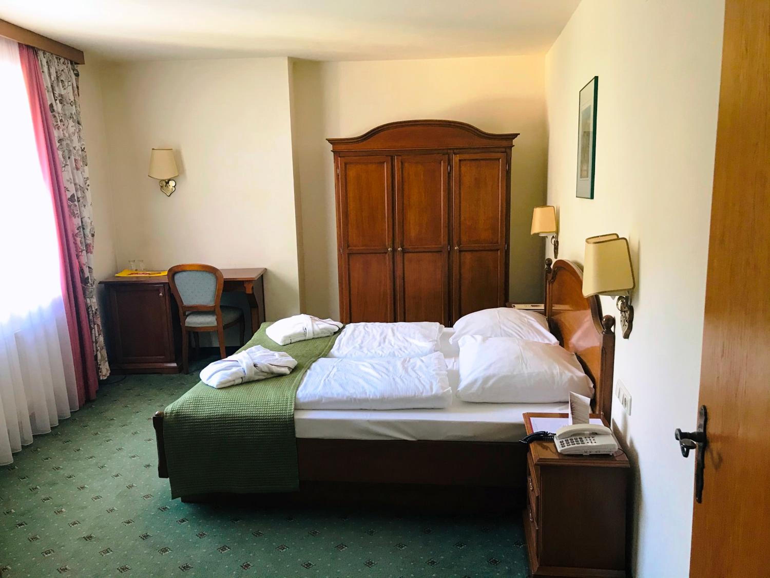 Freundlicher Empfang, ruhiges Zimmer mit Balkon. Bequeme Betten, das Bad okay, zwei Wellnesshandtücher für den Pool. Das Hotel ist älter (müsste mal renoviert werden) aber alles sauber und gut ausgestattet, sehr ruhige Lage. Schöne Außenanlage mit Pool und Garten der mal etwas Pflege benötigt. Sogar ein Grillplatz und Tischtennisplatte sind vorhanden. Parkplatz neben dem Haus. Das Abendessen (kleine Speisekarte) war sehr gut und reichlich. Das Frühstück war gut, trotz der wenigen Gäste.