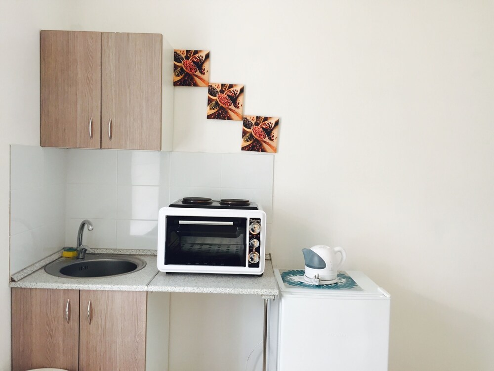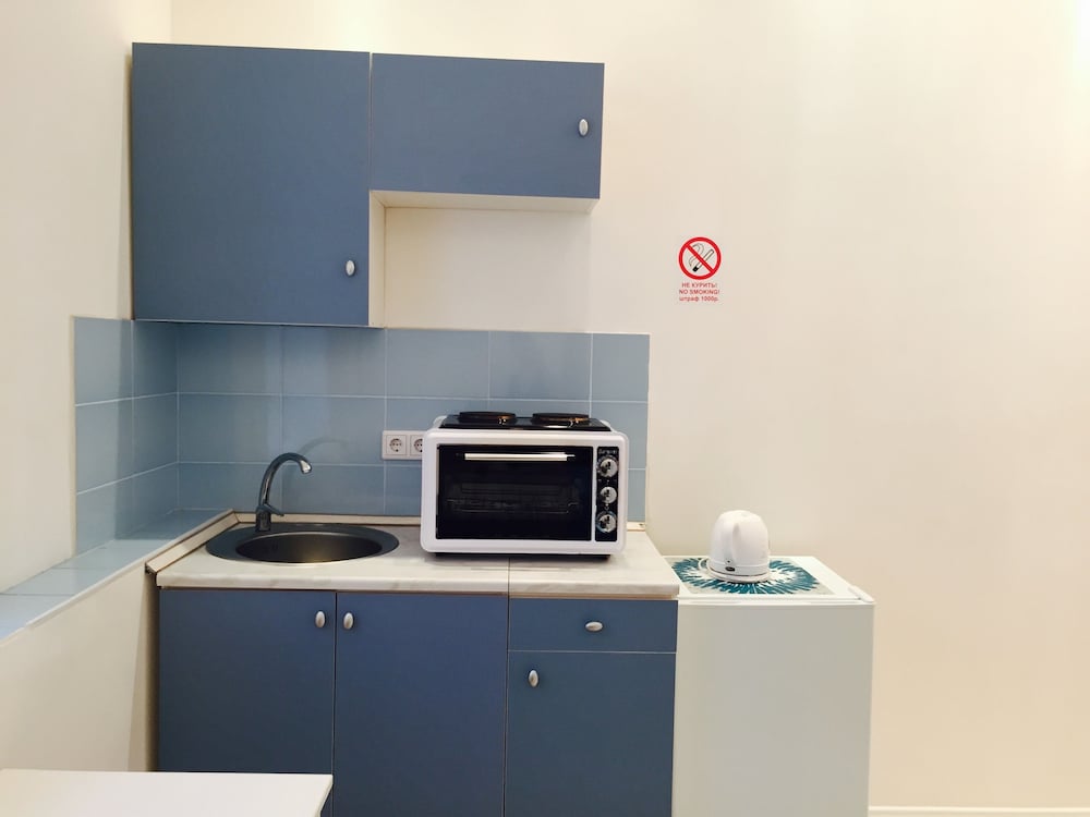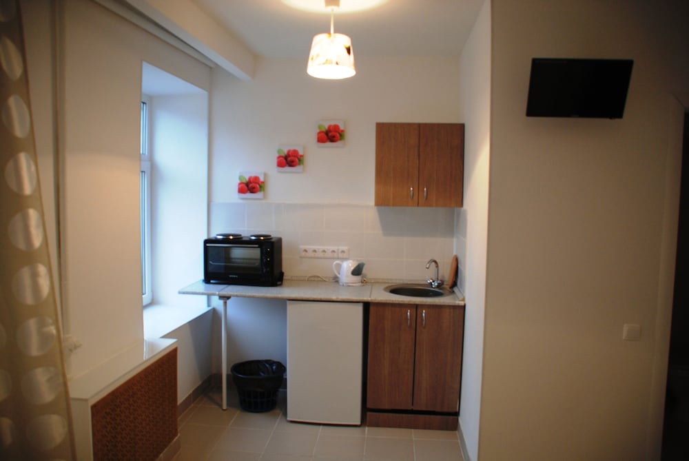 Номер просторный, есть мини-кухня с электрической миниплитой, кухонные принадлежности, холодильник. В ванной комнате была сломана стойка для душа, но по нашей просьбе в тот же день починили во время нашего отсутствия. Также отелем выдается набор для душа - мыло, шампунь, кондиционер для волос "Натура Сиберика". Уборка производится редко, но отель об этом предупреждает.