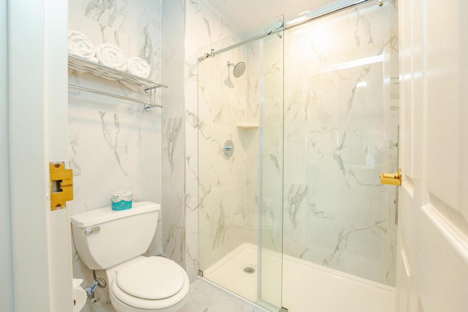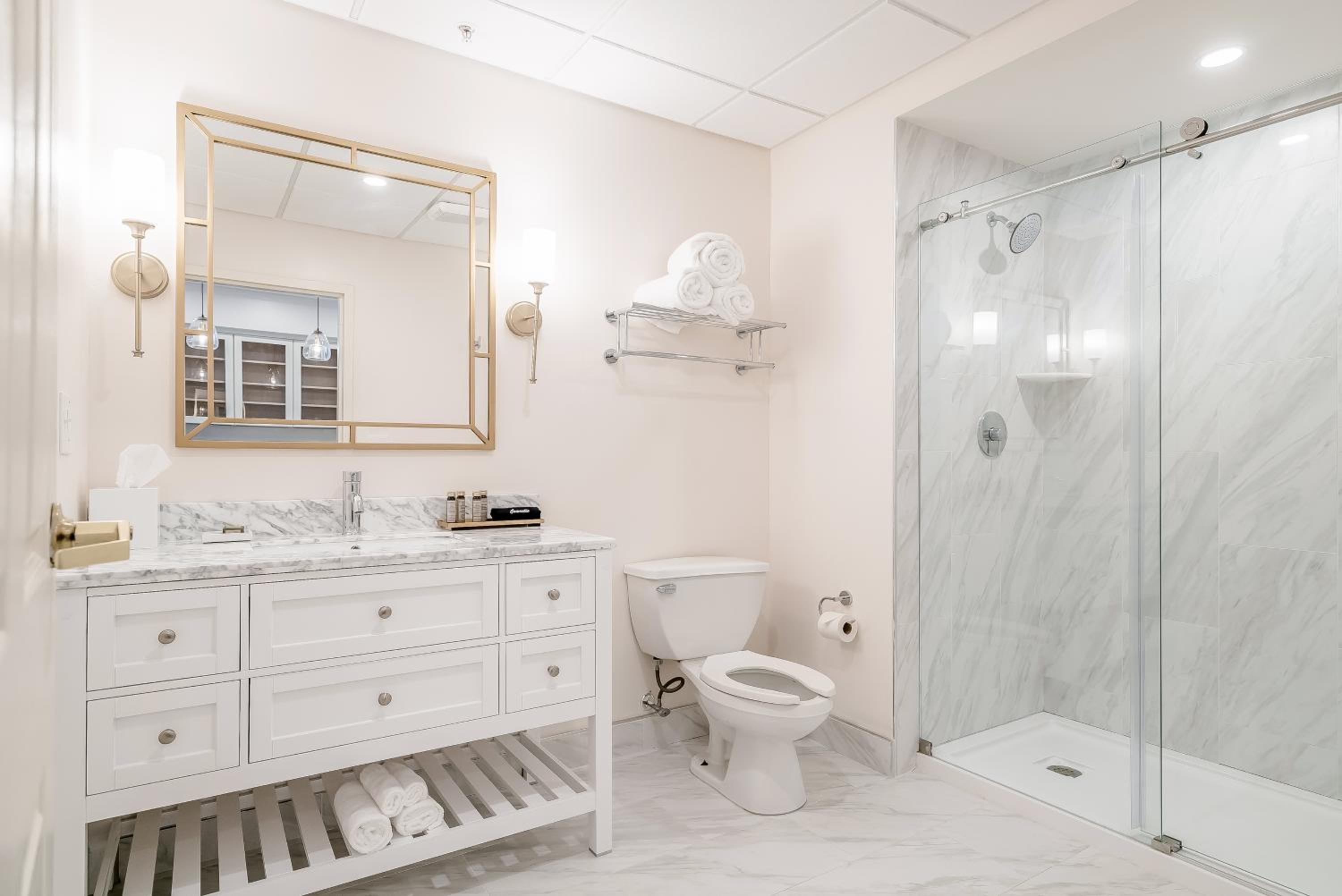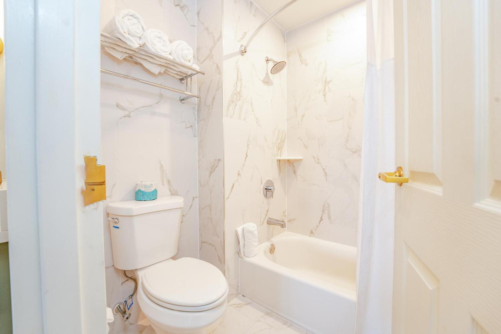 There was no shelf or hooks in the bathroom for towels and no soap dish in the standing shower. SUPER WEIRD and inconvenient. Who wants to keep bending down for soap?