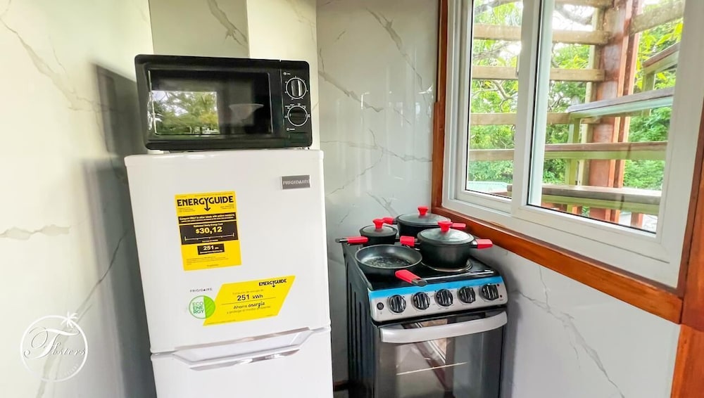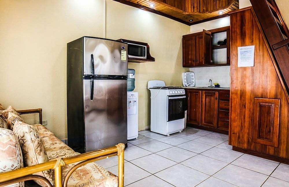 -the property claims a kitchenette, and although the cabinets are loaded with pans, there is mo stove, and the microwave would not pop a bag of popcorn.