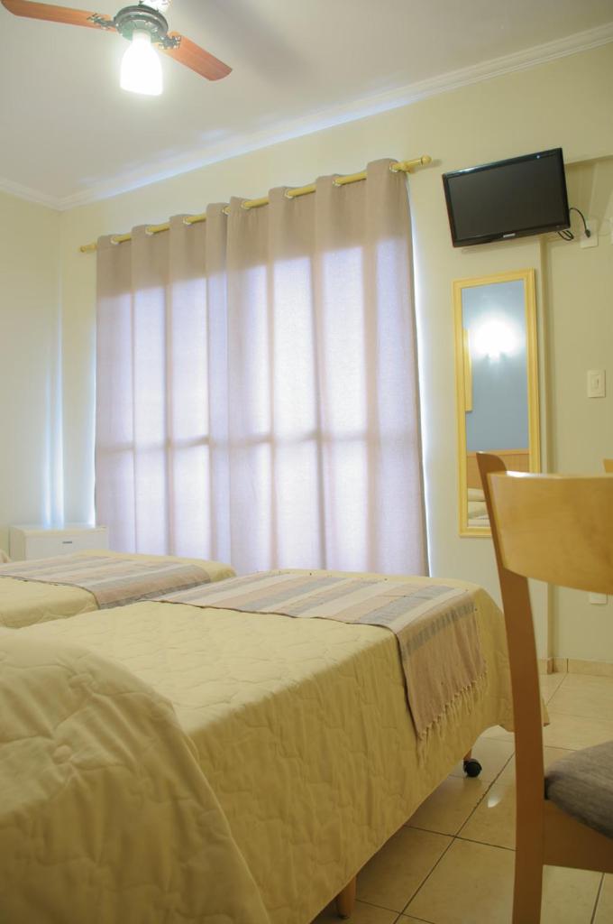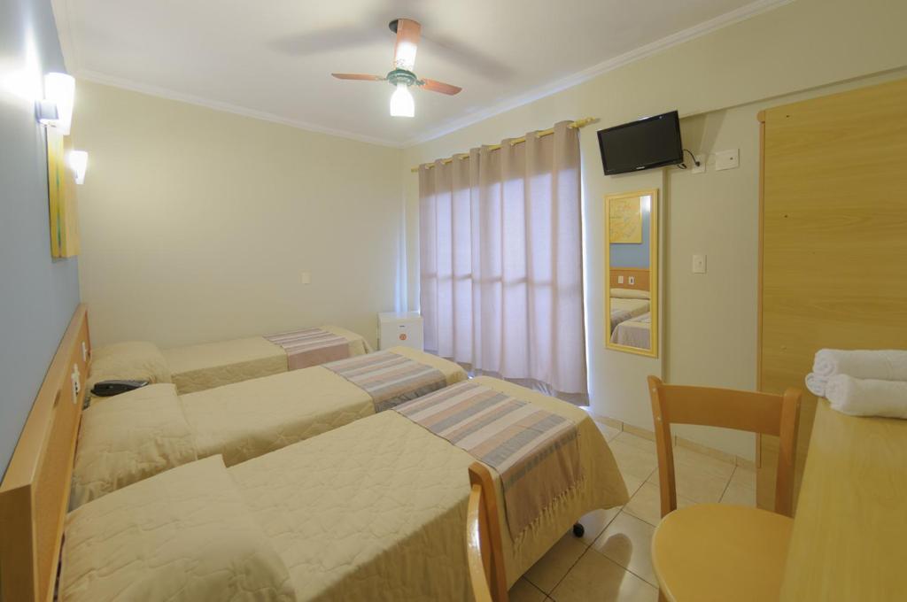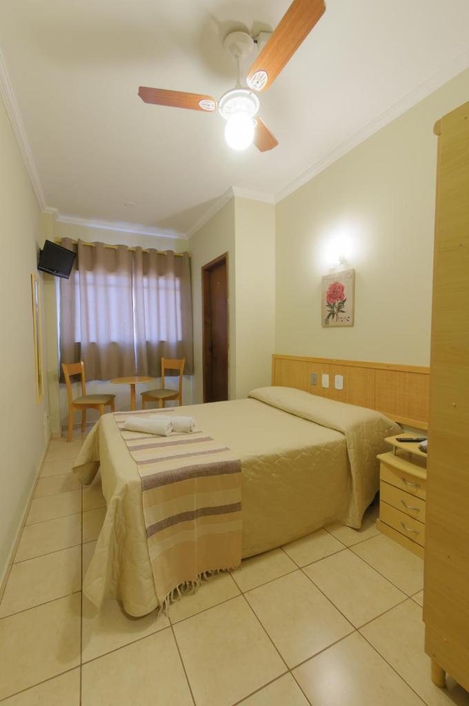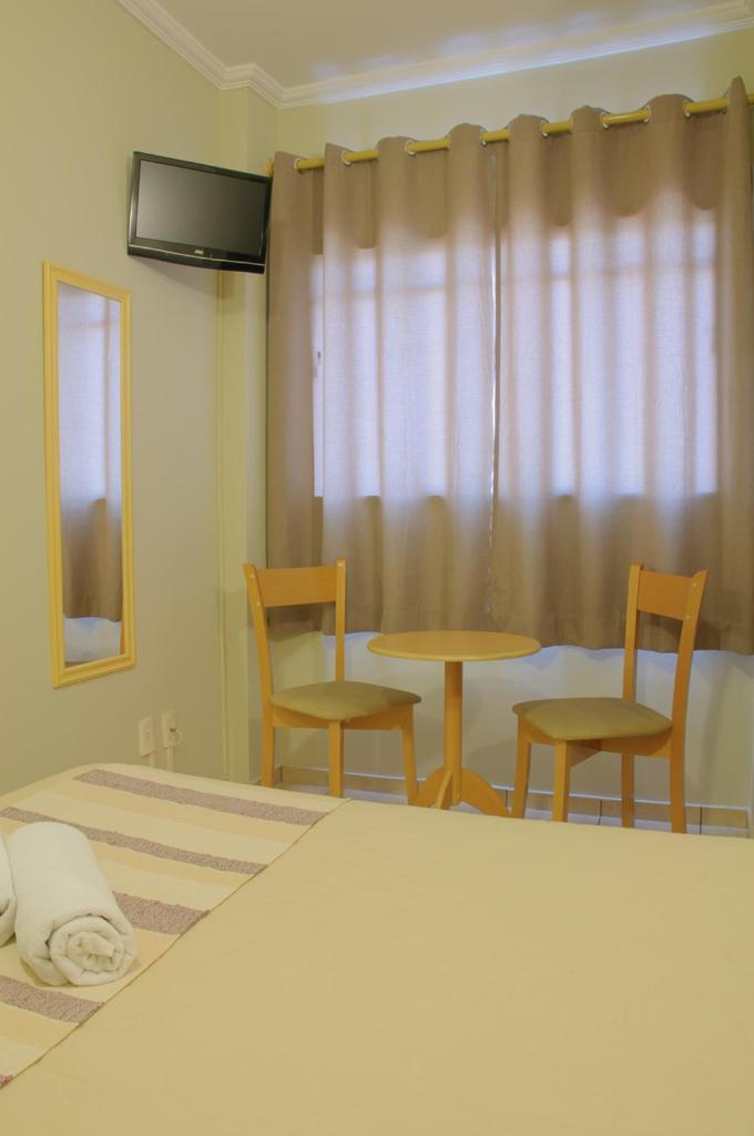 Quarto pequeno, sem ar condicionado, ou seja, quarto quente. O sanitário muito pequeno, sendo que de um lado tem a parede e do outro o BOX, ficando muito apertado para fazer o número 2. Pessoas obesas ou um pouco acima do peso, não vão conseguir sentar no vazo sanitário, pelo quarto que fiquei. A televisão, sacada e cama muito boa. Armário de roupas pequeno. O ponto negativo mesmo é o vaso sanitário e o BOX que não fechava direito e tomando banho, vazando água para o banheiro inteiro. Resumindo: Quem procura custo benefício, local excelente. Quem procura um pouco mais de conforto, não indico o hotel.