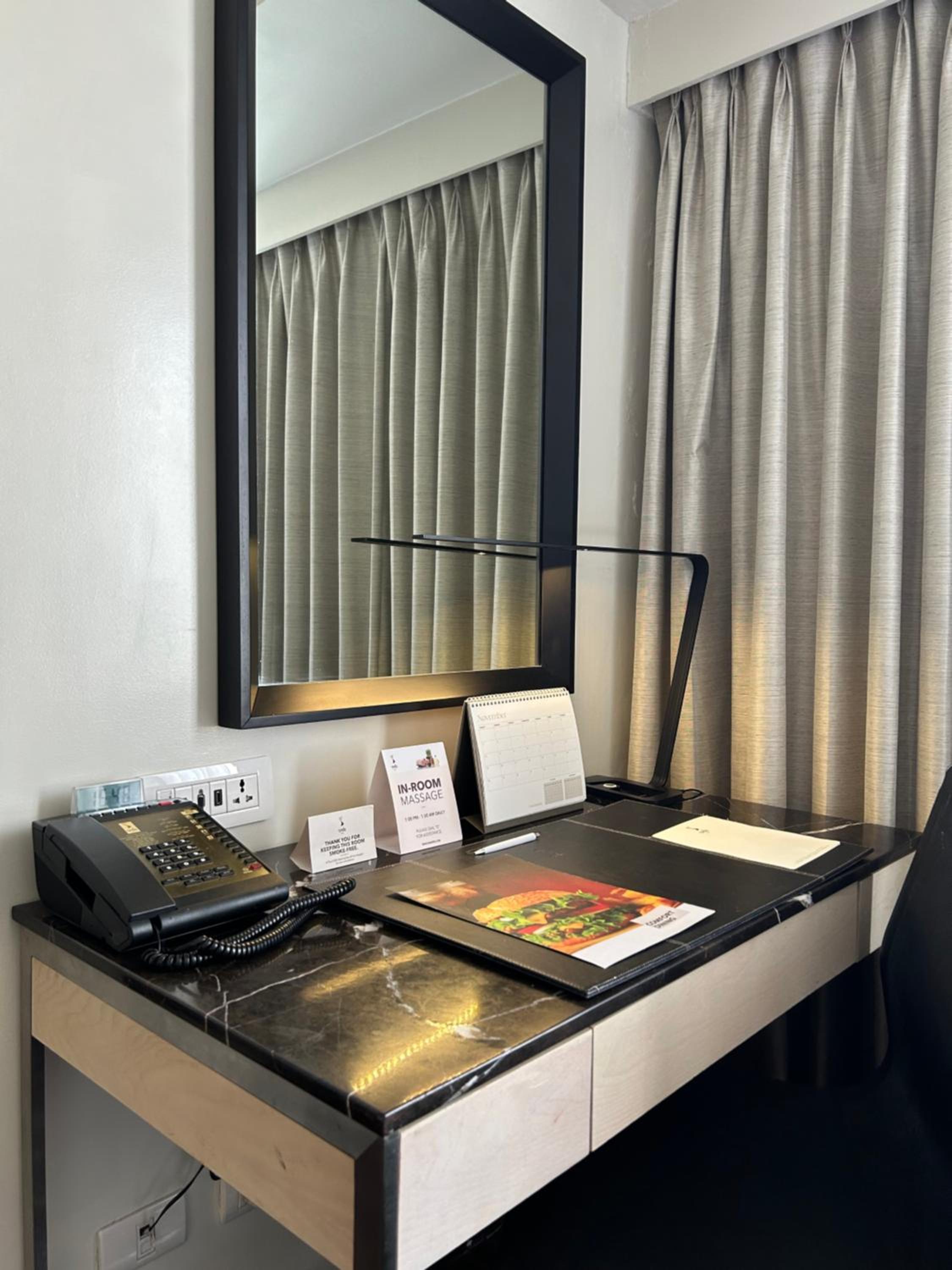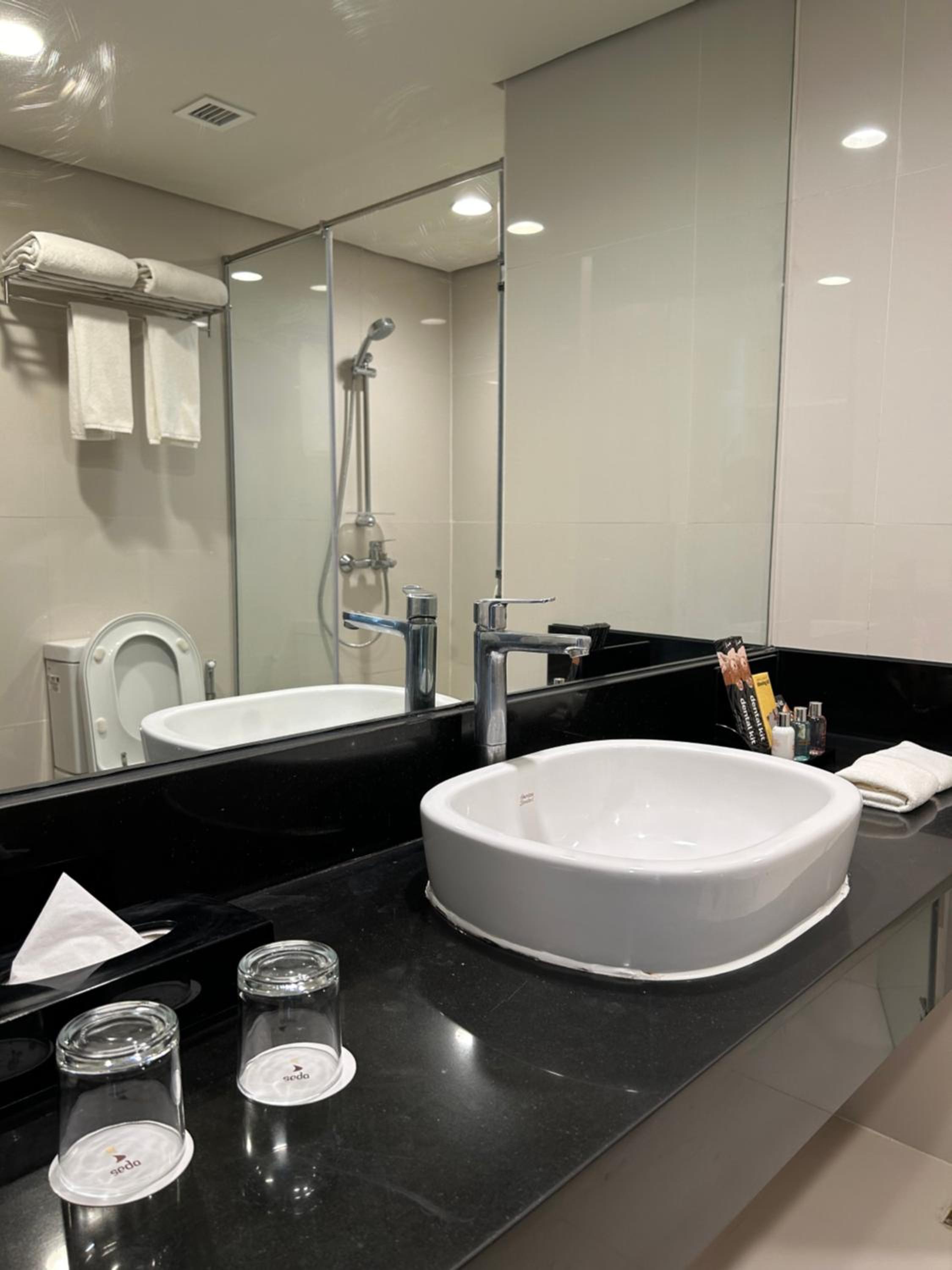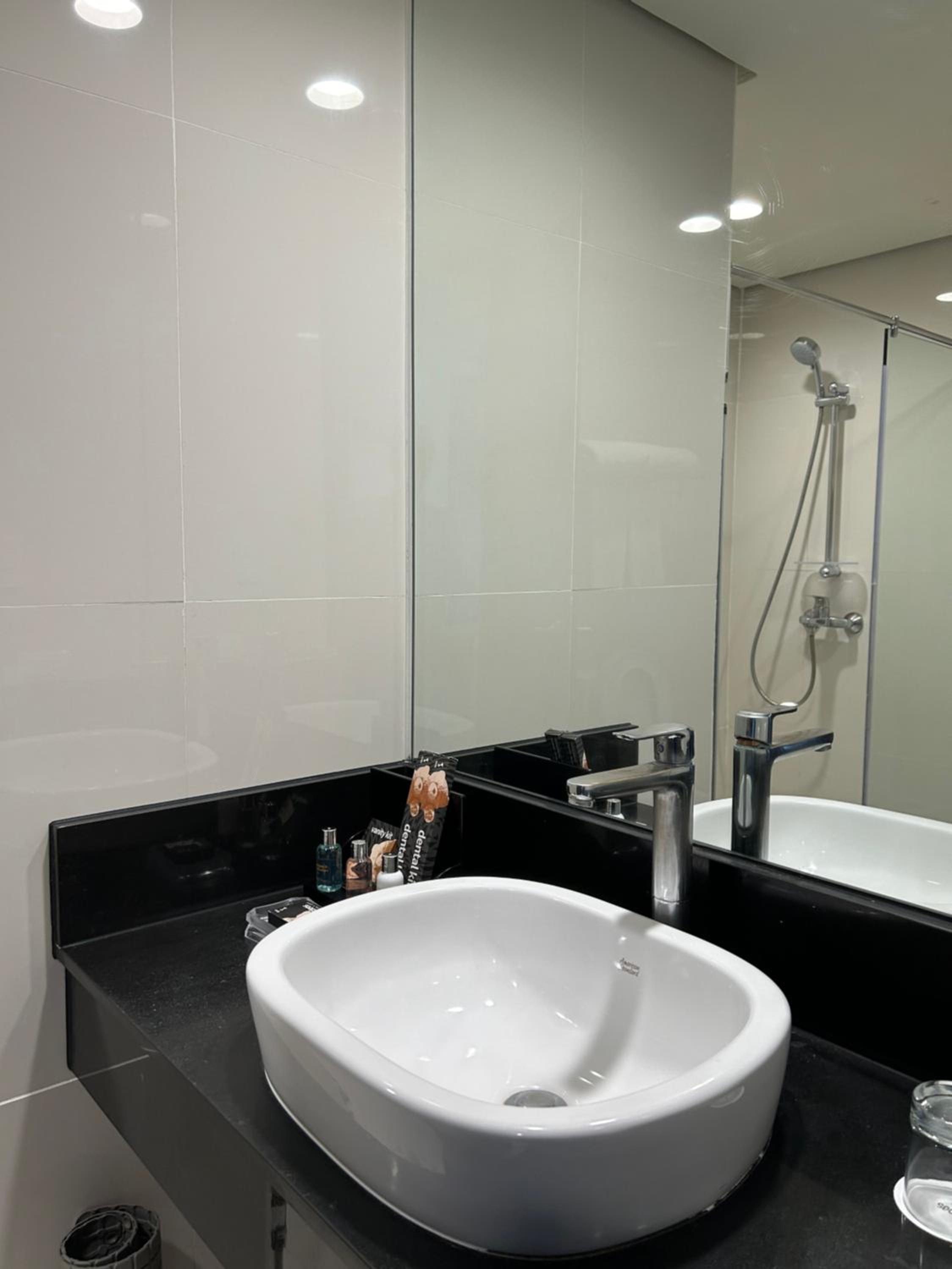 It looks like there was no "exhaust thingy" in the shower such that mist covered the wall mirror after a bath. Twice I called front desk to ask something but it took quite sometime for someone to pick up the call