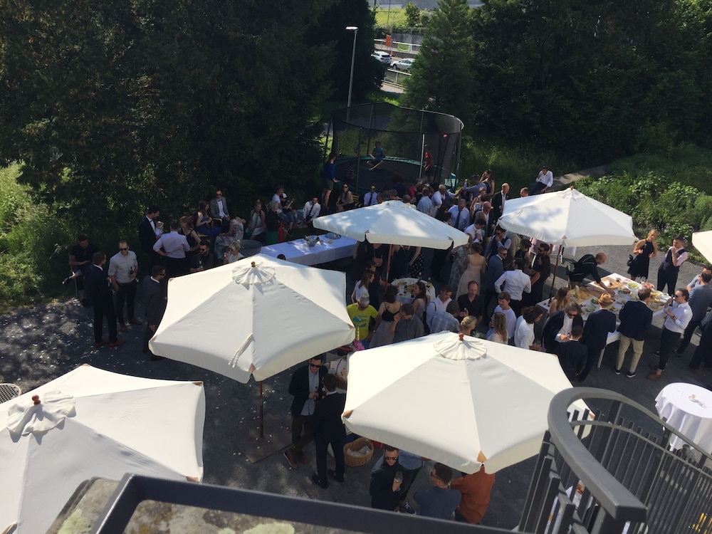 A parking area is available for guests. The small and atypical hotel is very close to a green park good for a walk /run. There is an area to stay outside for a drink in the good season; restaurant , bar and this exterior are shared with people not guest if the hotel. Room are simple and neat, quite basic and old in their forniture. I had no desk , chair and tv in my room, but they offer I pad at the reception and there is a Bose sound system in the room. I took a salad for dinner, maybe too dressed but good; with two glasses of wine about 42chf. The reception is a desk within the restaurant/bar