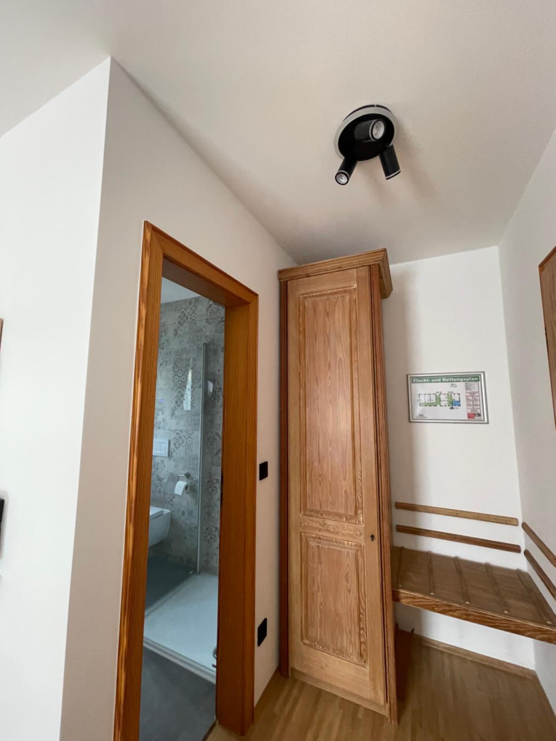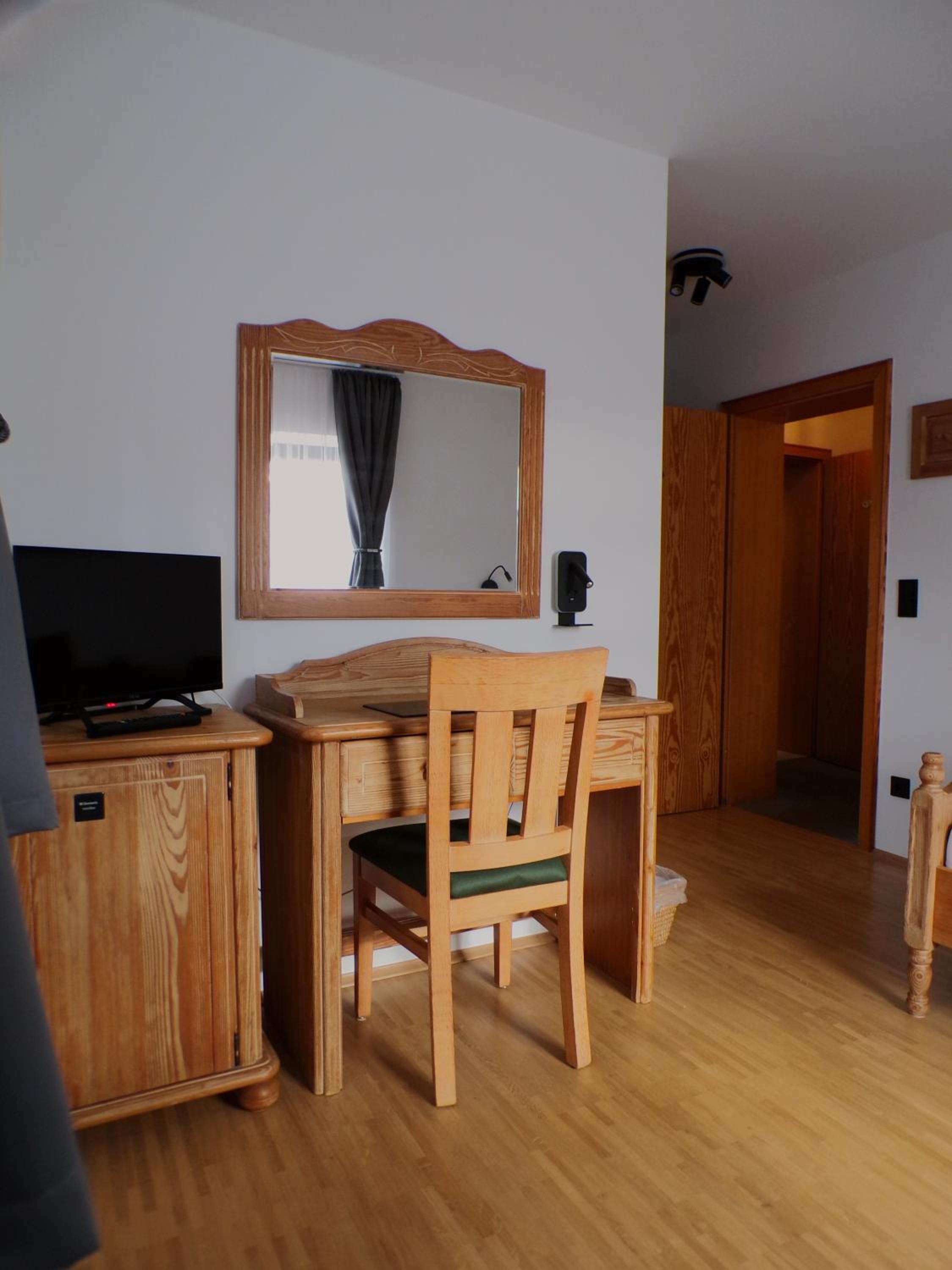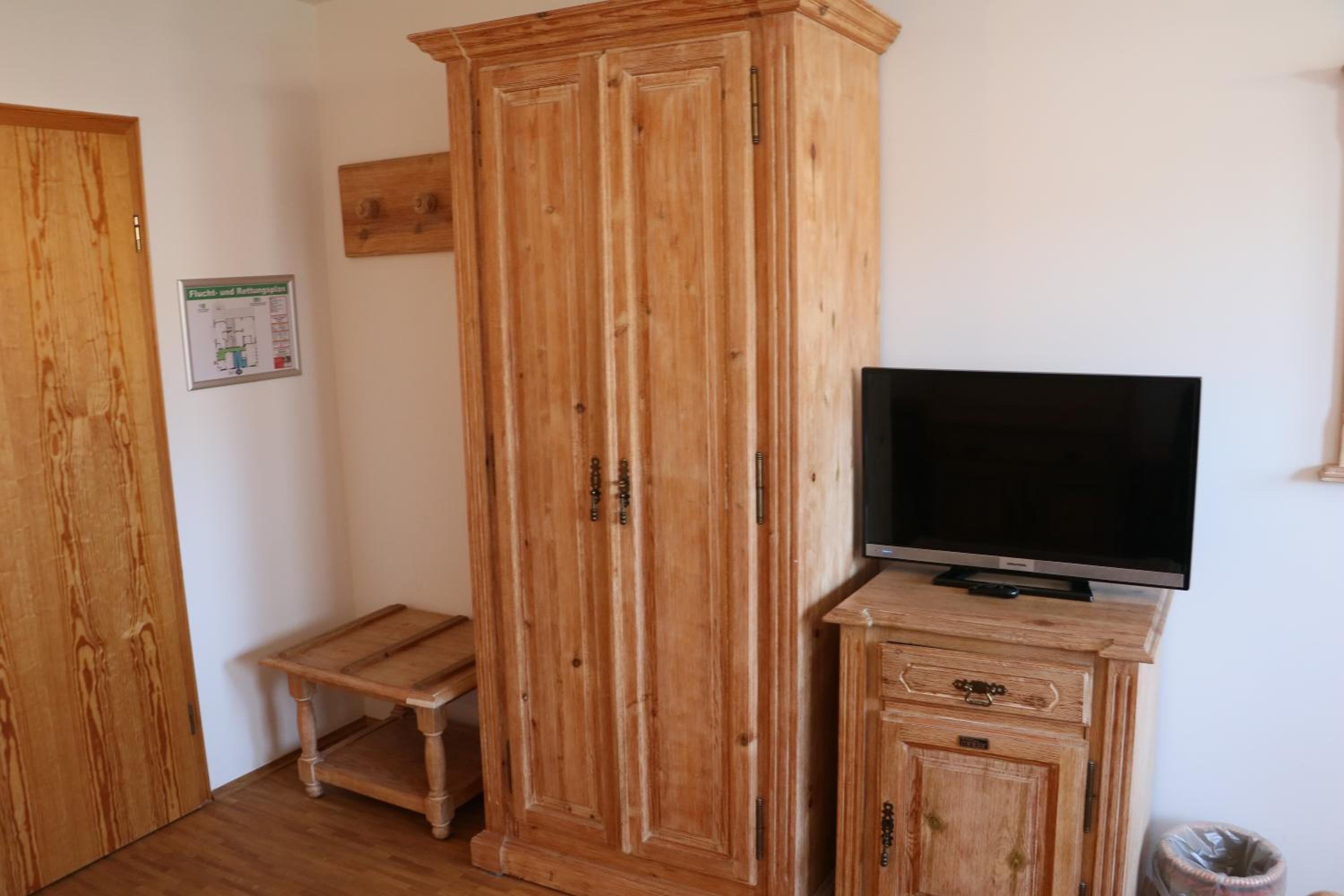 Gewissermaßen fast ein wenig alpenländisch inspiriert. Ein echter Schreibtisch fehlt leider. Kleiner Holzsekretär ließ sich nicht öffnen. Ebenfalls etwas schwerfällige Holztüren beim Kleiderschrank. Offene Kleiderstange im Raum wäre als Ergänzung hilfreich. Kostenfreies Mineralwasser war im Zimmer nicht vorhanden. 32-Zoll-Grundig-TV auf Beistellschrank. Die modernen Fenster lassen sich vollständig verdunkeln.