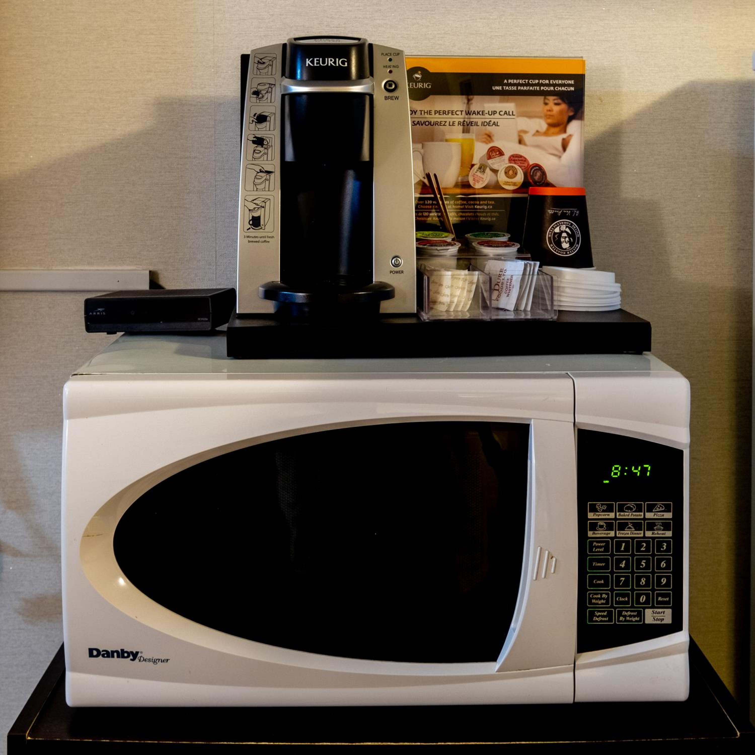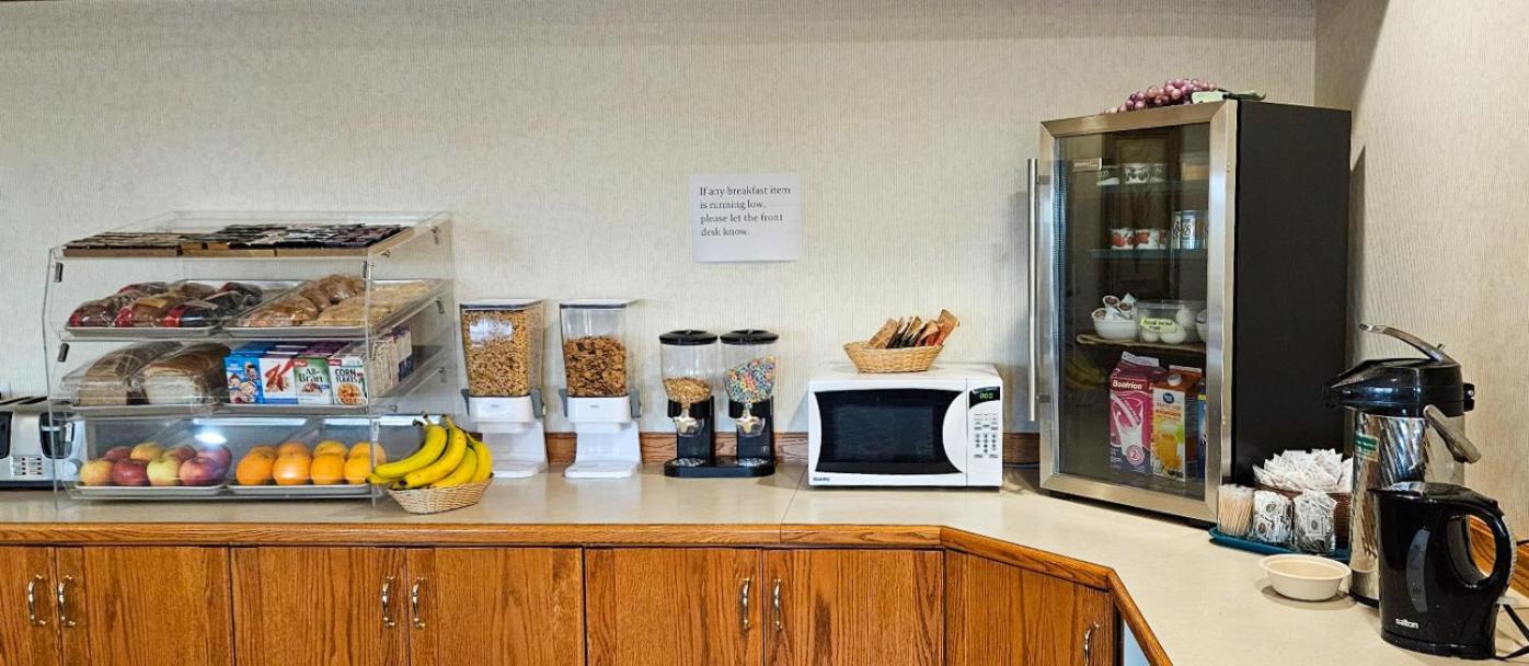 The room was clean and in very new like condition. The breakfast was excellent with scrambled eggs, sausages, yogurt, waffle maker, etc. Etc. Coffee maker in room along with a fridge and microwave. Friendly helpful staff.