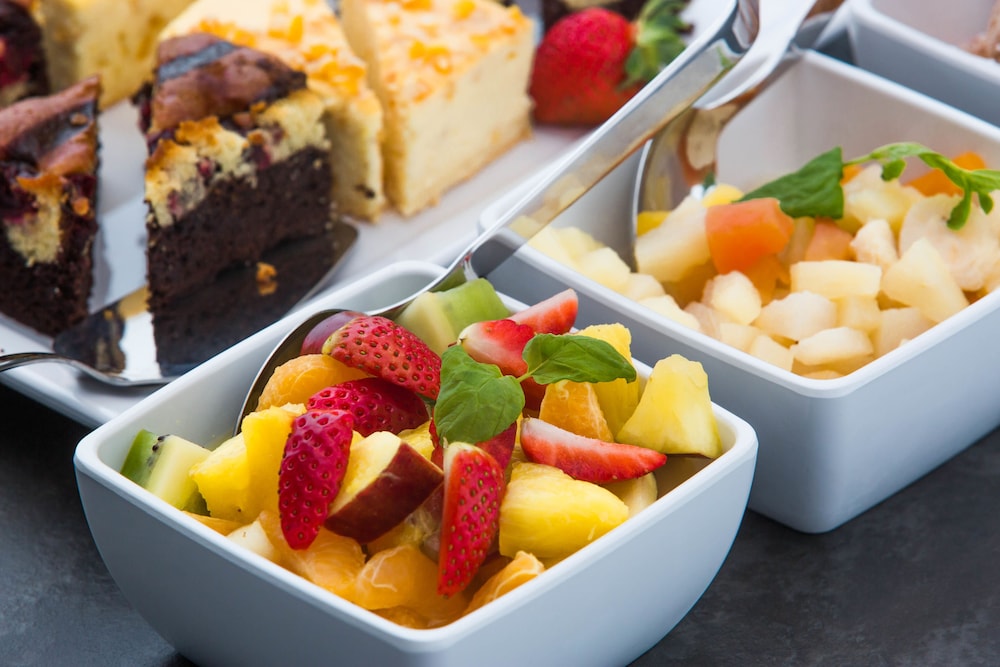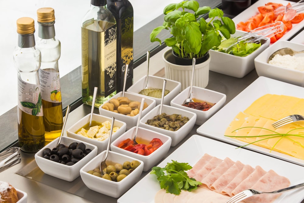 Great breakfast with a variety of selections, including fresh fruits, cheeses and sausages.