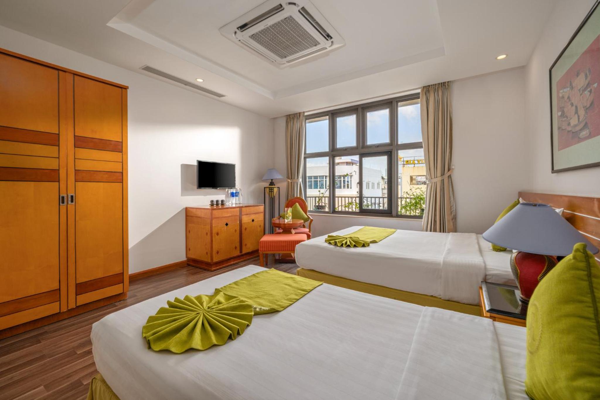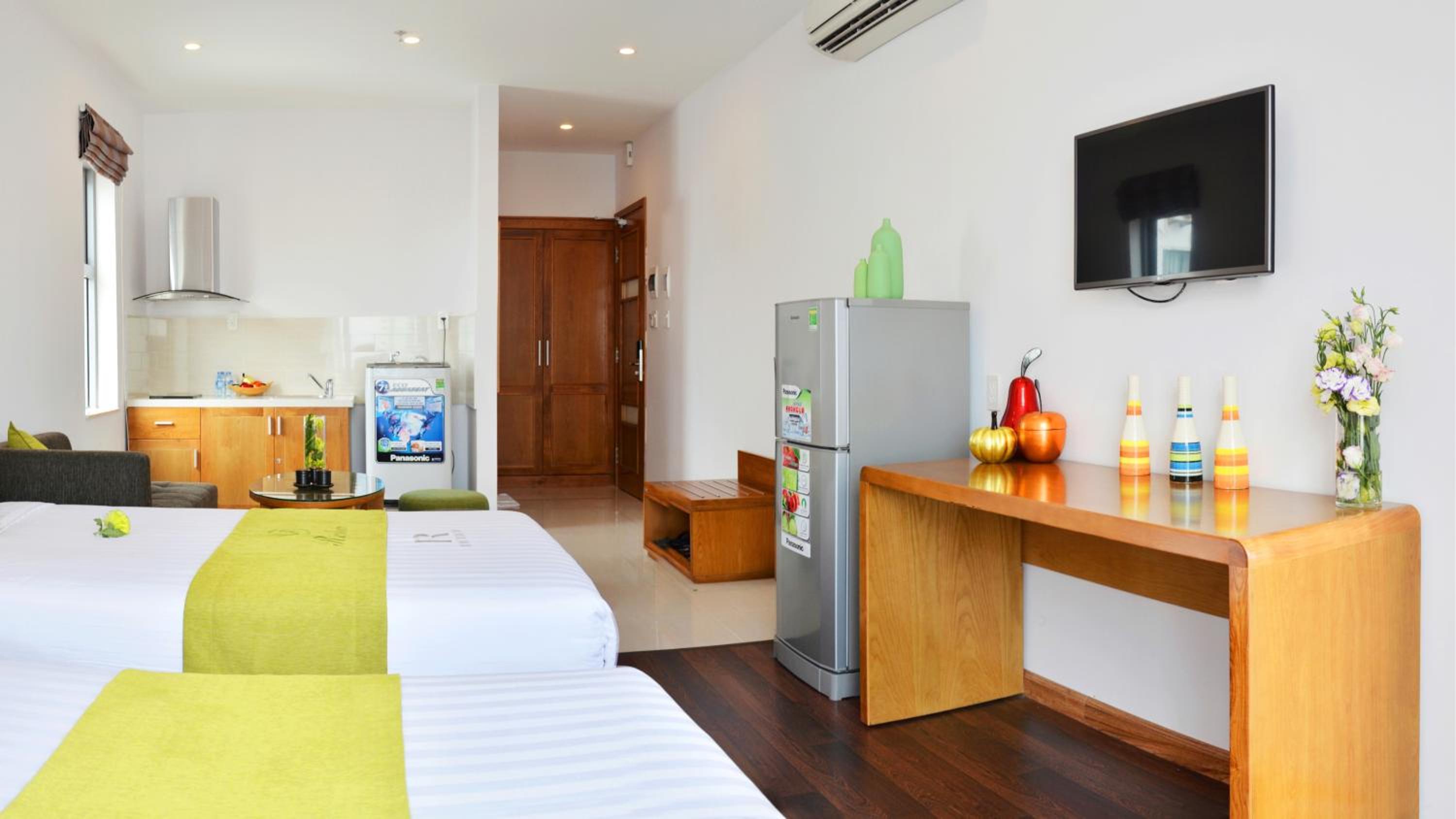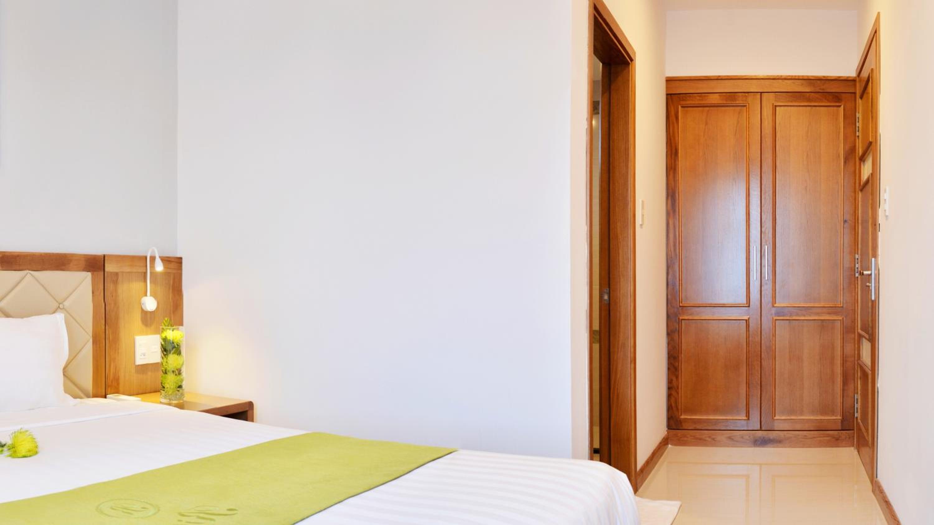 The room was quite spacious and well maintained. Room service made sure to clean everyday. The view from balcony was nice and it was windy. Its not sea view the beach is to the right from the balcony but that was expected from the pics we saw. The location is perfect right next to the Dnang beach. Beds were comfortable but please note as mentioned there are 3 beds and 2 bedrooms the third bed is in the living room itslef so it doesnt come with a door.