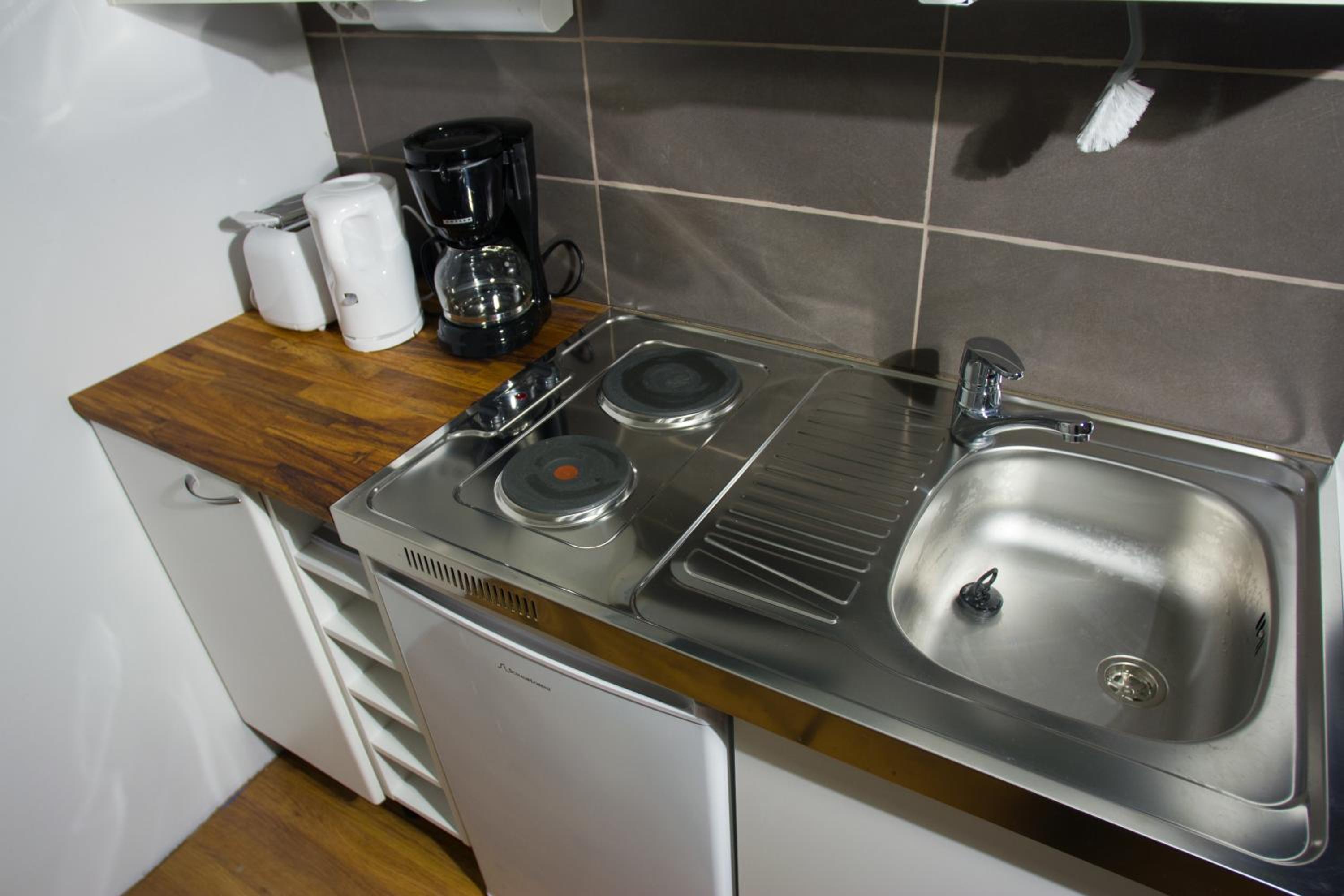 Camera pulita,completa di tutto: forno a microonde, frigorifero, bollitore x acqua e caffè,piastre elettriche x cucinare. Posizione tranquillissima