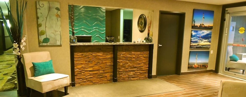 The property appears to have been built for the local oil boom that has now ended. The hotel has very few guests and is operated by a skeleton staff who are unable to provide customary services or expected level of maintenance. It is not clear whether this is a temporary condition or continuing state of decline. The listed dinner was not offered. The included breakfast (no longer) includes any hot items or other decent sources of protein (e.g., No hard boiled eggs). The property’s automated entry doors no longer function, and in our room the bedside lamp and soap dispenser in the shower did not work. WiFi was enabled by a router sitting on a chair in the hallway. Front desk staff were largely absent and replaced by a sign advising one to phone the number indicated, with no phone provided with which to do so. It has been a long time since I have stayed in a hotel where the toilet had a seat but no closable lid.