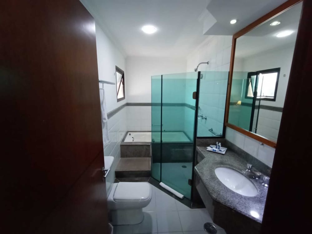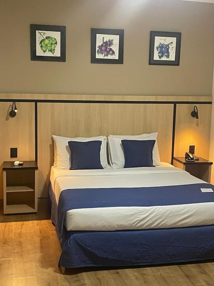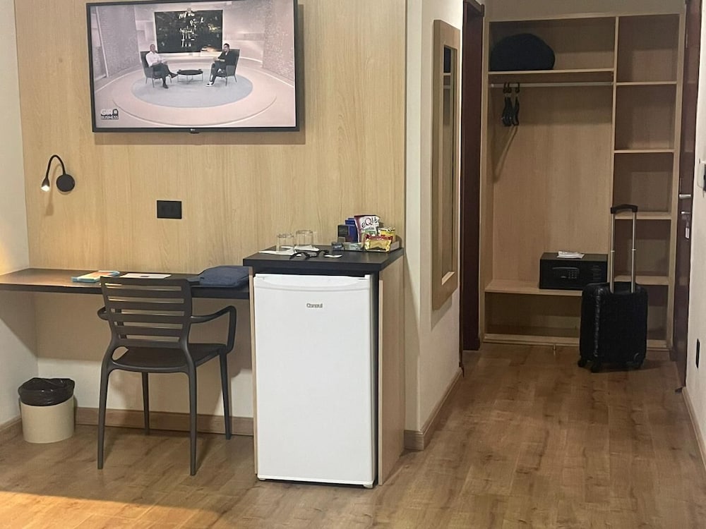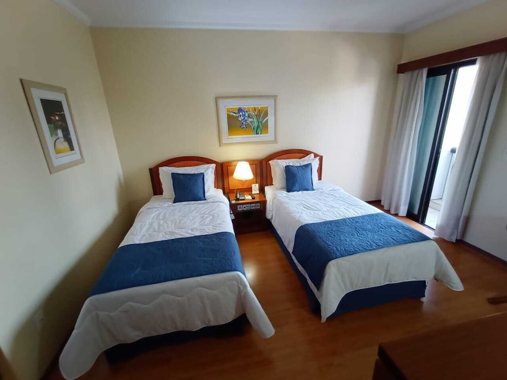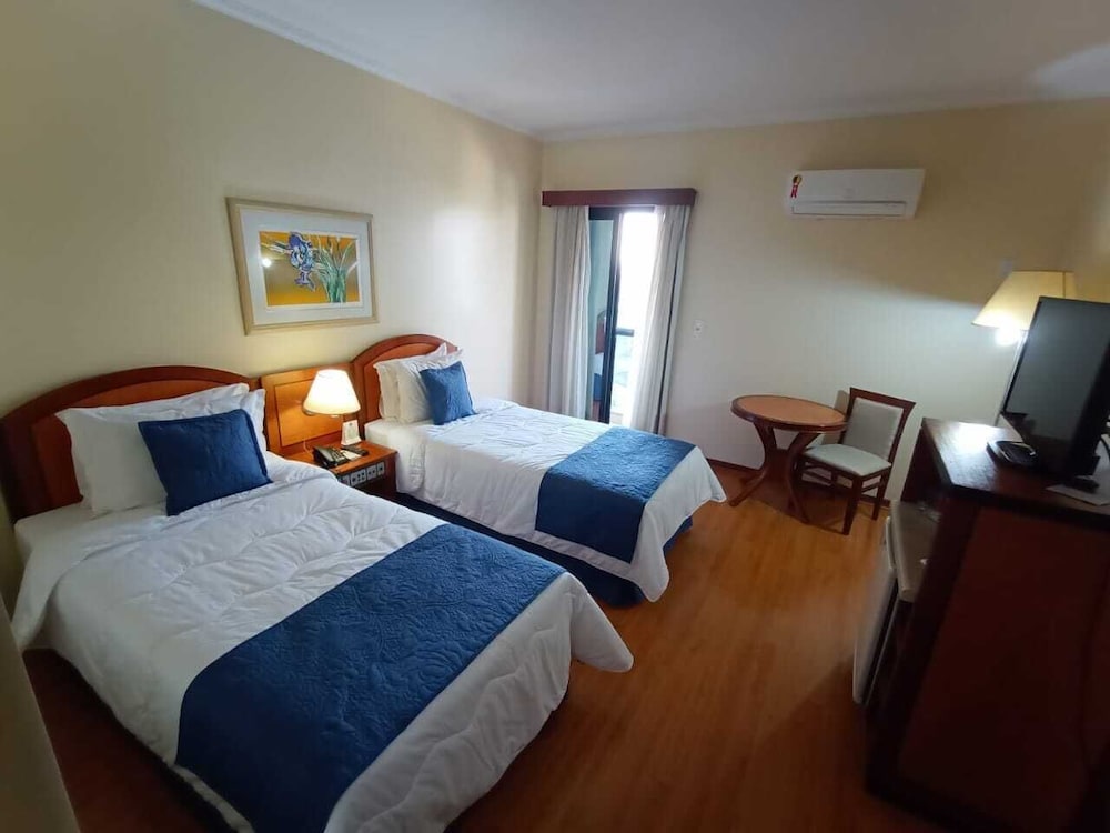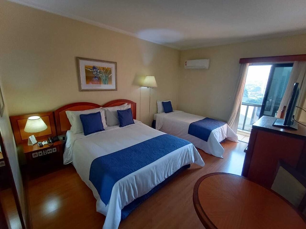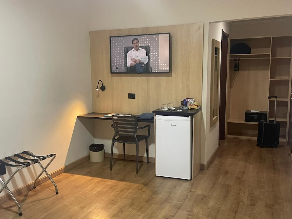 Paredes precisando de uma pintura nova, tanto no quarto qto no banheiro tbm. Poeira acumulada nas paredes, parece que não se tem uma limpeza mais pesada faz um tempo, passei a mão ficou suja de tanto pó. Cortina não sei se era cinza ou se estava suja mesmo pq mancha tinha de monte, e arrebentada. Traças penduradas na cortina e na parede. Vidro sujo da porta da varanda. Bituca de cigarro na varanda. Tv não sintonizada muitos canais, tv globo saia e voltava direto. No banheiro somente condicionador não tinha shampoo. Boa localização e o café da manhã com bastante variedade, equipe atenciosa. Piscina com teto de vidro no dia estava chuvoso, tinha goteira por toda parte da piscina, desagradável gotas caindo em cima das pessoas. Estacionamento terceirizado cobrado a parte R$ 20,00 e vagas apertadas com manobrista sendo necessário deixar a chave, ponto negativo.