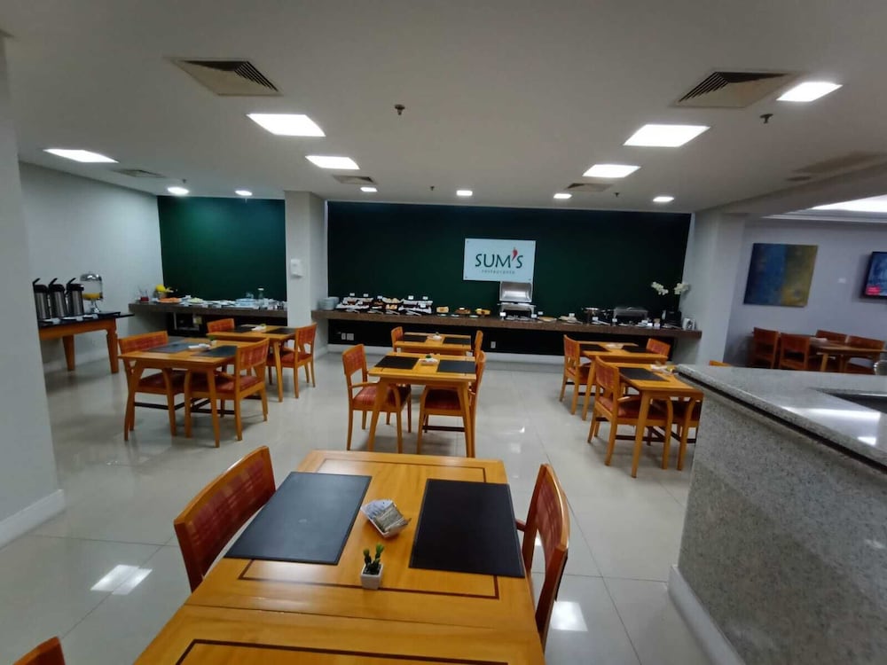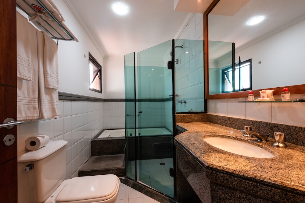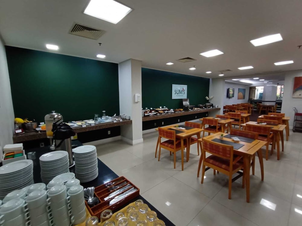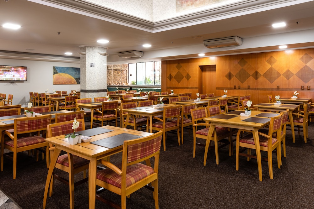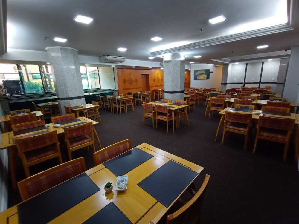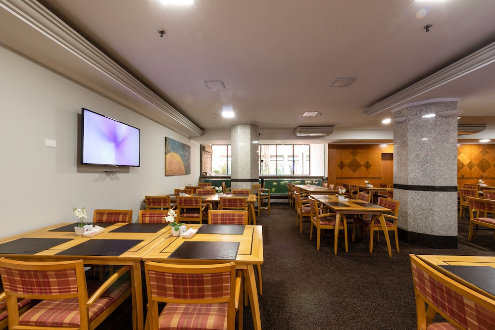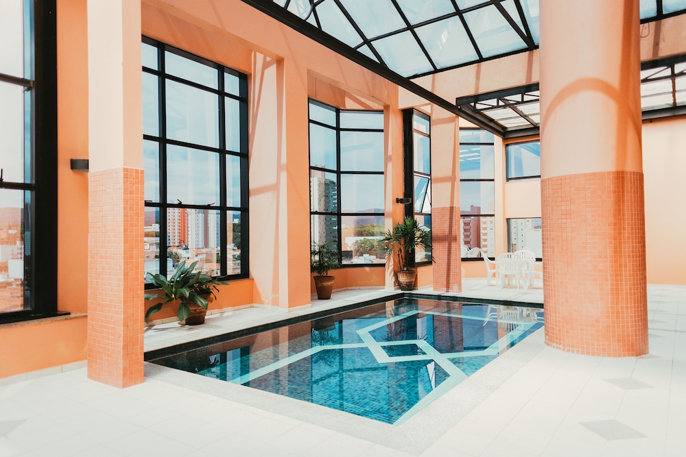Paredes precisando de uma pintura nova, tanto no quarto qto no banheiro tbm. Poeira acumulada nas paredes, parece que não se tem uma limpeza mais pesada faz um tempo, passei a mão ficou suja de tanto pó. Cortina não sei se era cinza ou se estava suja mesmo pq mancha tinha de monte, e arrebentada. Traças penduradas na cortina e na parede. Vidro sujo da porta da varanda. Bituca de cigarro na varanda. Tv não sintonizada muitos canais, tv globo saia e voltava direto. No banheiro somente condicionador não tinha shampoo. Boa localização e o café da manhã com bastante variedade, equipe atenciosa. Piscina com teto de vidro no dia estava chuvoso, tinha goteira por toda parte da piscina, desagradável gotas caindo em cima das pessoas. Estacionamento terceirizado cobrado a parte R$ 20,00 e vagas apertadas com manobrista sendo necessário deixar a chave, ponto negativo.