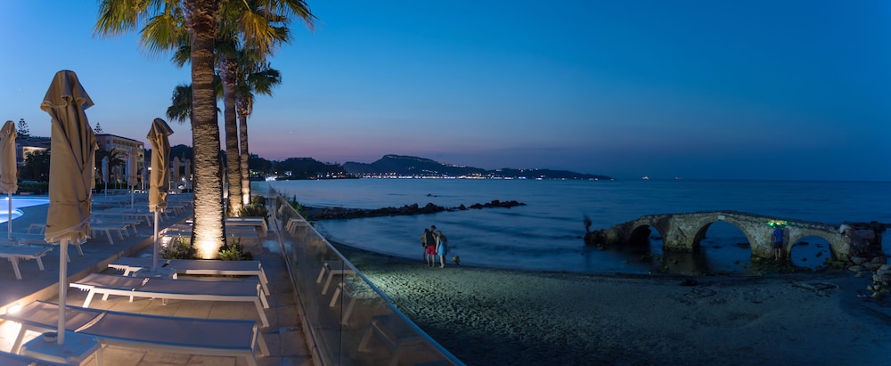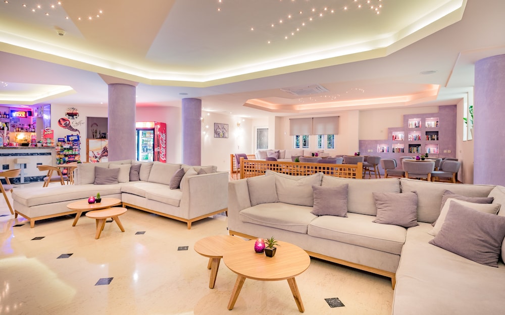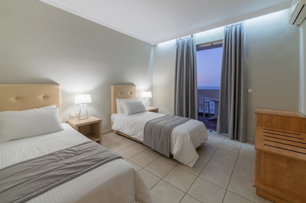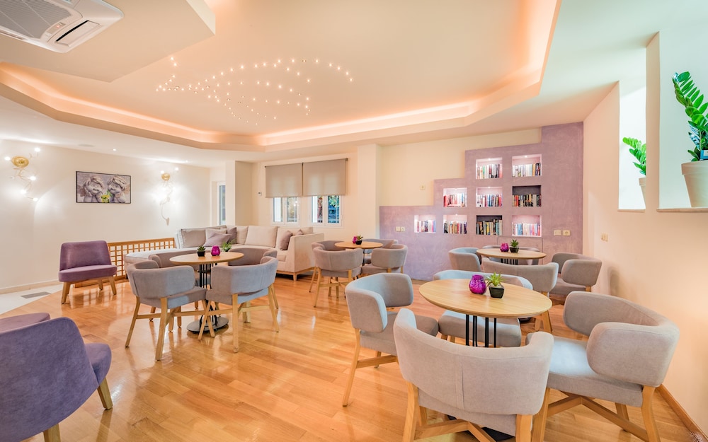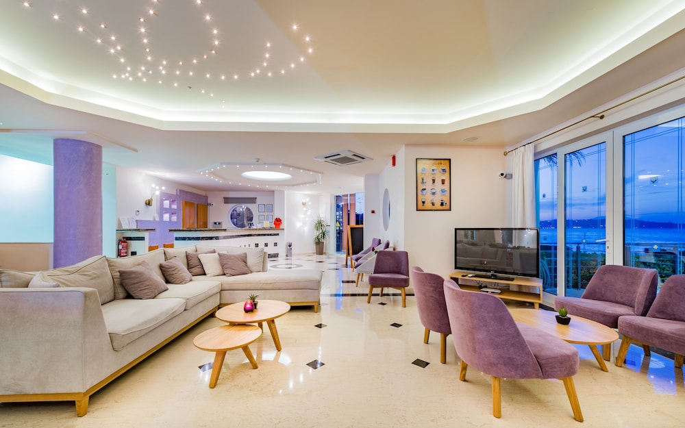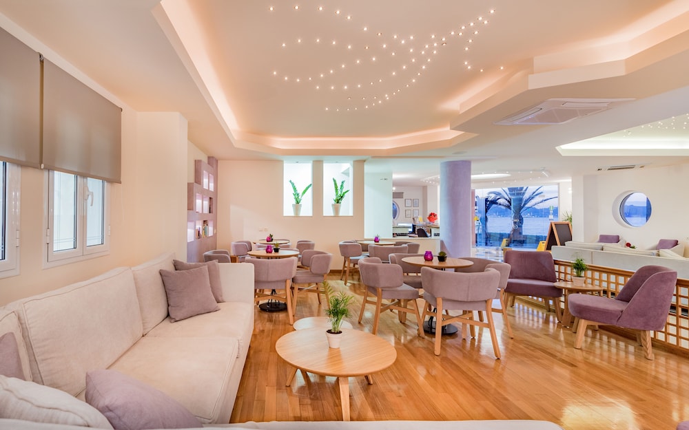 Great location right on sea front. Near to local bars and tavernas but quiet. Very clean rooms. Bar serves great cocktails and meals and snacks all day. Reception area clean modern and comfortable. Would definitely return.