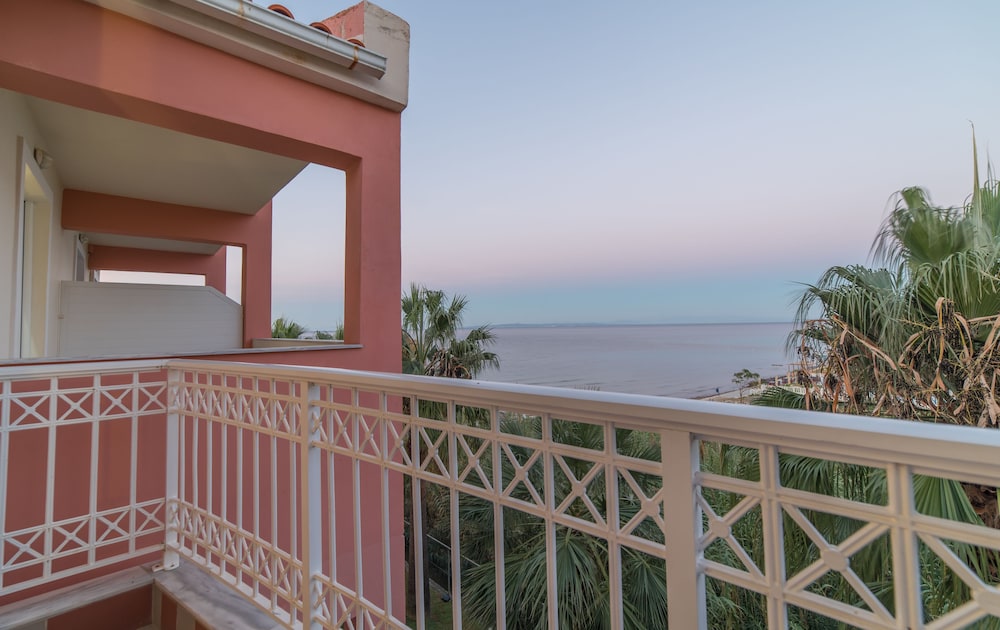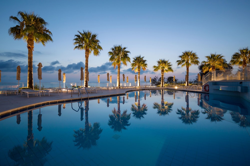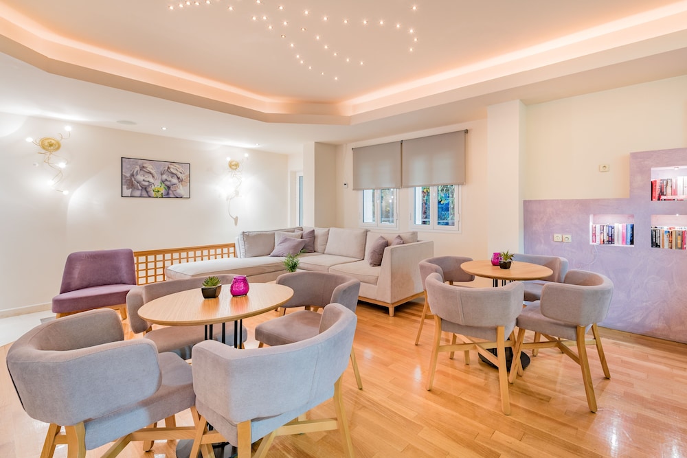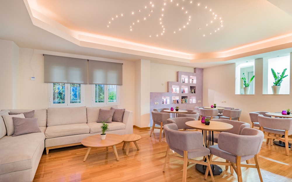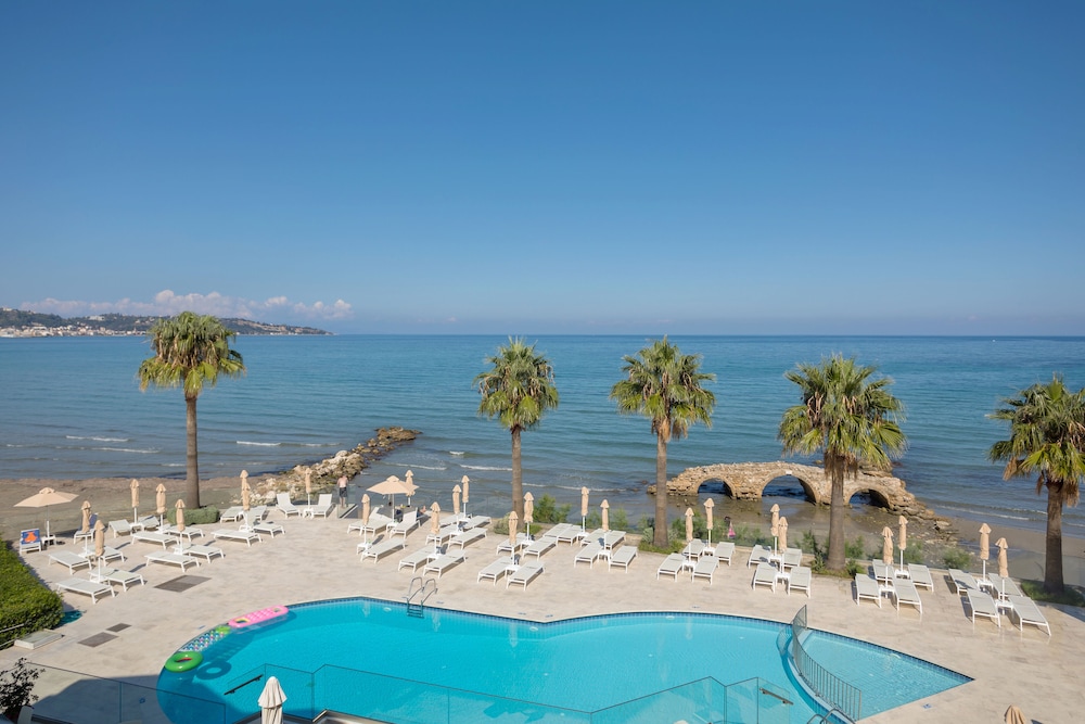 Great location right on sea front. Near to local bars and tavernas but quiet. Very clean rooms. Bar serves great cocktails and meals and snacks all day. Reception area clean modern and comfortable. Would definitely return.