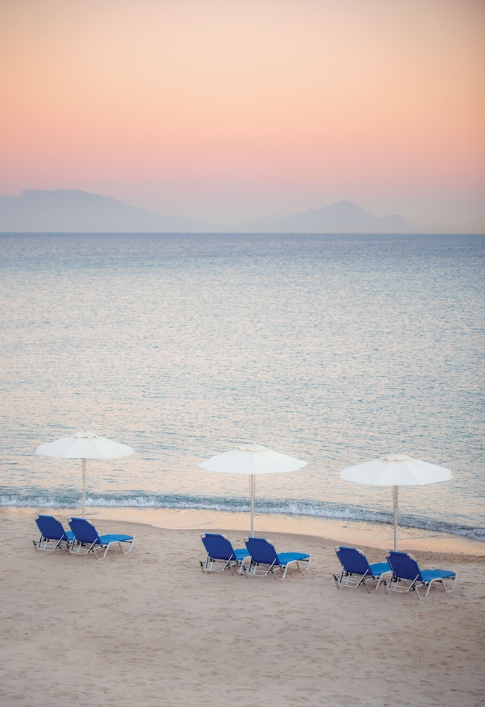 Beach, rught at the resort. Pebbles not sand. Honestly, from my perspective not very pleasant. OK to swim or snorkel in the sea. I personally highly enjoyed the pool areas.