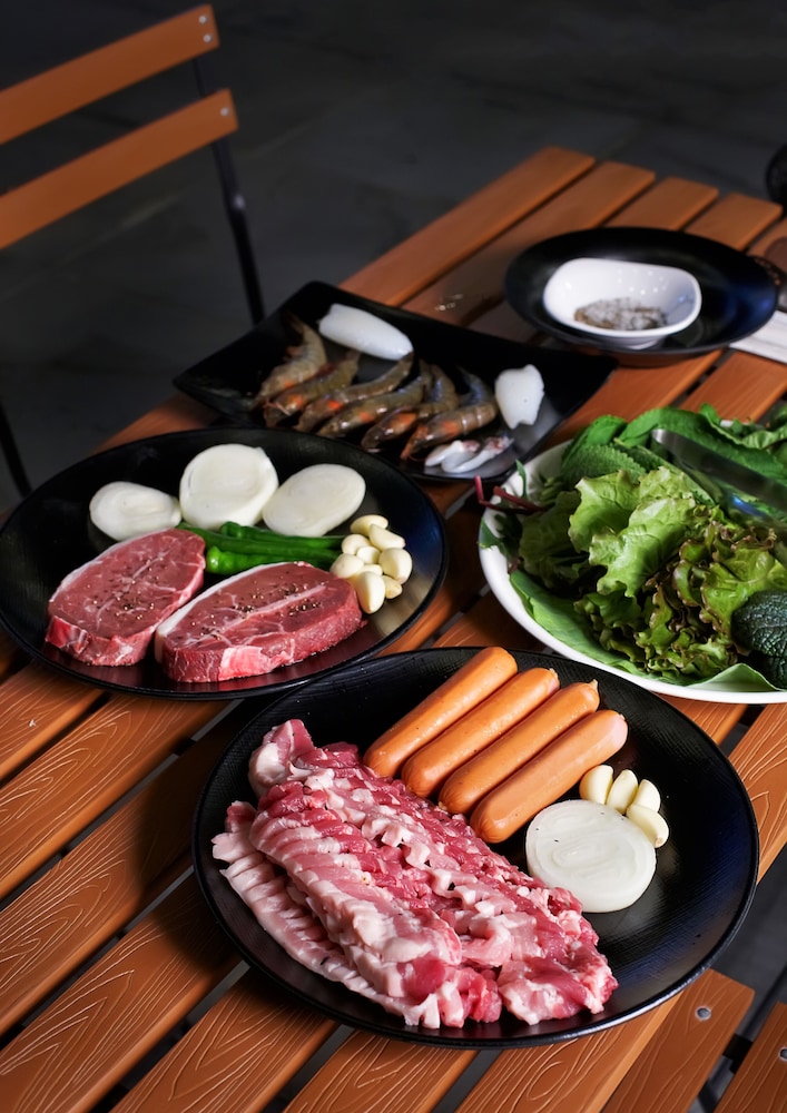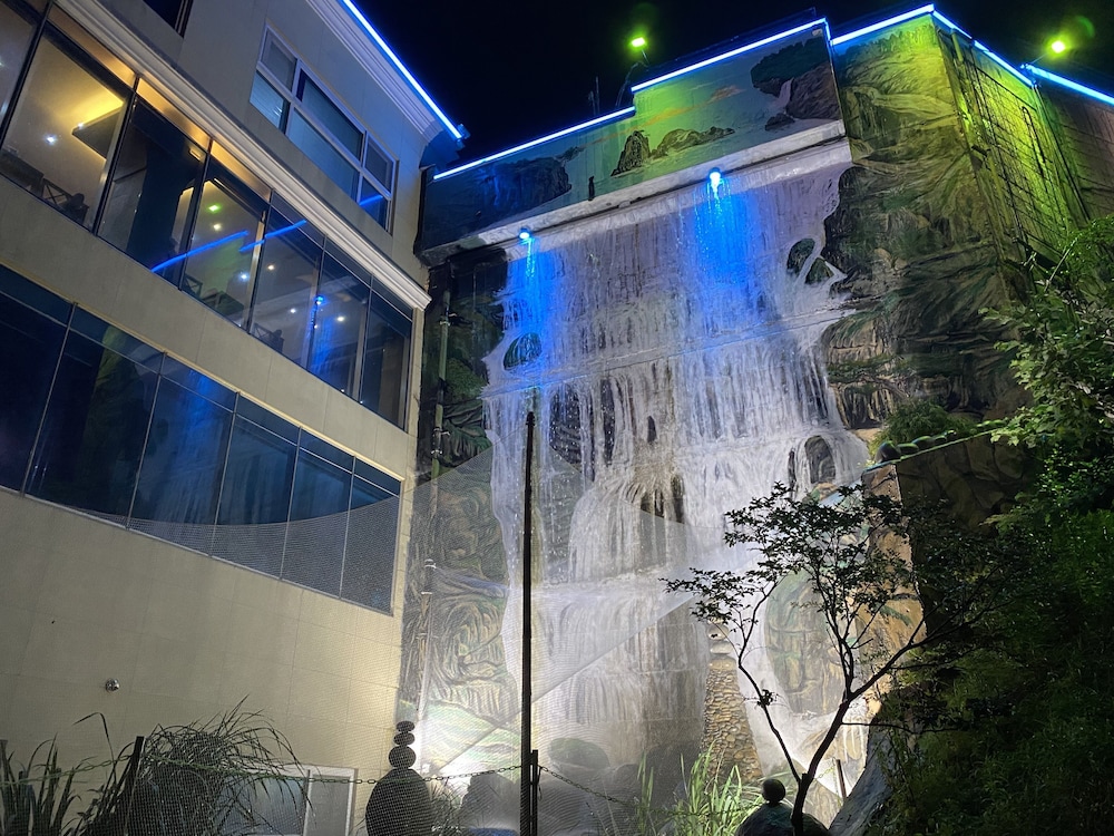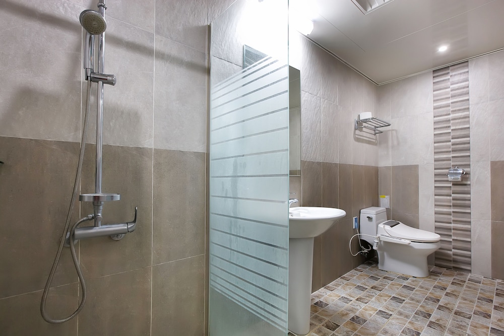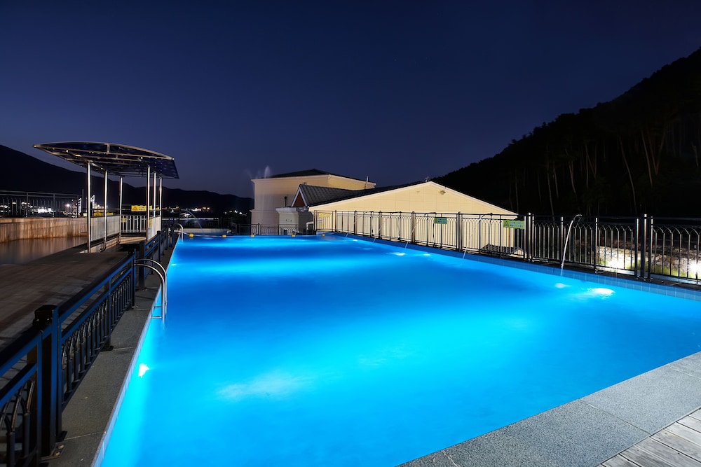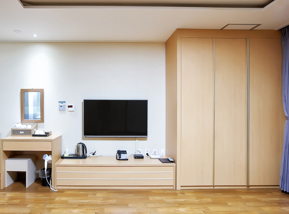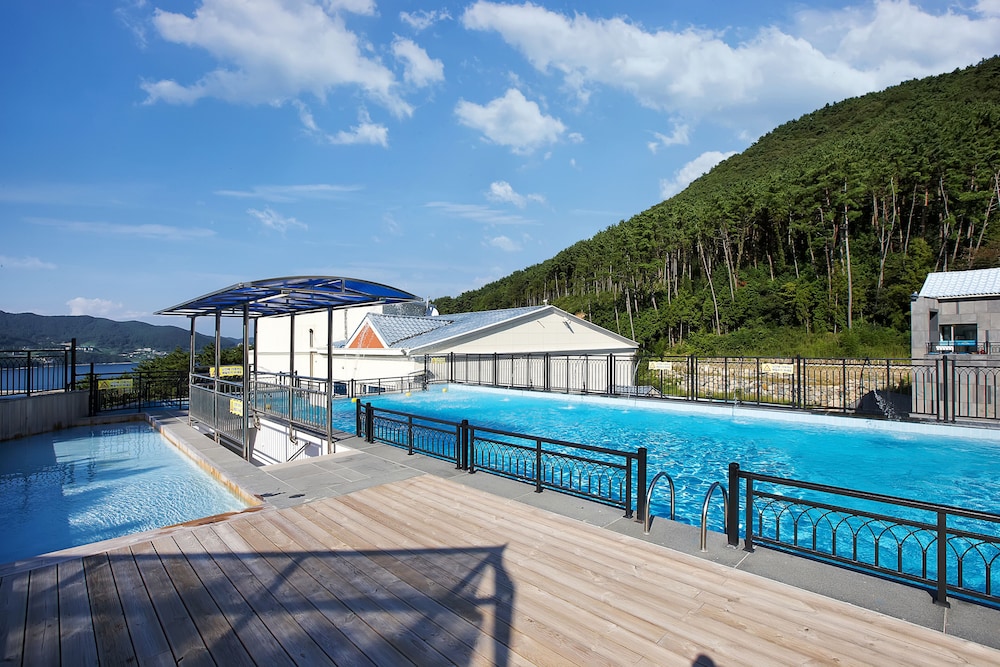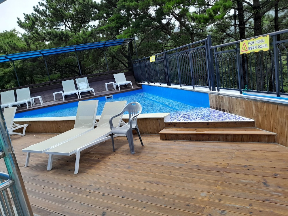 당초 예약했던 객실보다 업그레이드된 방에 배정받았어요 직원의 실수로~~그냥 쓰라고 해서 2박 3일동안 계속 썼어요 조식도 계속 준비됐고 (뷔페,갈비탕) 사먹으로 나가지 않아도 됐습니다 옥상에 풀장이 있어 아이들이 재밌게 물놀이 했습니다 가까이에 해수욕장이 3군데나 있어서 편리했습니다