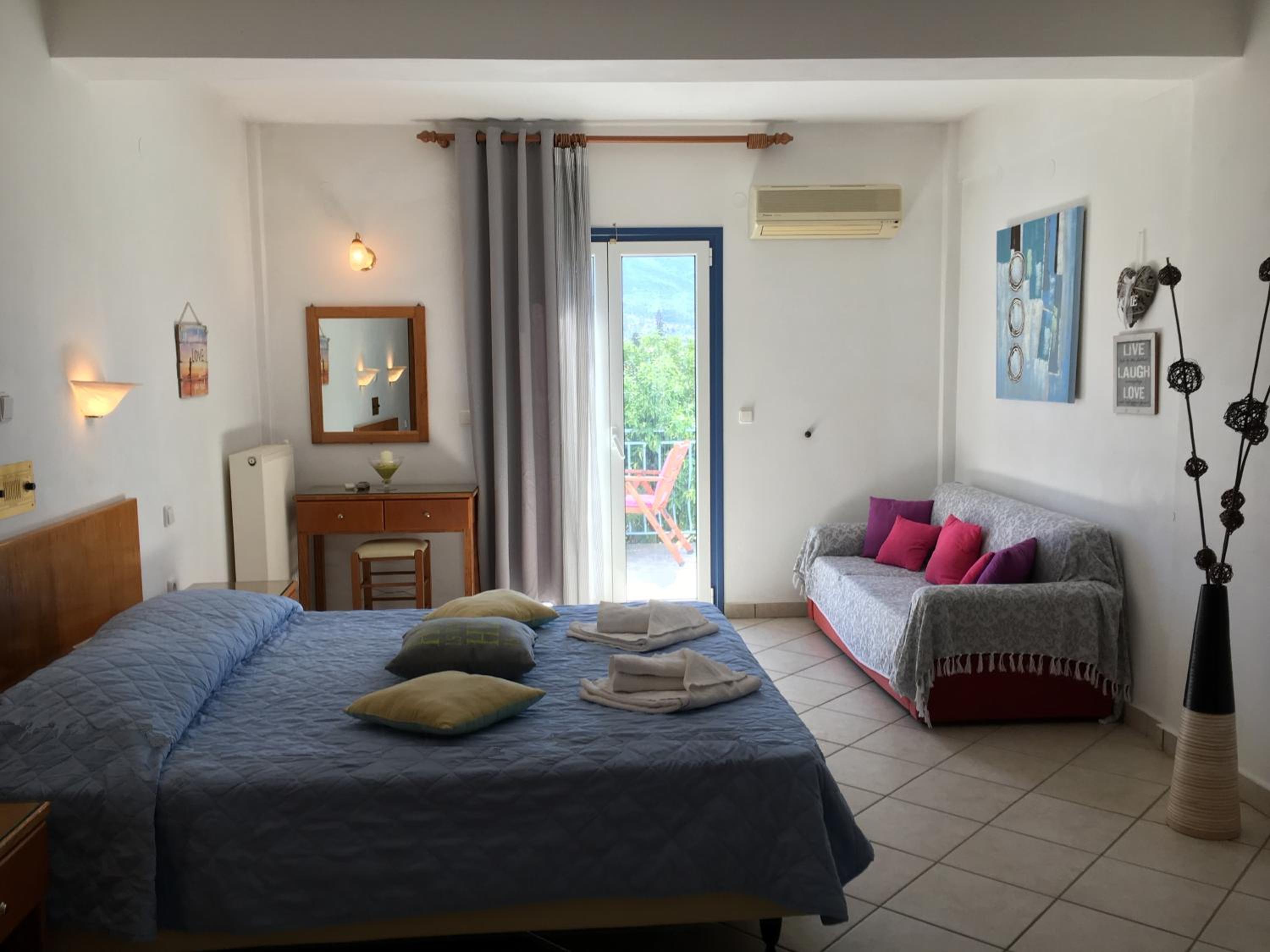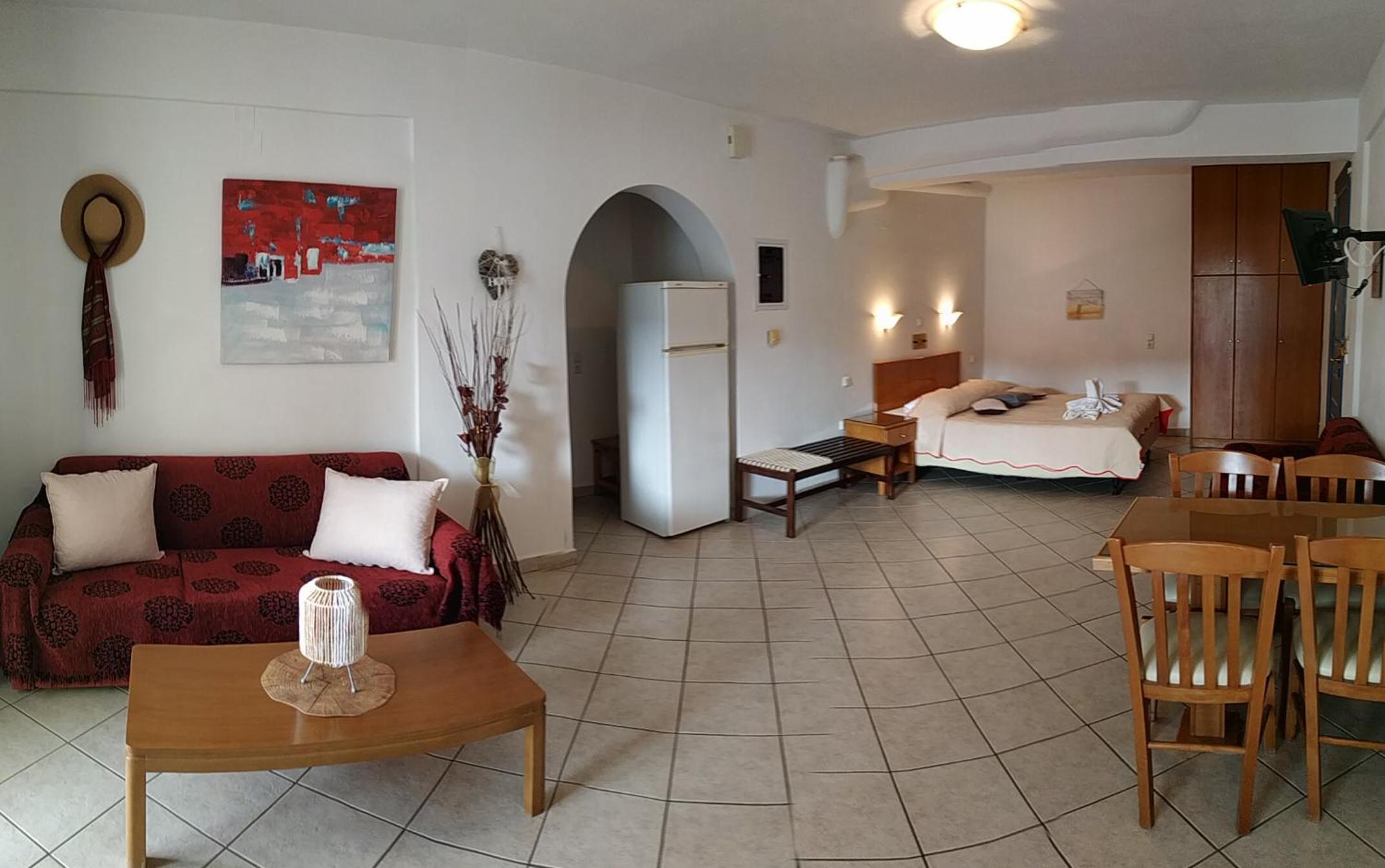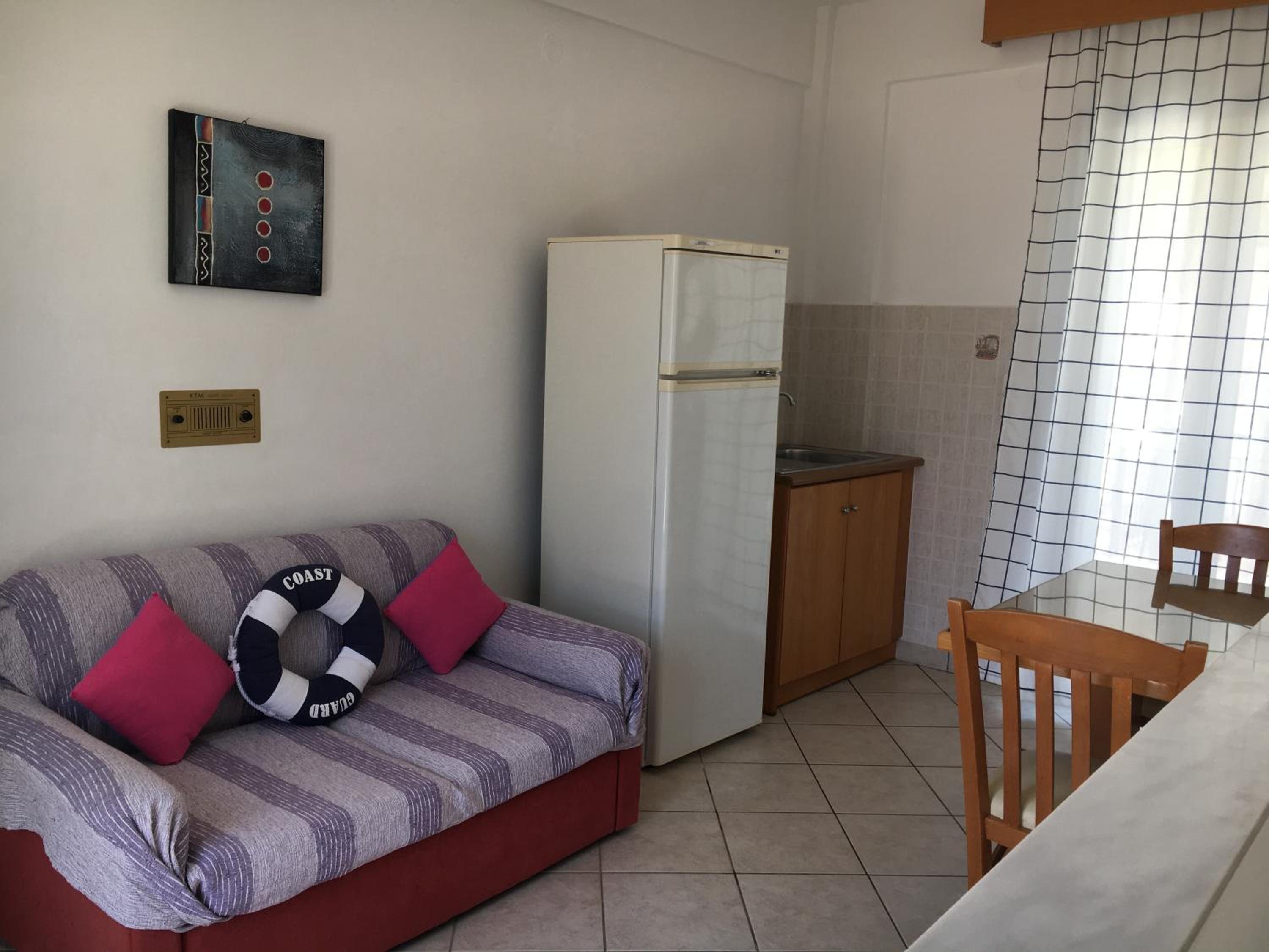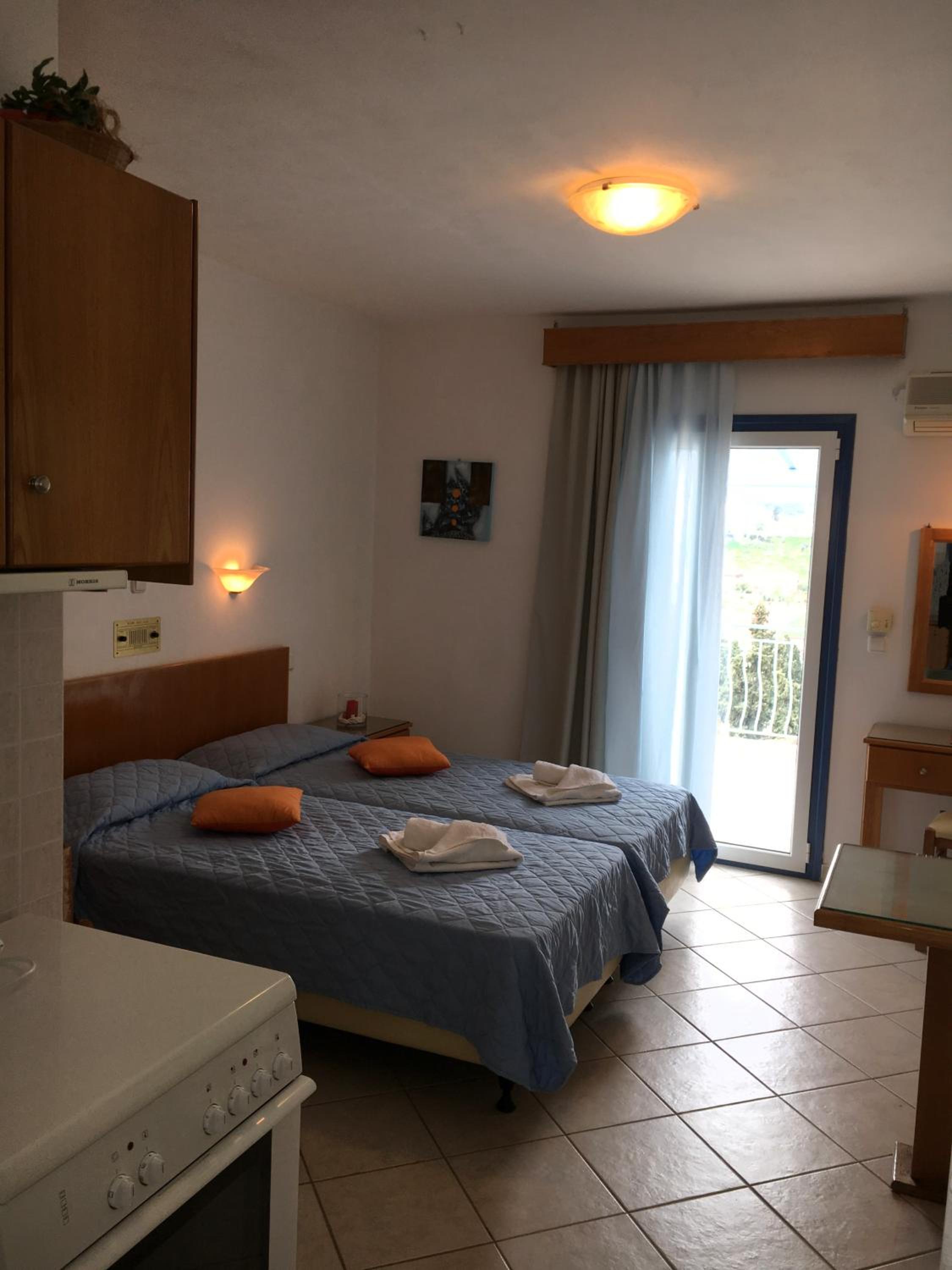 De locatie was geweldig, dichtbij het strand en de haven waar een heleboel restaurants en terrasjes zijn. Giannis en Miranda zijn hele vriendelijke mensen, ze zijn er altijd om je vragen te beantwoorden of om gewoon even een praatje te maken.