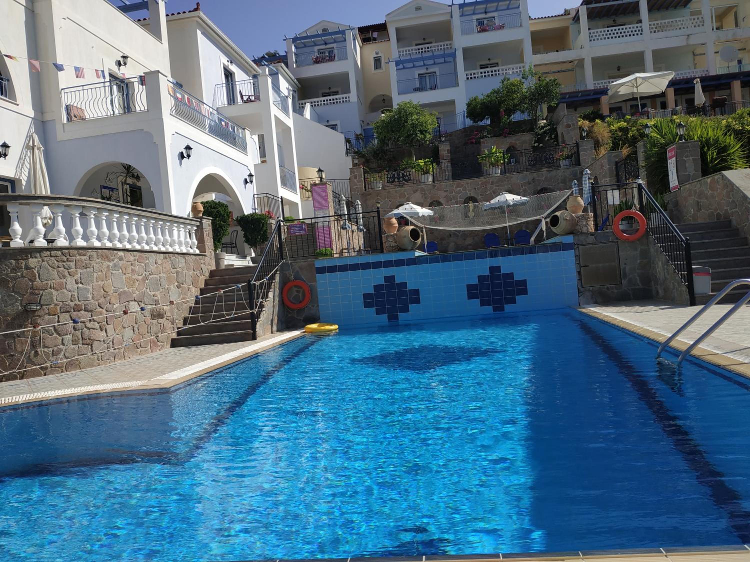 Lovely pool area, quite sheltered from the wind- deep swimming pool.