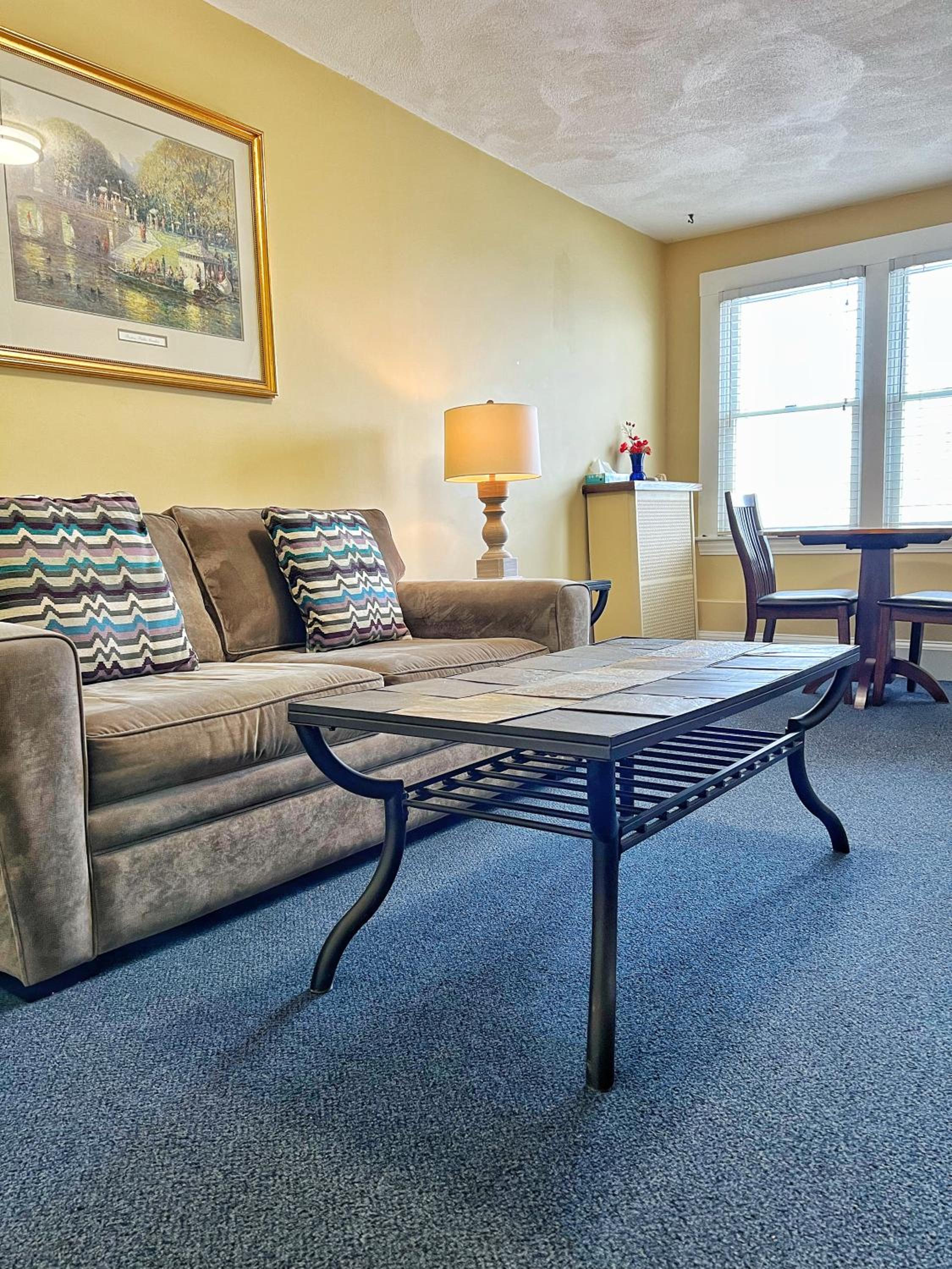 Stains on couch. Beds and couch were not very comfortable and seemed old and squeaky.