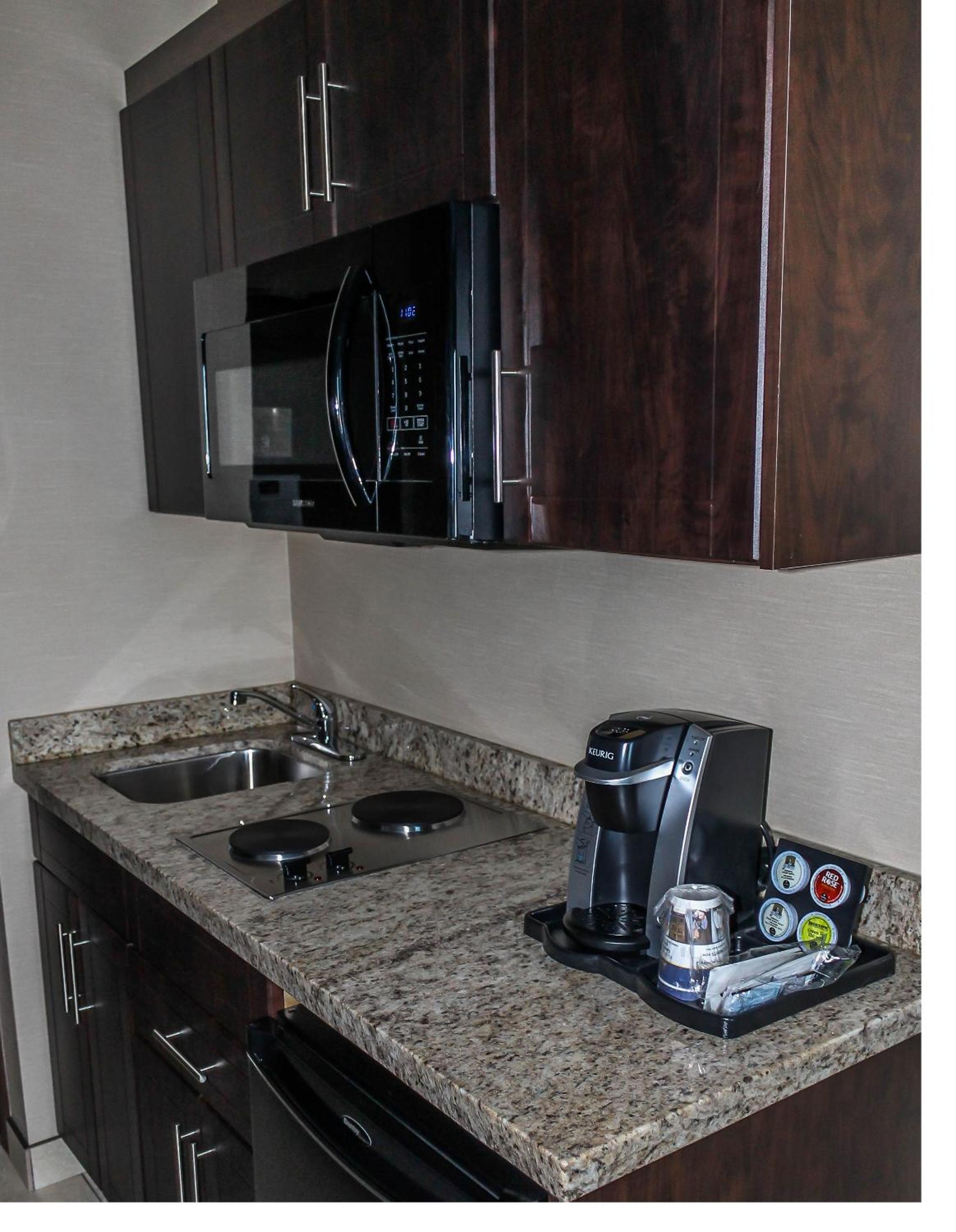 They have a Keurig in the room and a mini fridge with a freezer. Room had a large TV 55” I believe, Staff are fantastic. They have 24hr coffee.