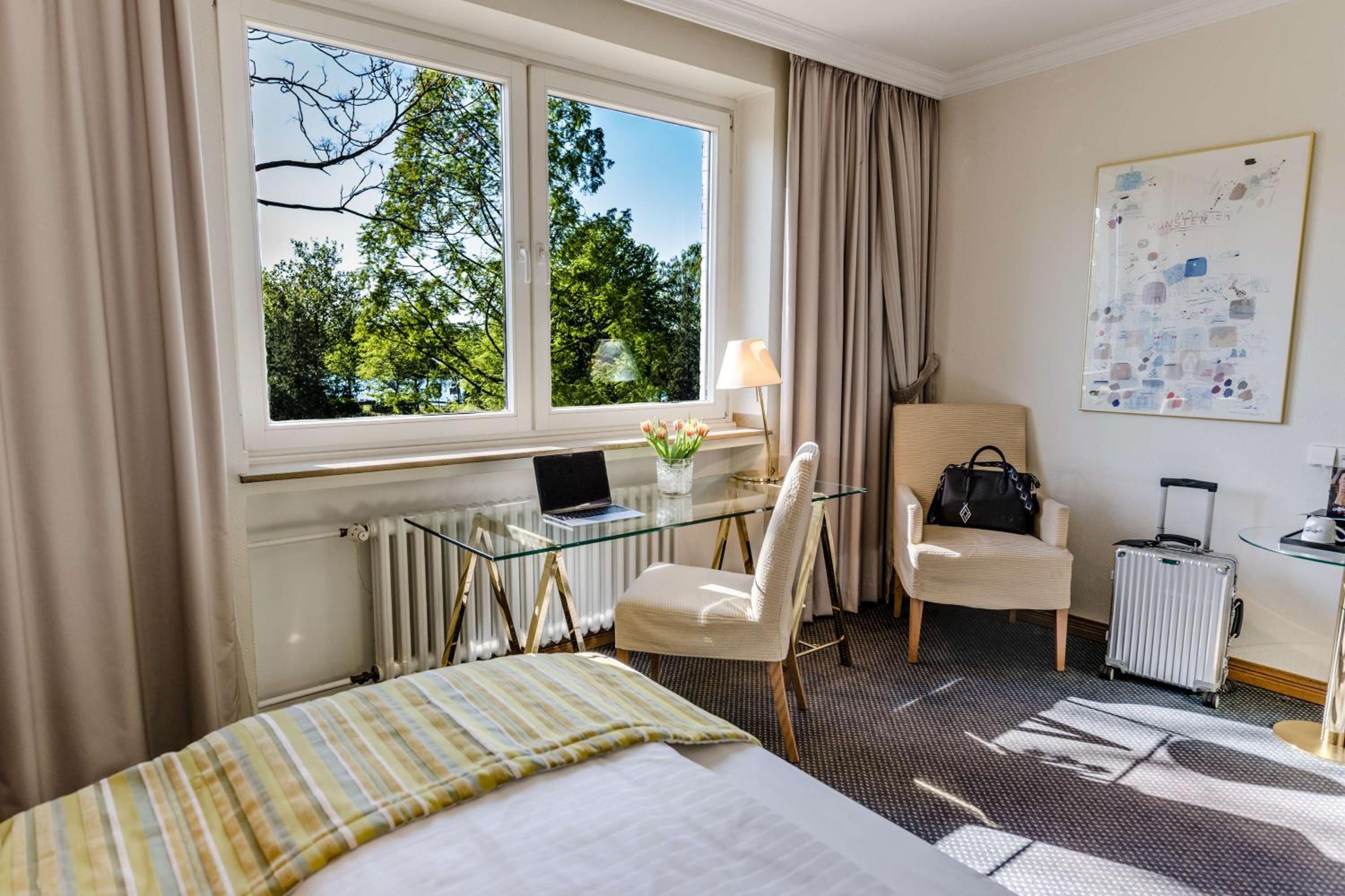 Een beetje gedateerd hotel net buiten Munster gelegen aan een meertje. Wij hadden een grote kamer met balkon en uitzicht op het meer. Vriendelijke ontvangst door zeer behulpzame dame. Grote kamer, beetje gedateerd maar prima en heerlijke bedden. Douche bleek het niet te doen toen wij wilden douchen na het zwemmen. Gemeld bij de receptie en bij terugkomst wederom gevraagd of het gerepareerd was maar dat was nog niet gelukt. Ze boden andere kamer aan. Bij het uitchecken bleek dat er overdracht was geweest van deze informatie en werd ons gratis parkeren aangeboden. Heel erg netjes!!