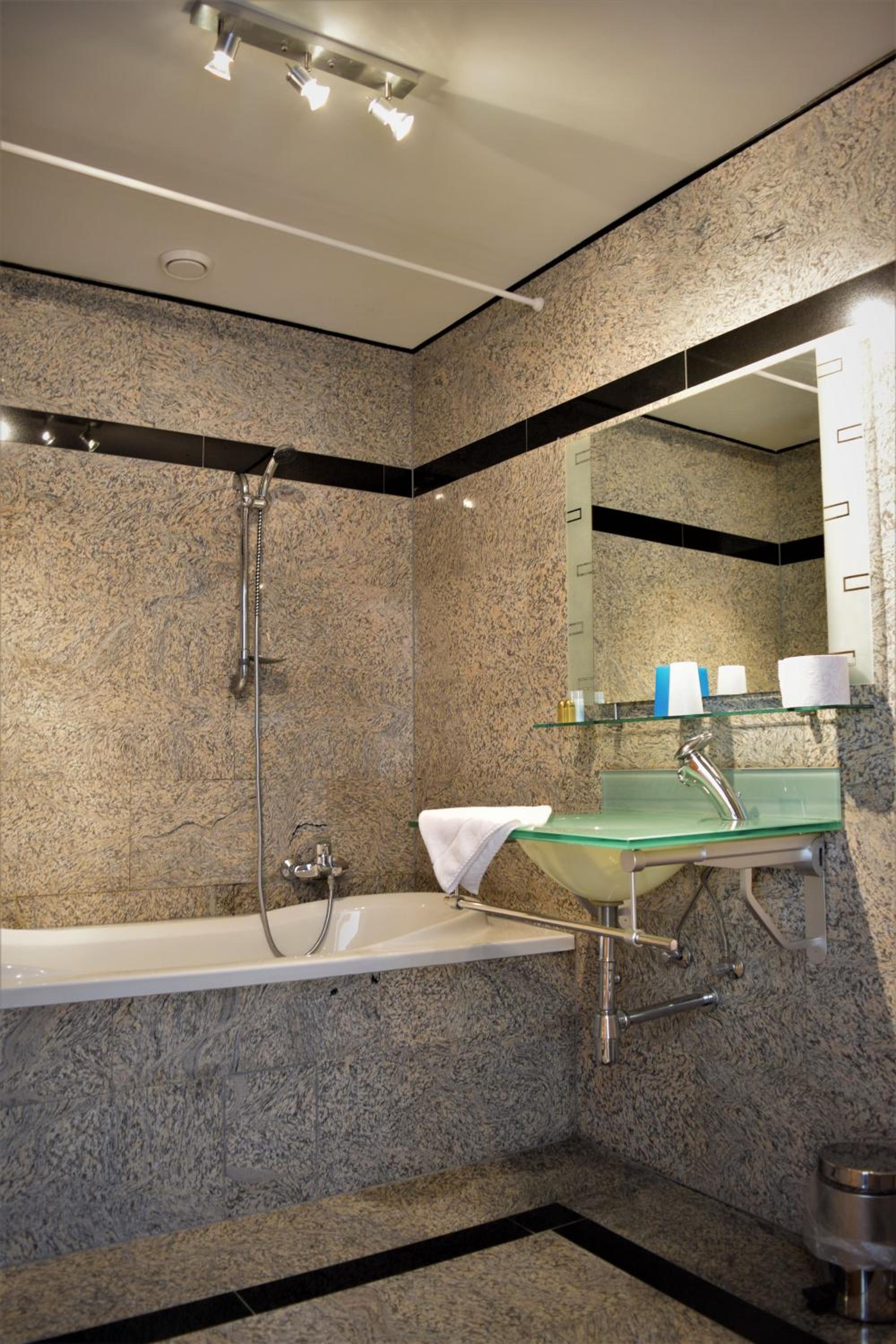 Er is een regendouchekop geinstalleerd op een "normale" douche met een bad. Wat ons betreft had dit een normale douchekop mogen zijn (maar dat is onze persoonlijke voorkeur).