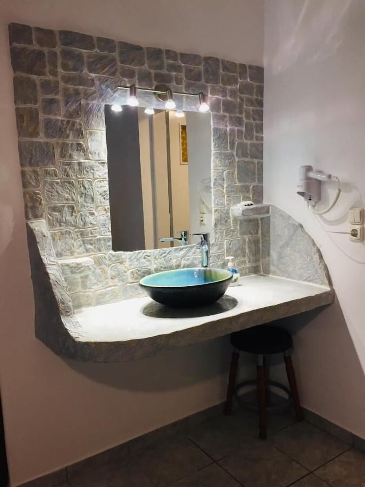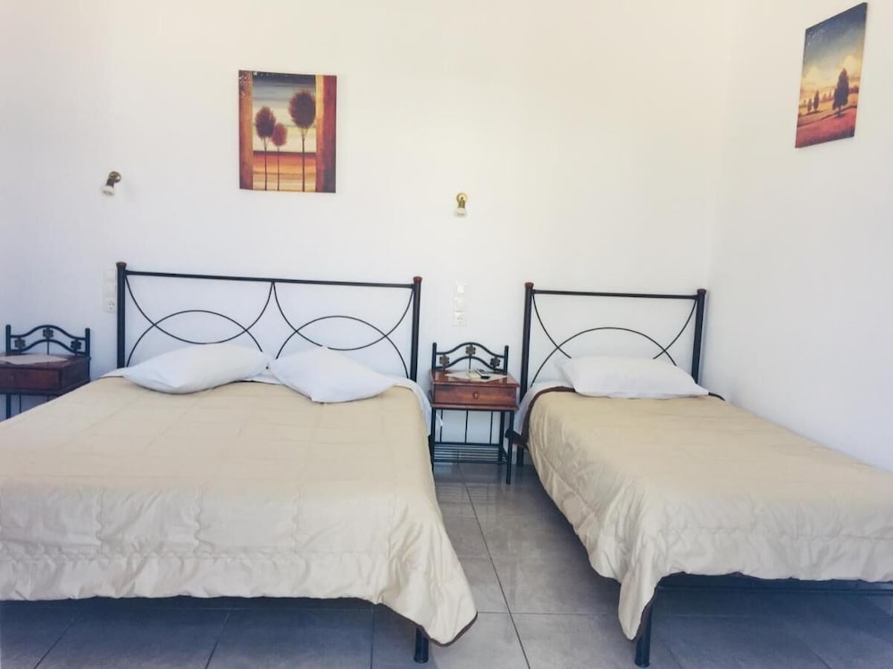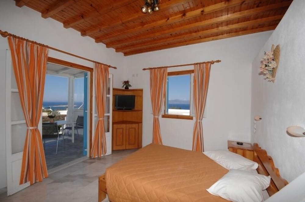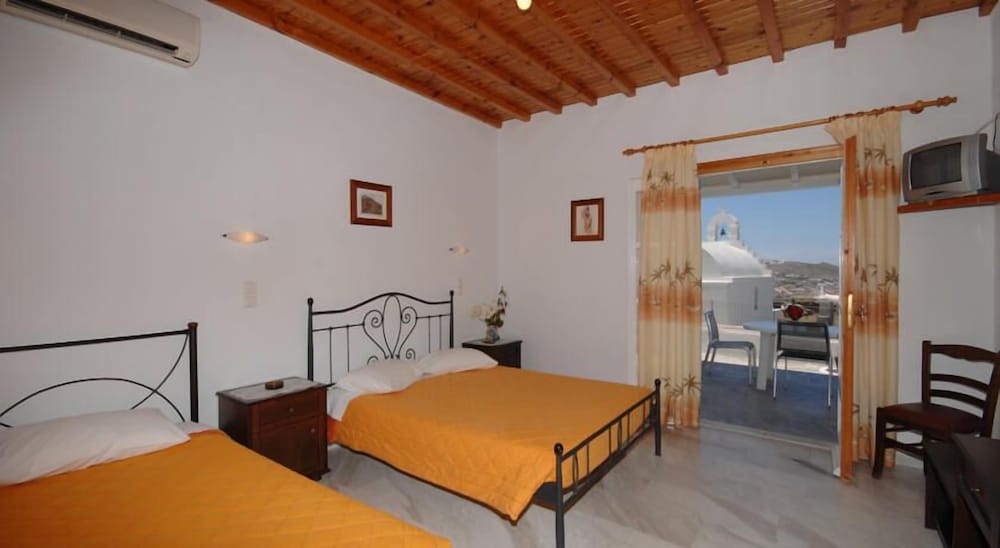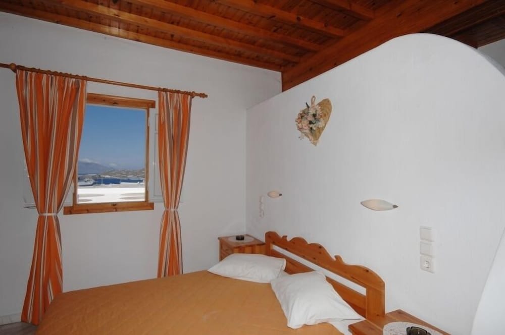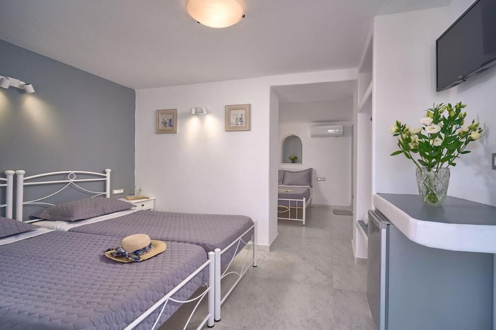 Room was perfect size. Beds were very uncomfortable and WiFi wasn’t working. Pool and bar area are very nice and the view was amazing. Had to walk down a 90 degree hill to get to the Mykonos town which was interesting to say the least. We rented ATVs and parked them there no problem. Staff was very accommodating and helpful. Ants and bugs all in the room on the floor bathroom and kitchen area.
