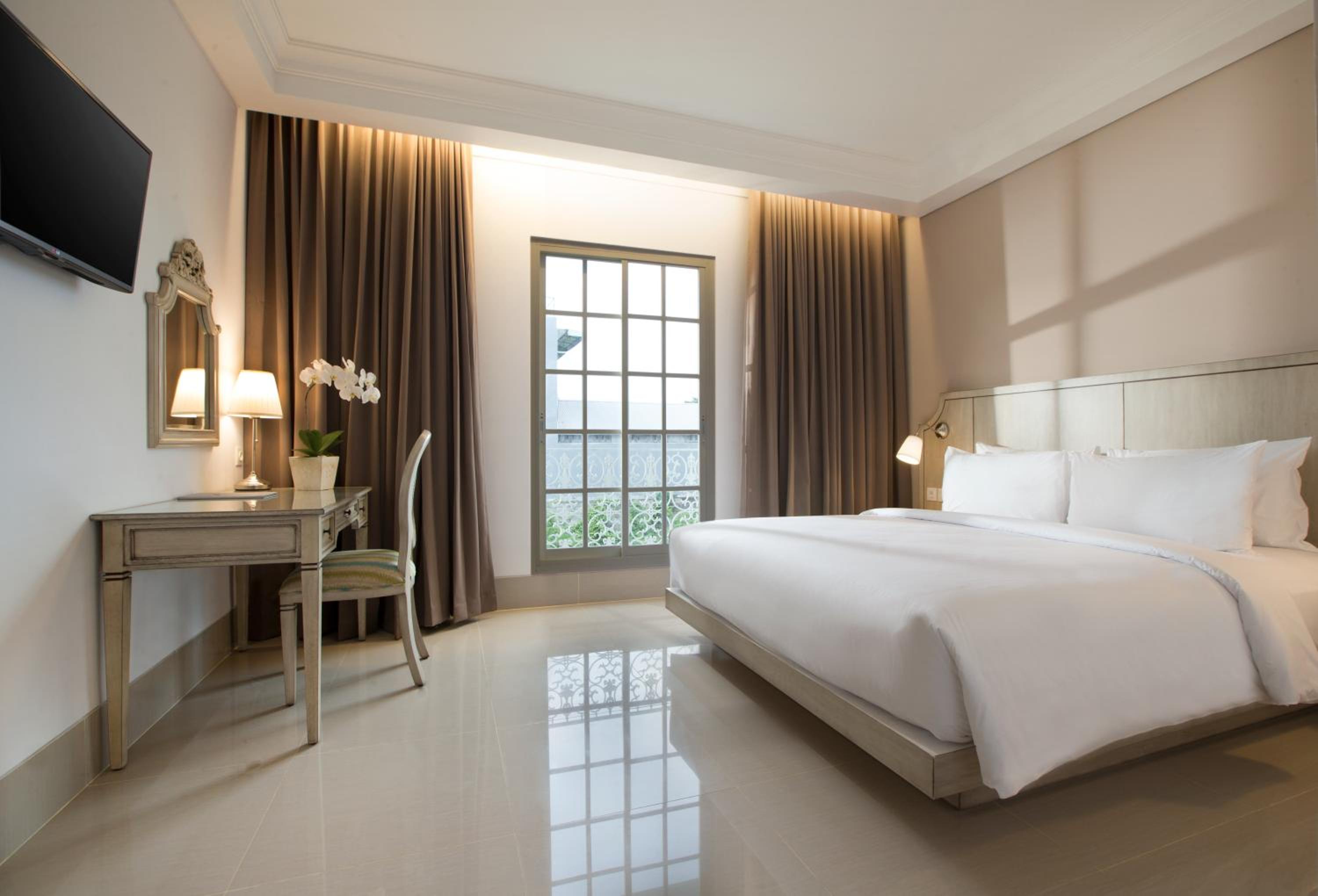 Hotel Santika Seminyak offers beautifully decorated rooms in soothing cool tones, each equipped with modern amenities including a flat-screen TV and en suite bathroom.