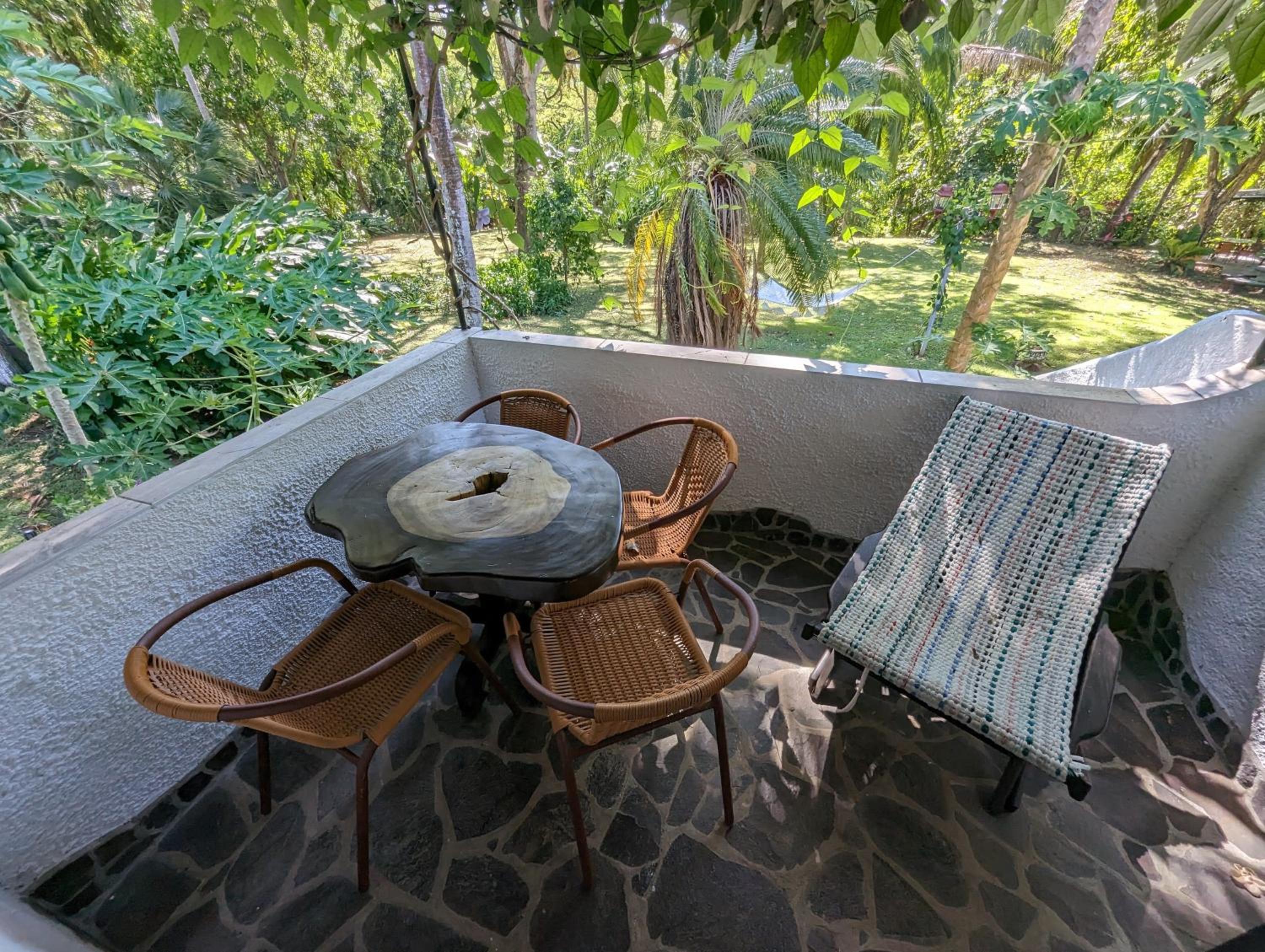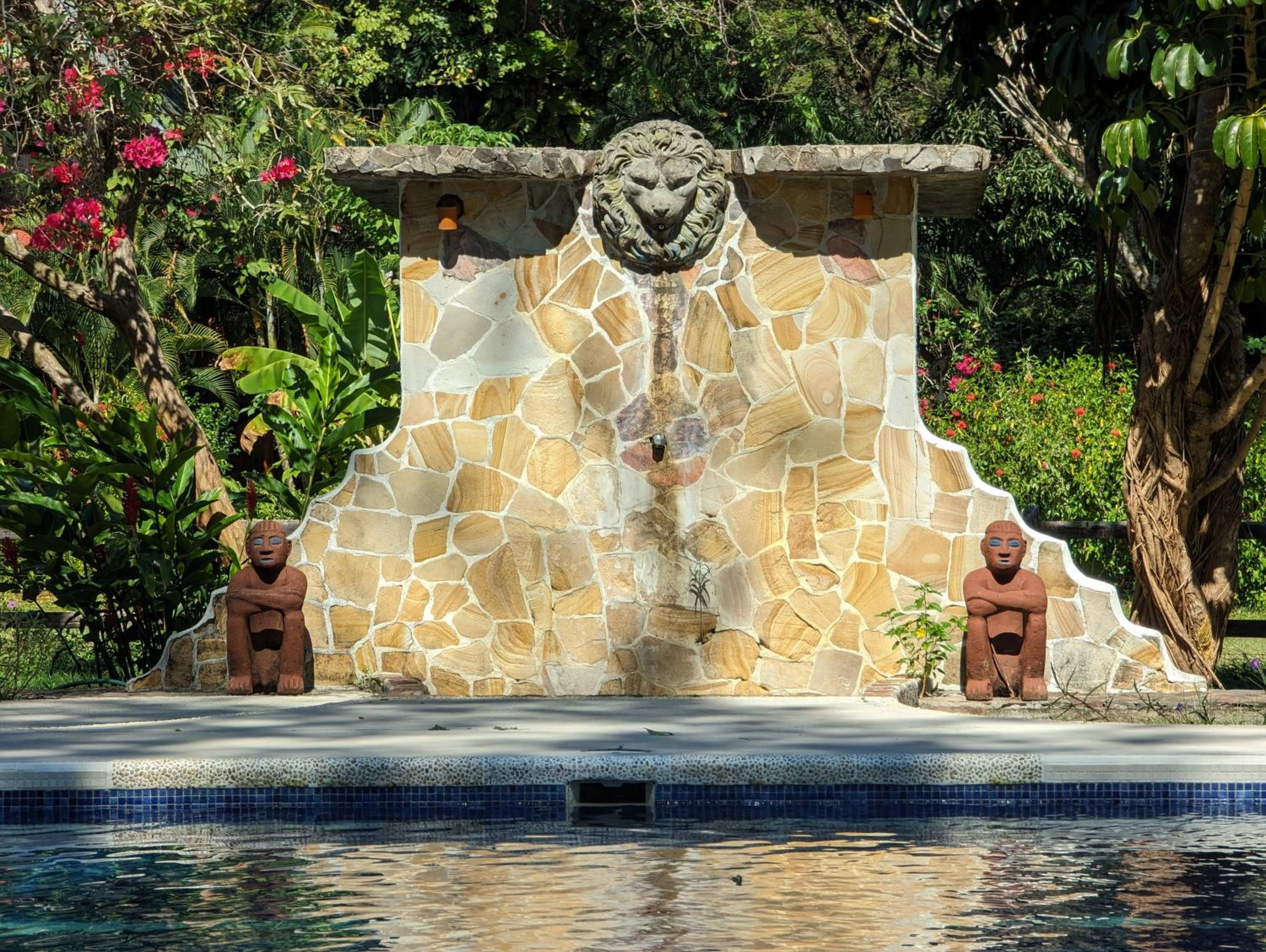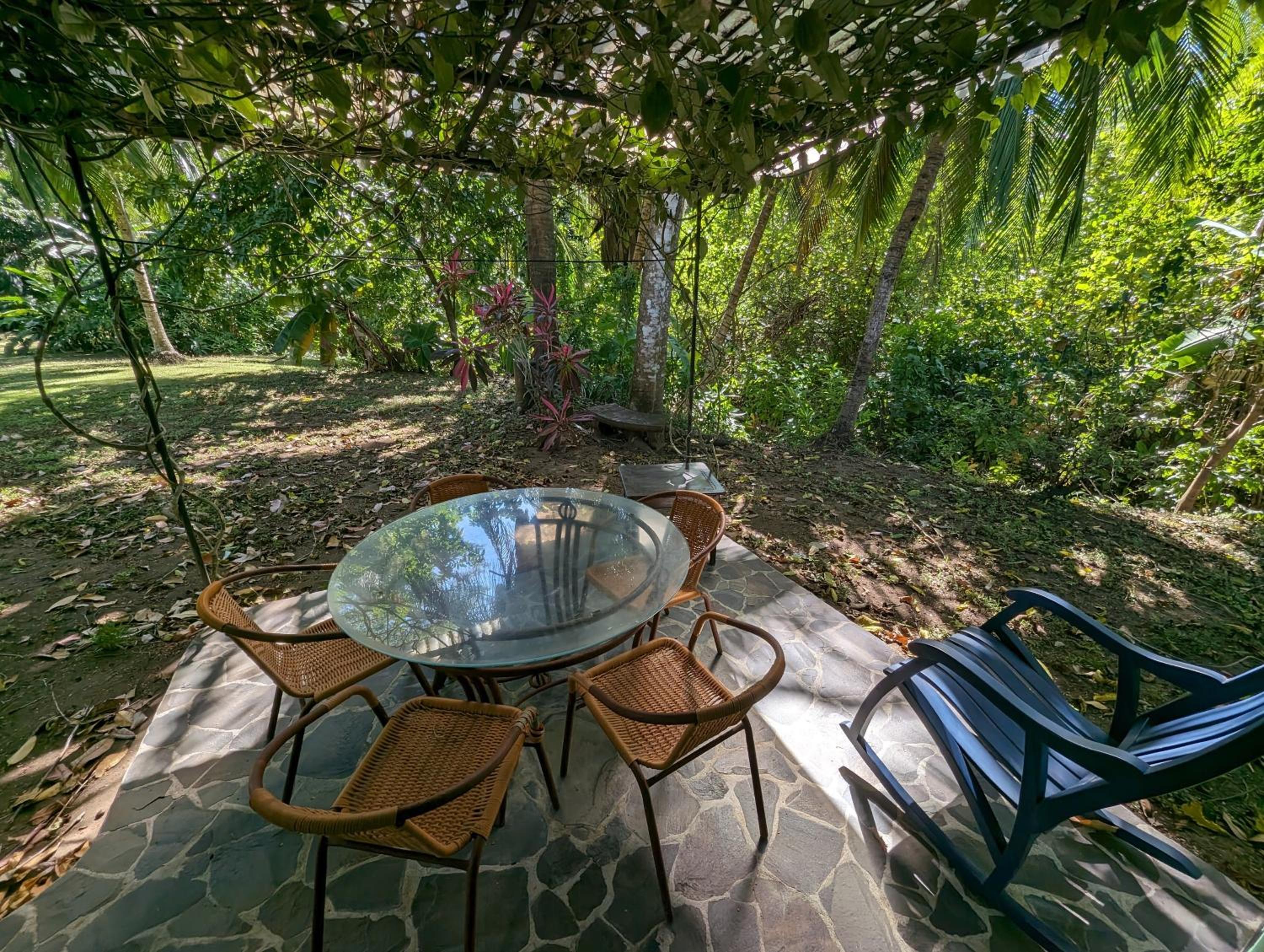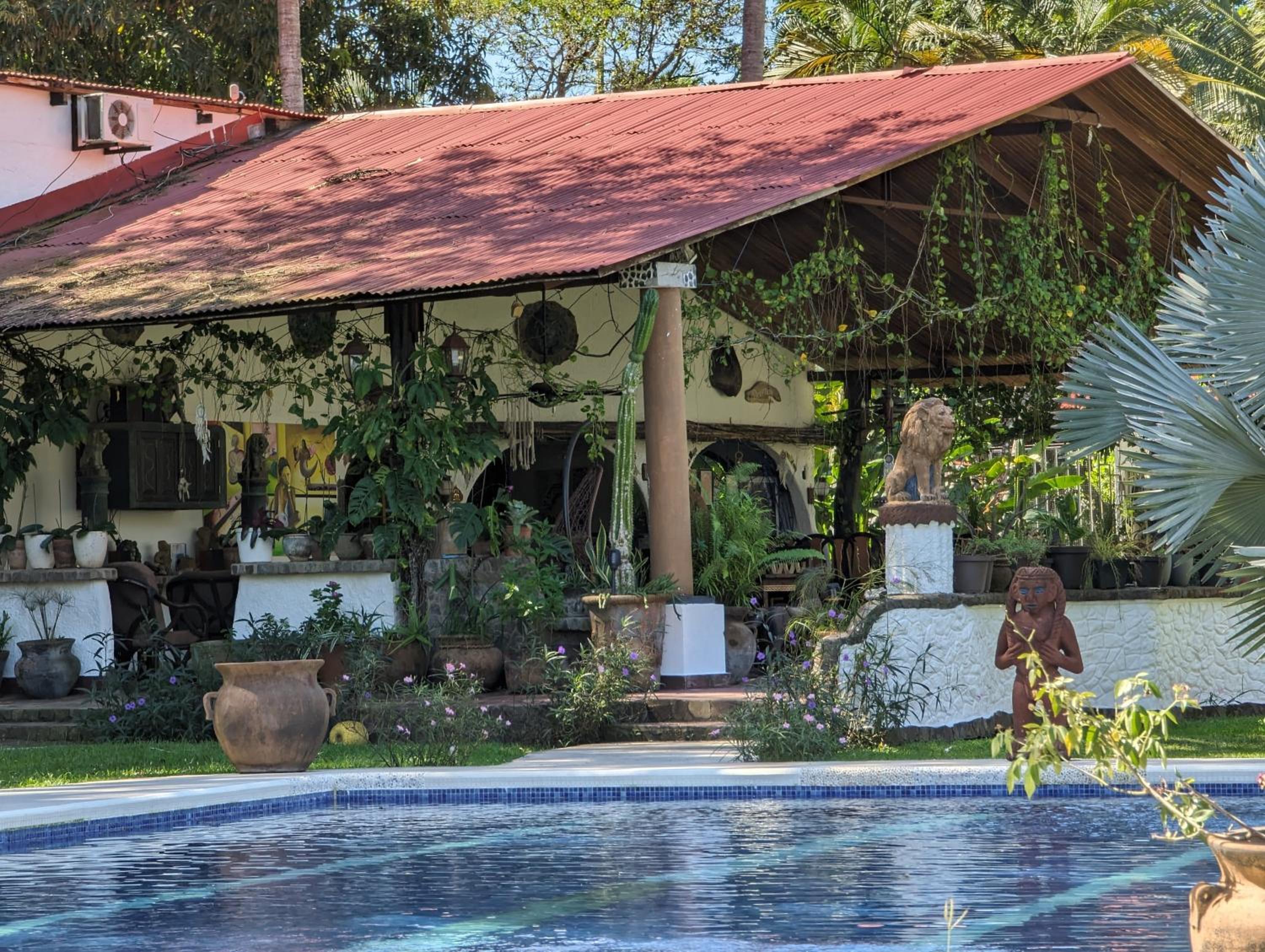 prachtig terrein midden in de natuur met veel vogels en ook apen. het zwembad is groot en er zijngenoeg ligbedden. het meubilair is erg stijlvol en mooi.
