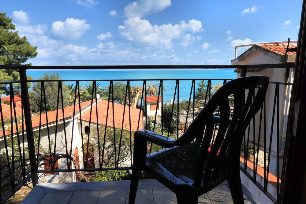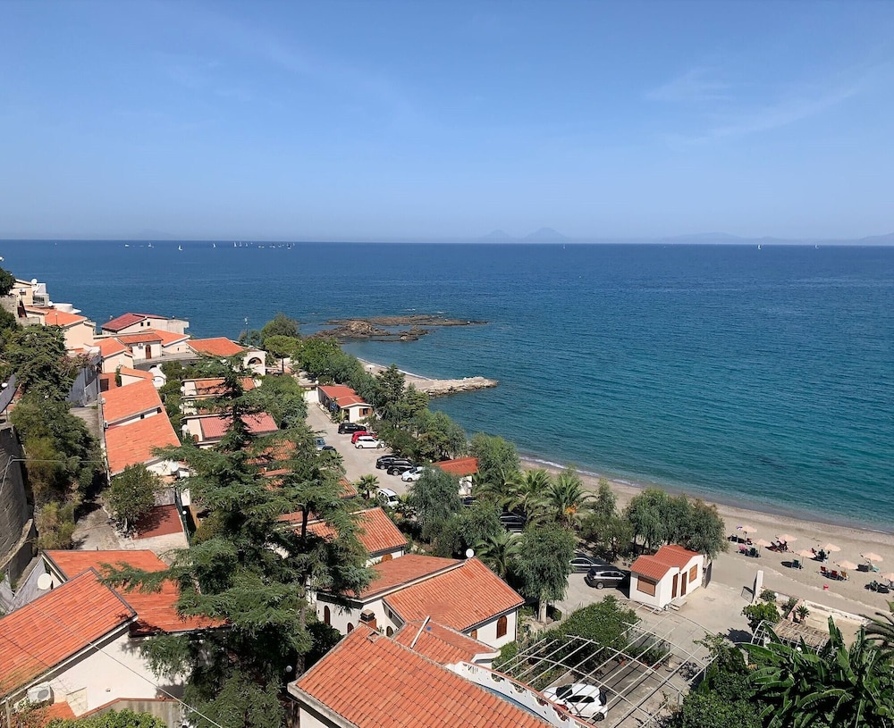 Die Anlage liegt an einem steilen Hang, verfügt über einen eigenen Kies-/Sandstrand (schöne Steine!) und ein sehr sauberes Meer (interessant zum Schnorcheln) mit Blick auf die äolischen Inseln. Appartement gut unterhalten. Nächste grössere Einkaufsmöglichkeit 3 km entfernt.