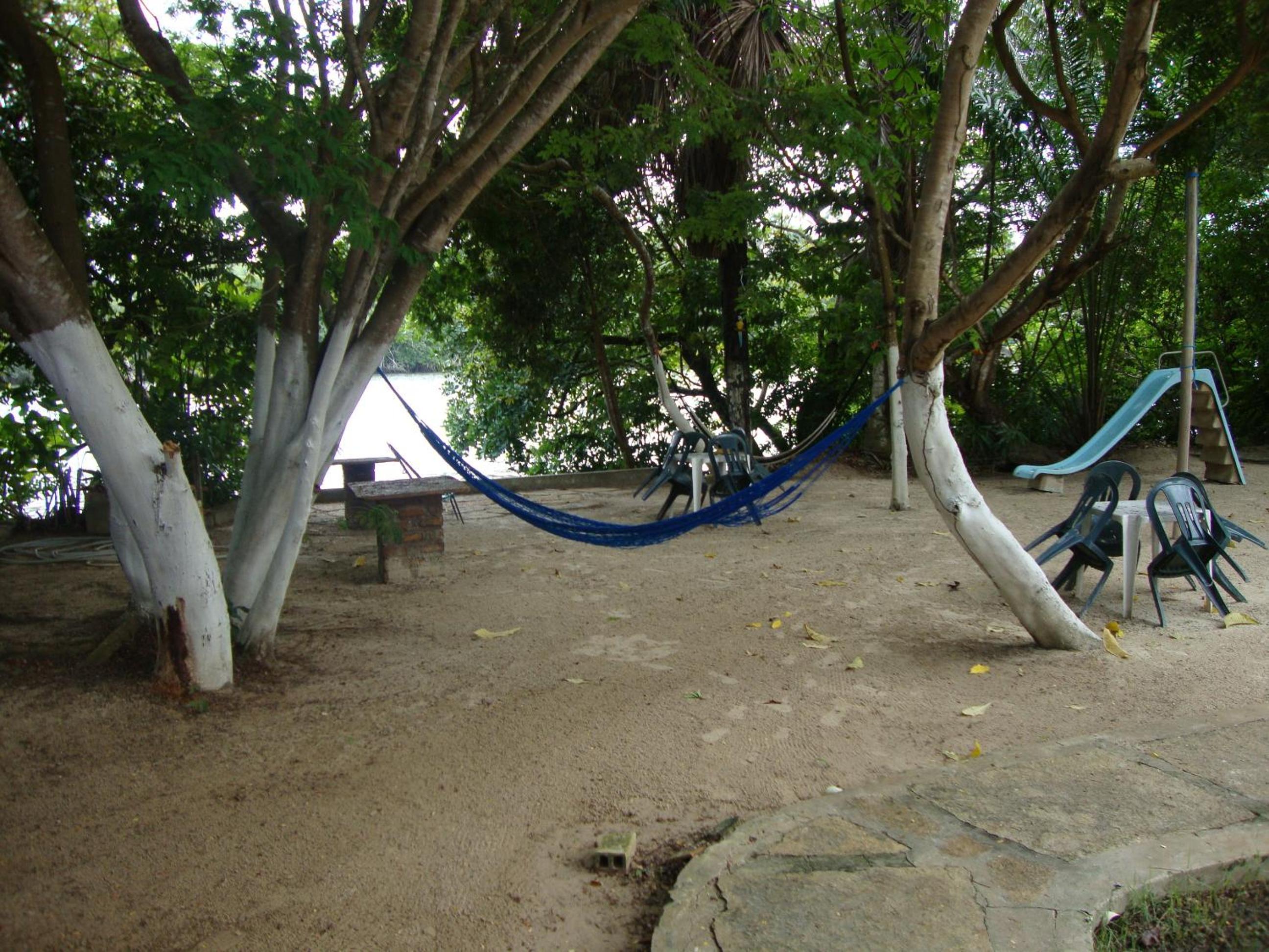 A integração da hospedagem com a natureza e com o rio é bem interessante, traz uma conexão com a natureza muito próxima; Área comum da hospedagem com bancos, lounges e redário na natureza permitem um local para descanso ao ar livre;