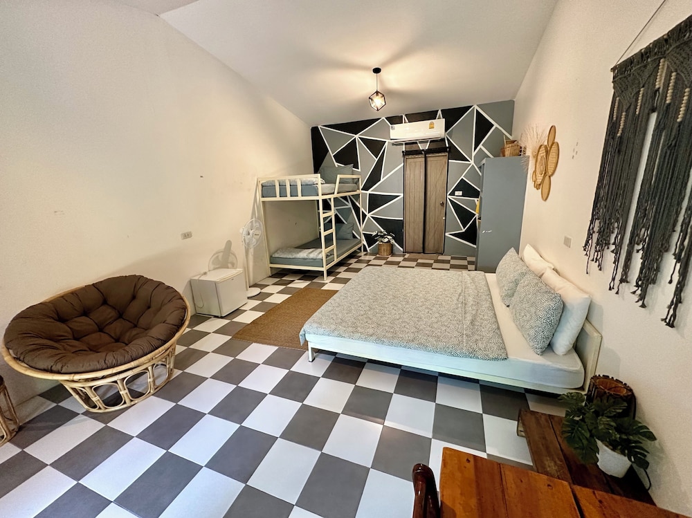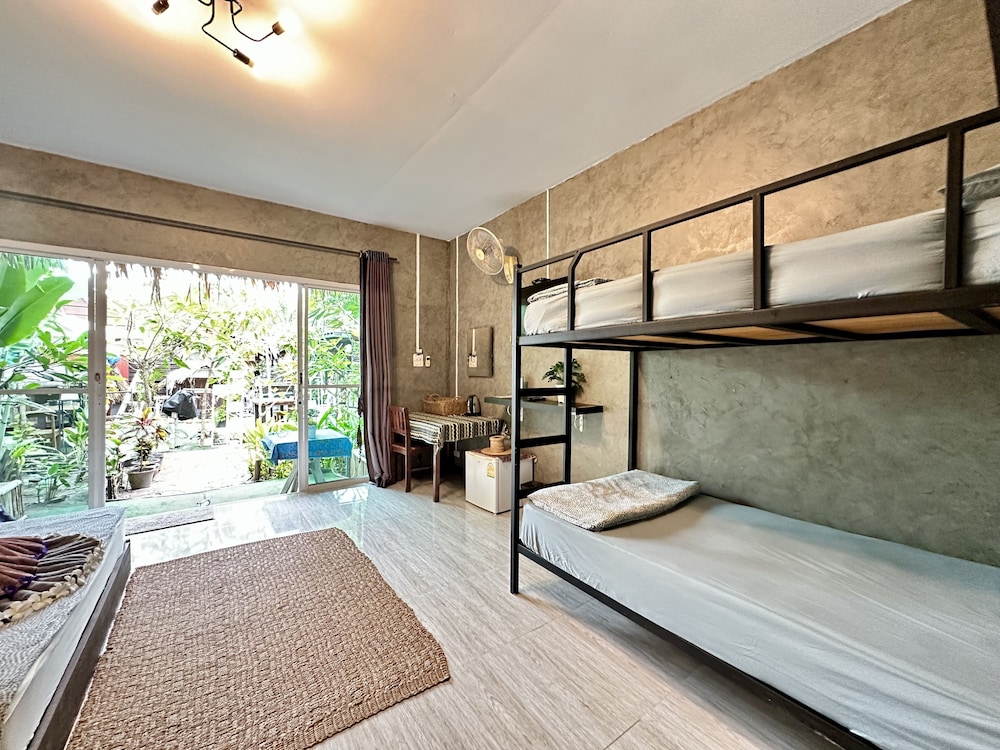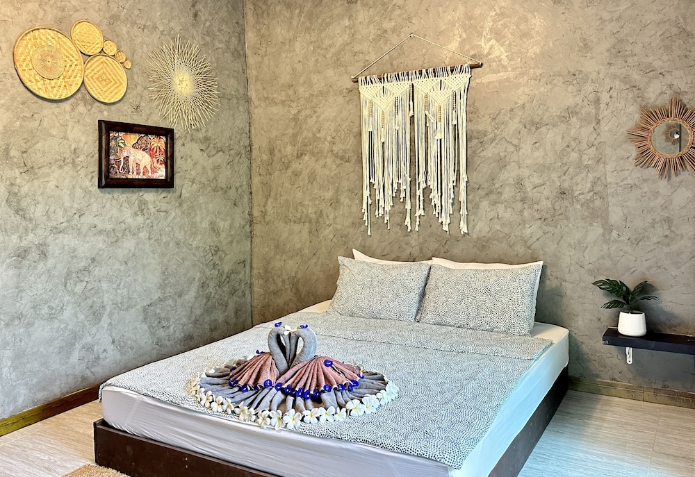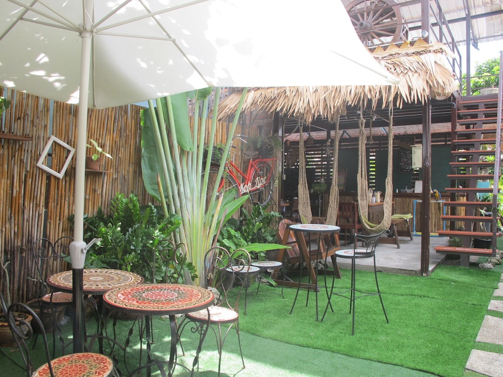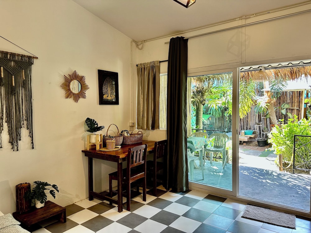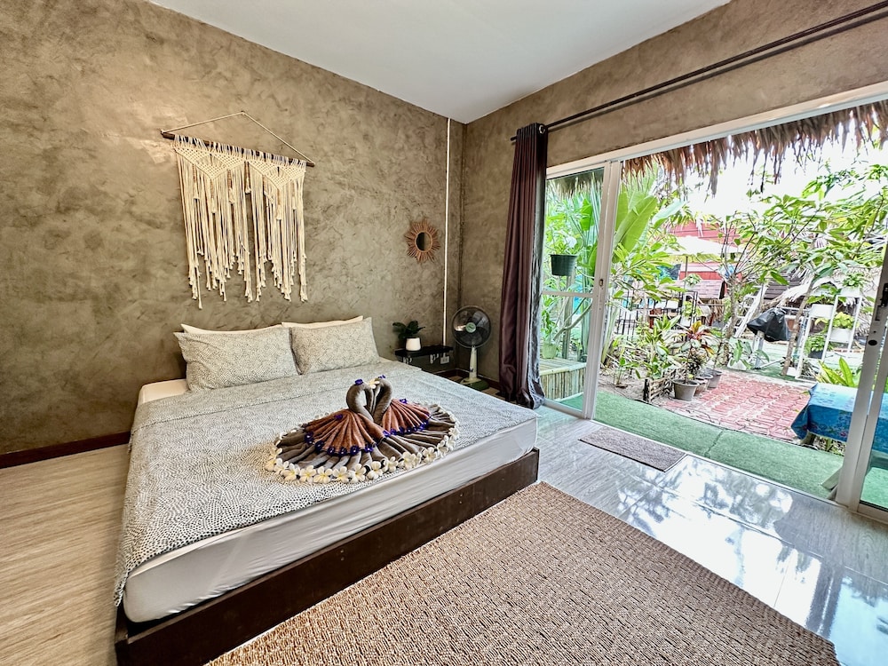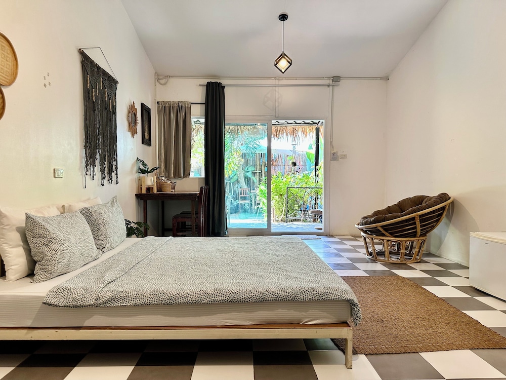 Cosy room in a green garden away from the noisy walking street. Although, you’re neighbor with OMG bar with live music every night. Friendly staff and very nice room and porch.