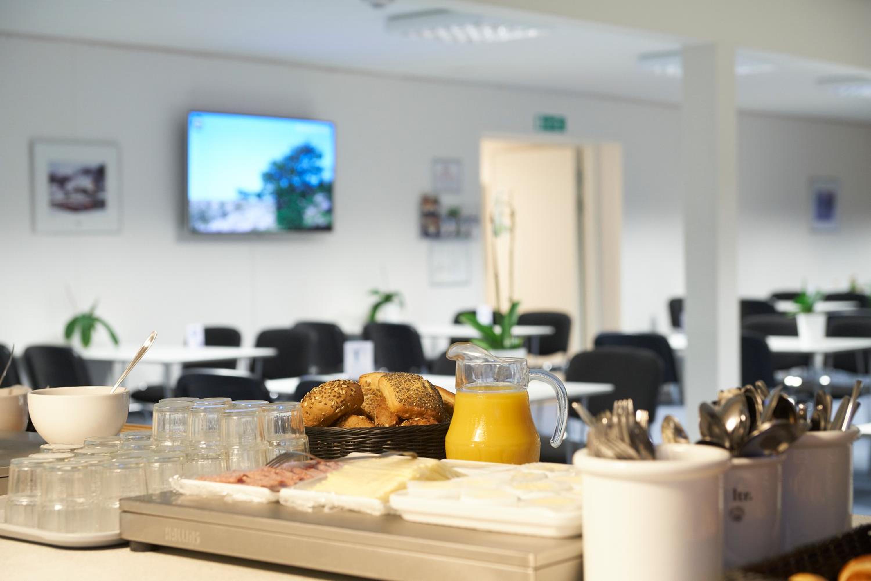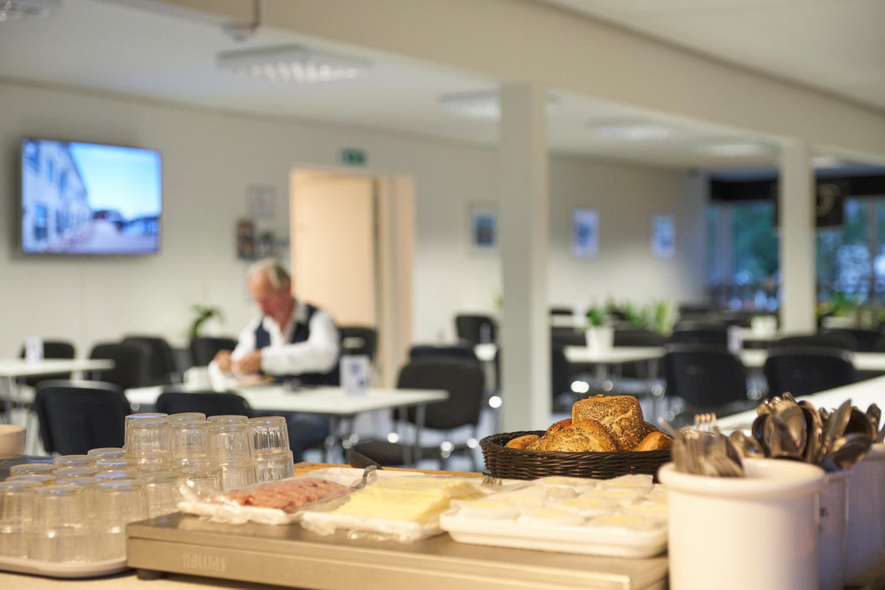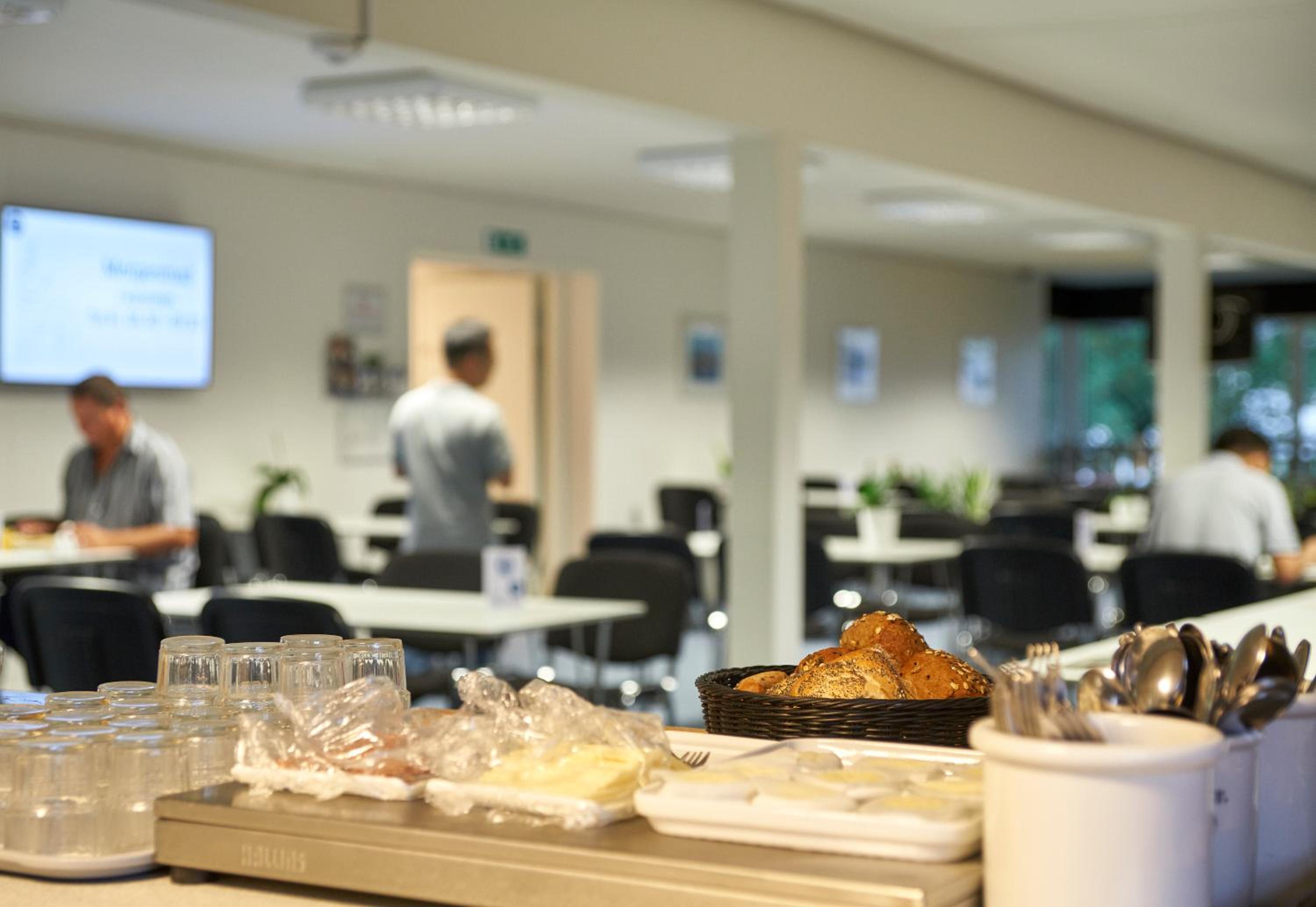 Nemt at komme til messe området. Mulighed for morgenmad, det er microovn og køleskab til rådighed.