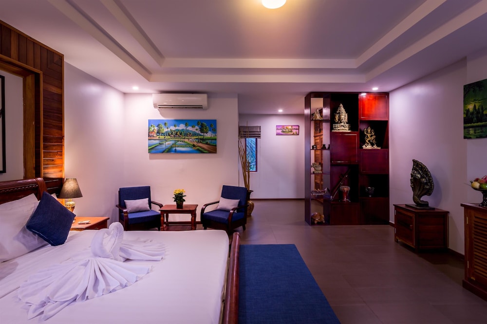 The rooms were very spacious & tastefully furnished. Very friendly & helpful staff. Twenty minute walk to Pub street, however a Grab tuk tuk is 80p or 1 dollar, so really not an issue. A very pleasant 5 night stay.