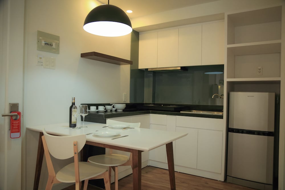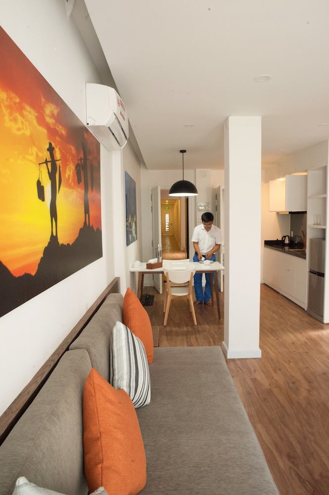 Мы отдыхали в этом апарт-отеле в марте 2019 г. Заказывали апартаменты с балконом, ориентируясь на фотографии, которые очень привлекательны. Приехали в отель в 4 утра, но нас поселили только в 11. Номер (403) оказался без балкона, т.к. таких номеров только 2 в отеле, как нам сказали, и они были заняты. Но балкон там и не нужен, т.к. шумная улица внизу, ночью музыка гремит из баров. Номер похож на фото, но уже уставший. На второй день правыкаешь, осваиваешься , и все хорошо. Расположение отеля отличное, близко к углу Biet Thur и второй линии. Все рядом - и пляж, и все известные магазины и рестораны, и автобусные остановки. Персонал отеля дружелюбный, общается на английском, заботится, номер убирали (слегка) ежедневно, подкладывали кофе, сахар, воду.