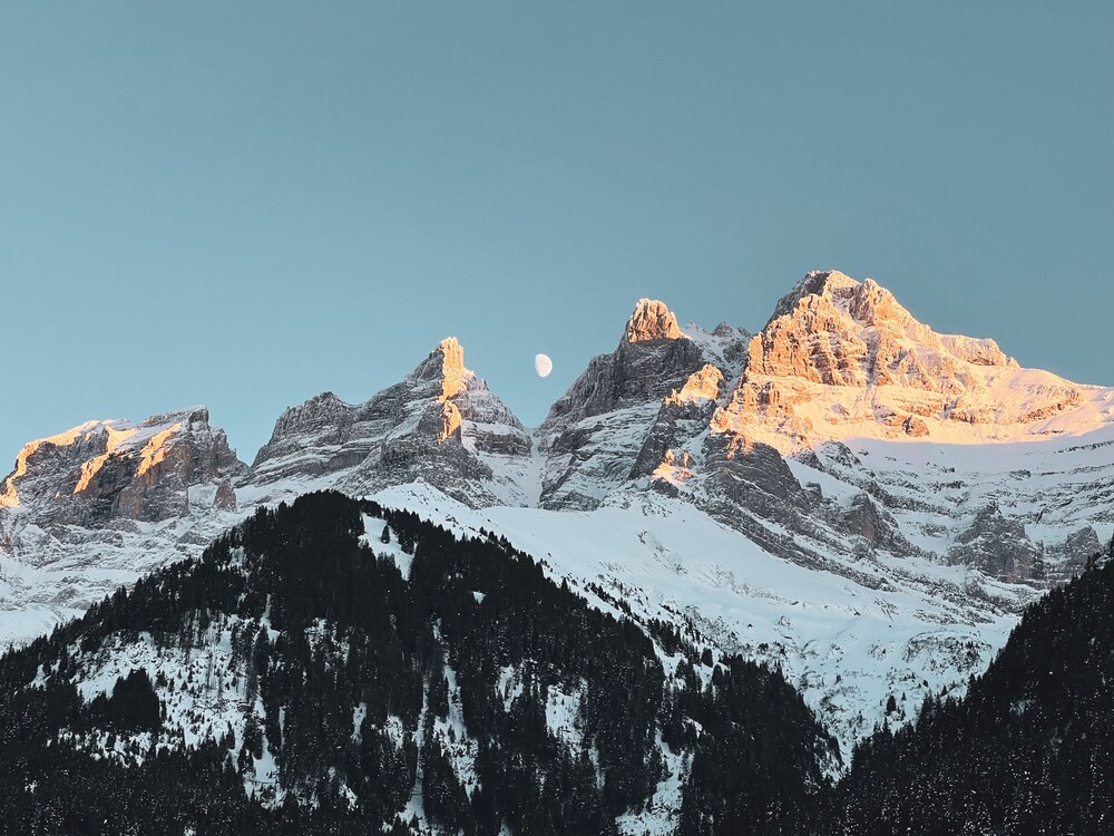Nous avons séjourné dans une chambre avec toutes les commodités face aux dents du midi.