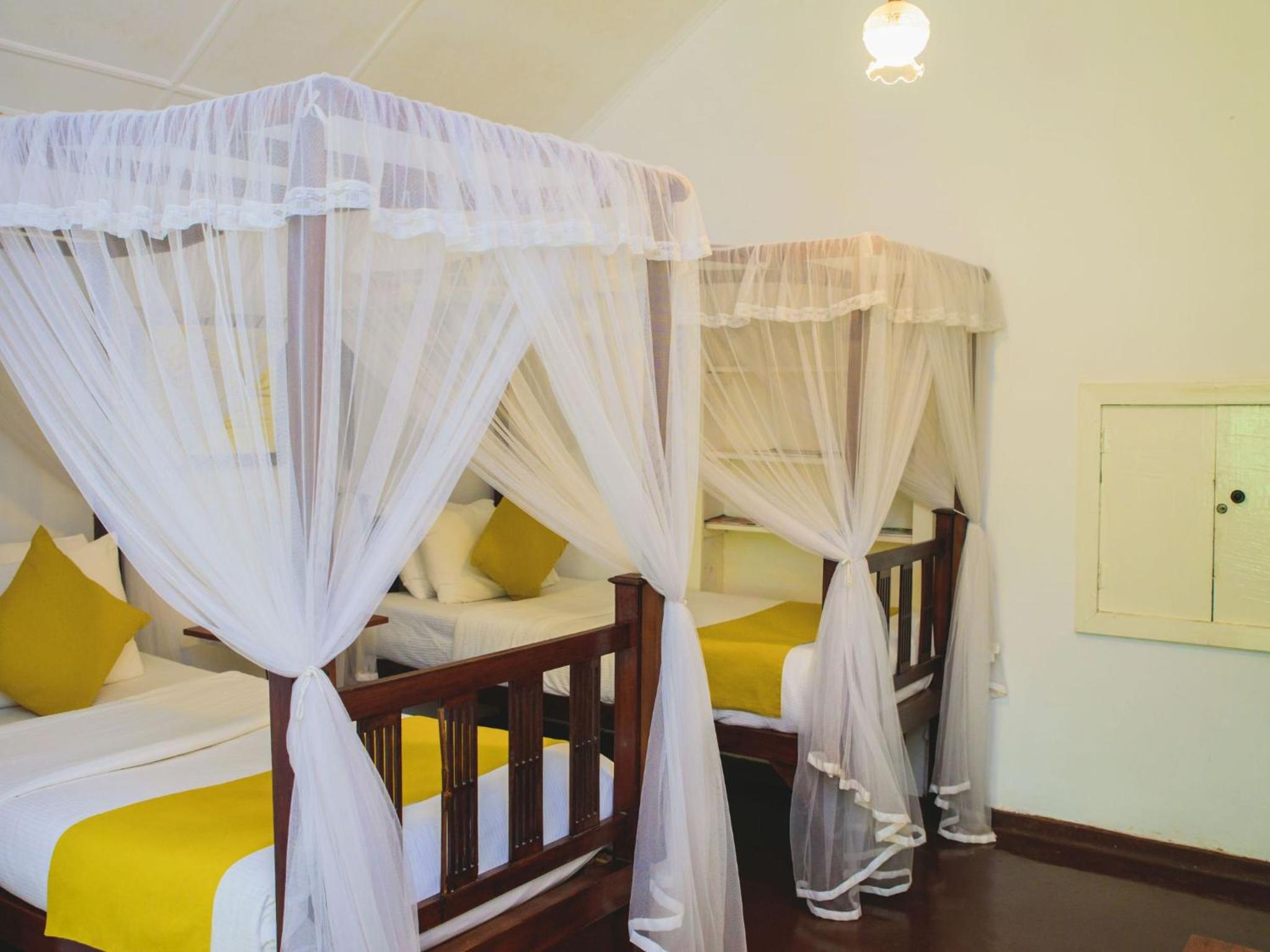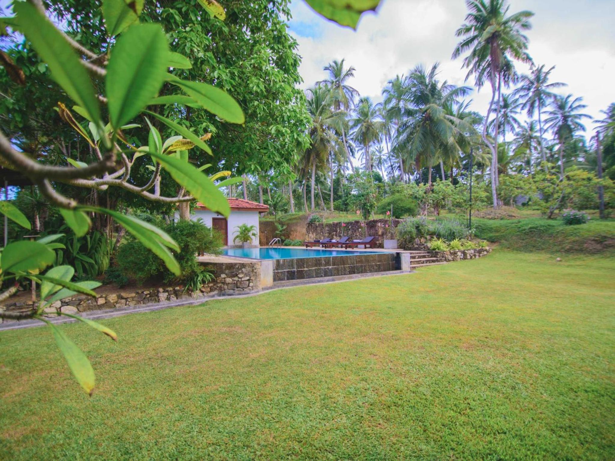 Beautiful location set in 10 acres of land. Super quiet you just hear the jungle noises. Gorgeous swimming pool. Old colonial style bungalow full of charm and antiques. Our bedroom was facing the front lawn spacious and charming. We had the SriLanka breakfast which was delicious and also had supper of traditional vegetarian ‘’curry and rice’ which was really so tasty.