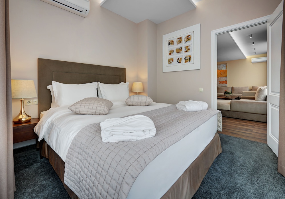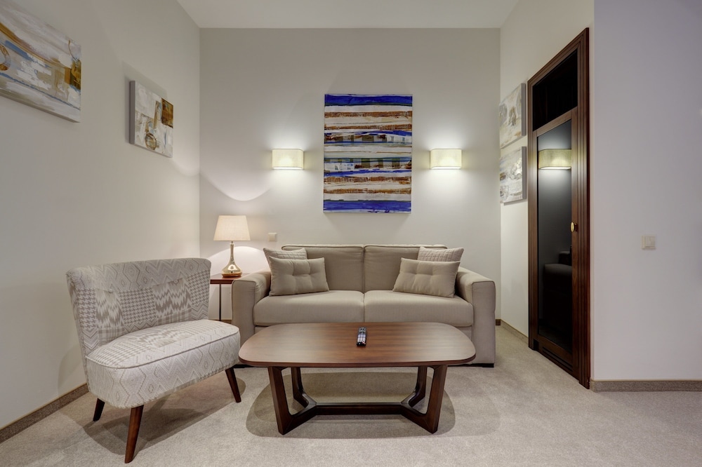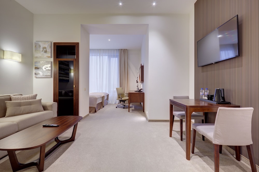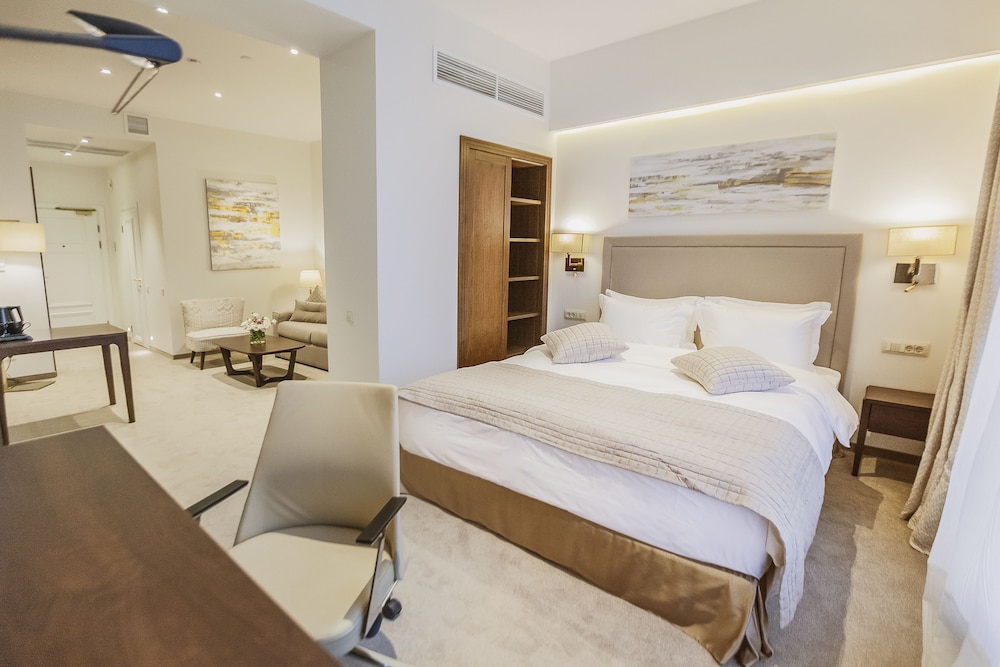 Bardzo duży pokój, a właściwie dwa pokoje - jeden z kanapą i stołem z krzesłami, drugi z bardzo dużym łóżkiem. Czajnik w pokoju. Jedyny minus - słabe śniadania, mały wybór jak na hotel tej klasy, słaba jakość produktów W tygodniu śniadania do godz. 11:00 - to plus. Ogólnie hotel godny polecenia.