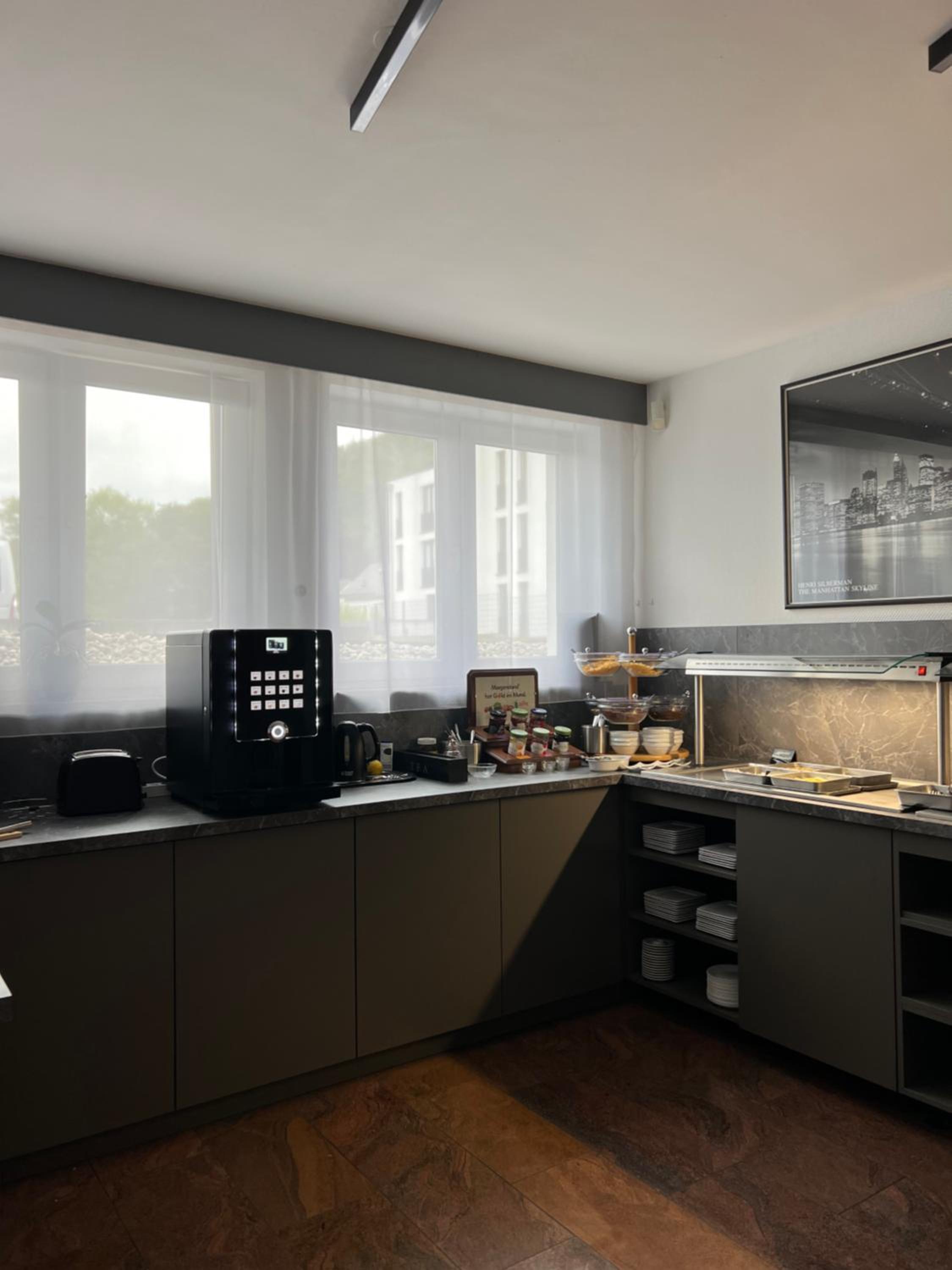 Es steht ein Wasserkocher im Zimmer ...leider keine Tassen . Kaffee habe ich mir bei Netto geholt und 2 Tassen bei Action. Ich finde wenn da schon ein Wasserkocher steht dann doch bitte auch Tee oder Kaffee und Tassen 🙃 aber das ist vielleicht klagen auf hohem Niveau sonst alles super