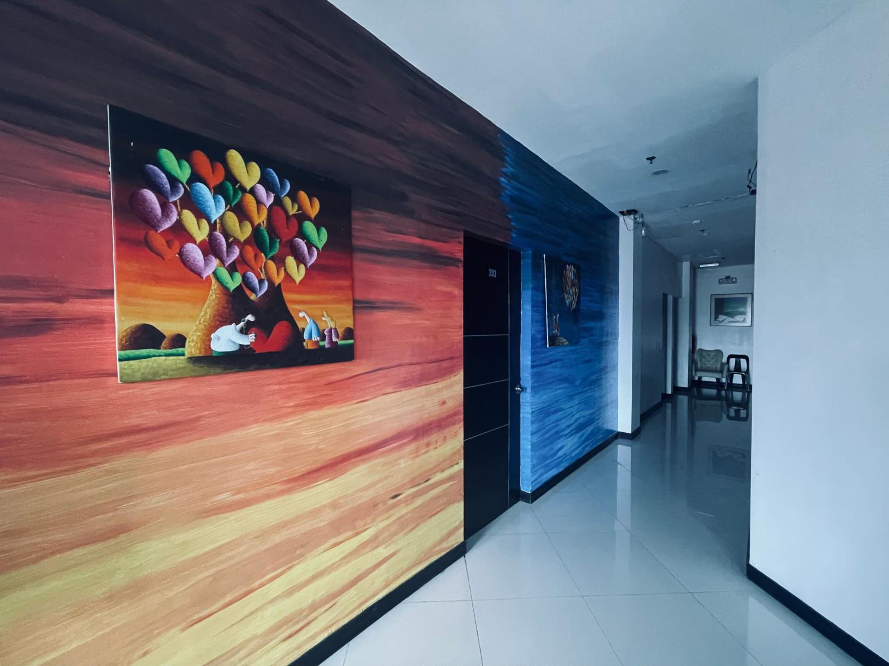 Public area covered in a variety of bright paintings in primary colours yet our room had no decoration at all.