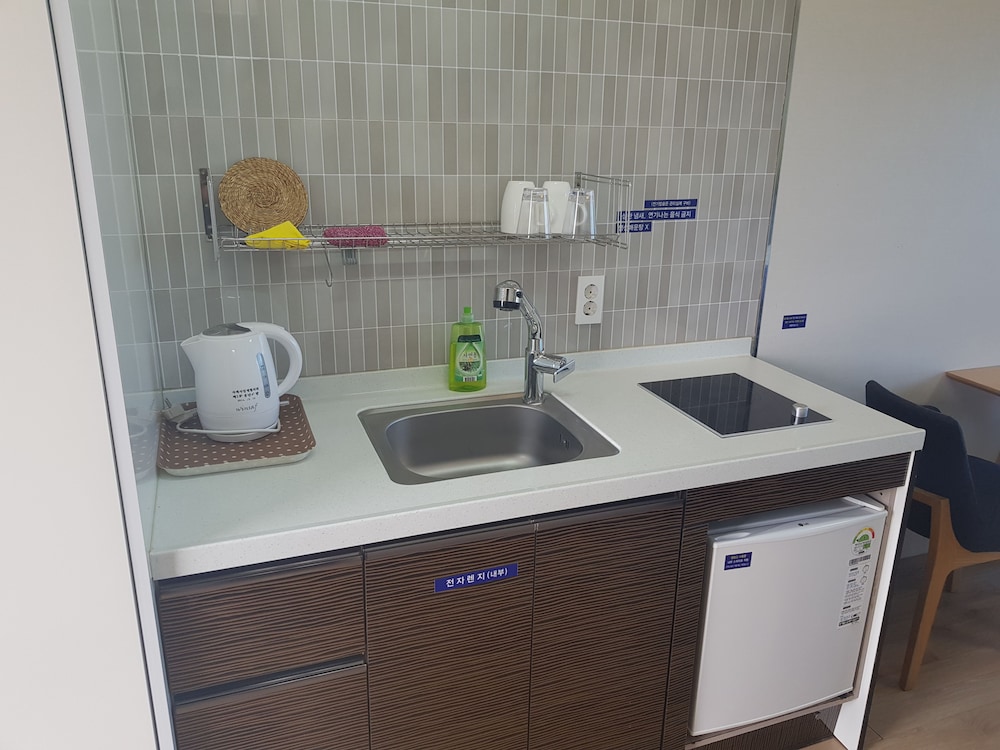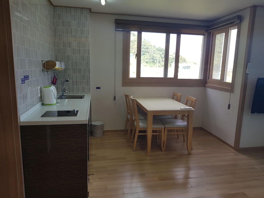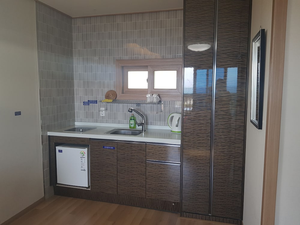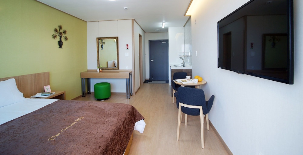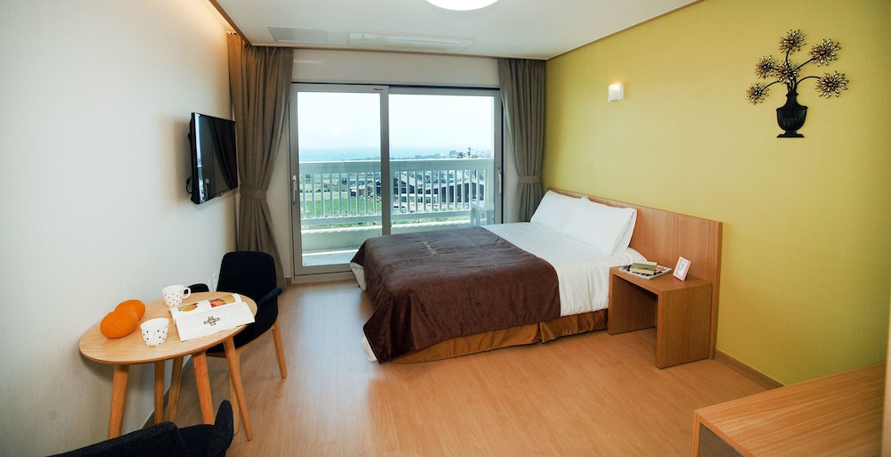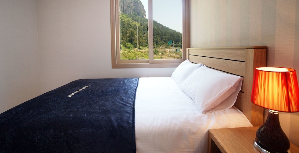 A perfect, relaxing stay with an amazing ocean view on one side and the beauty of Sanbangsan on the other. Bed, kitchenette, balcony, and an ensuite - there was nothing missing!