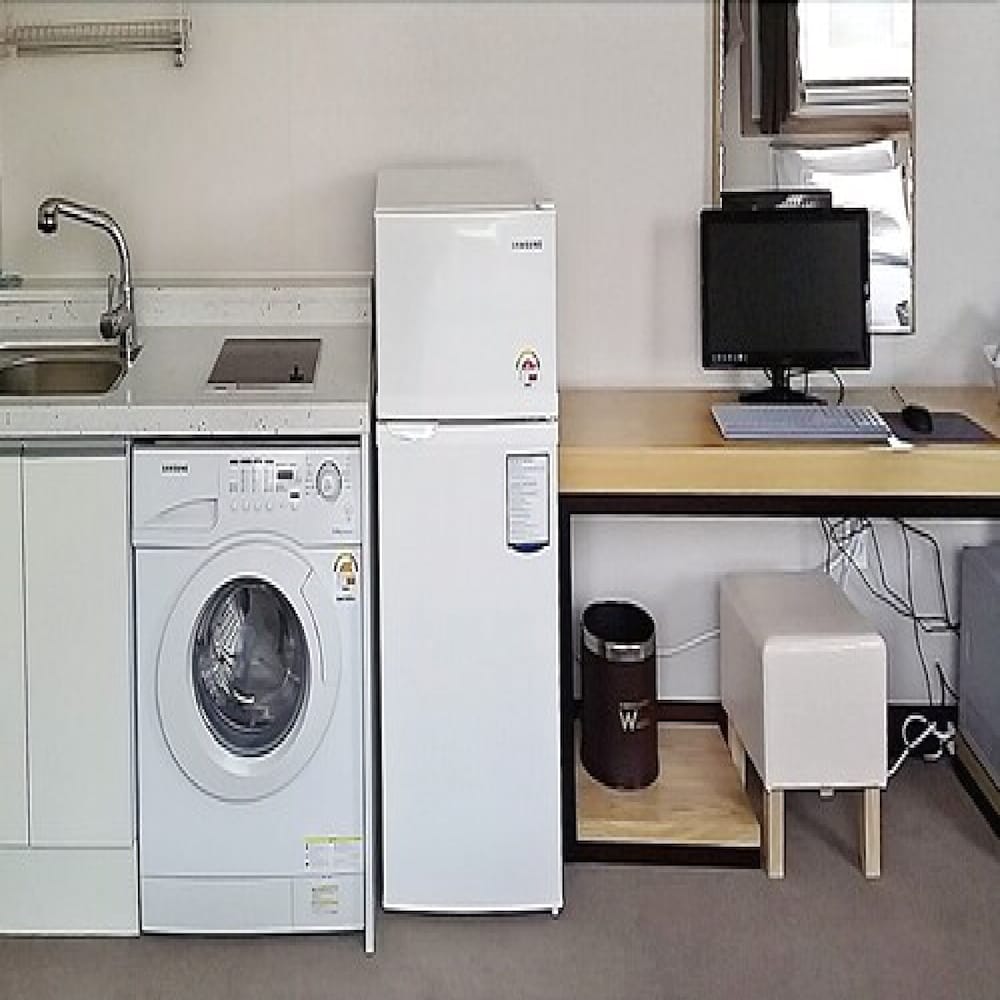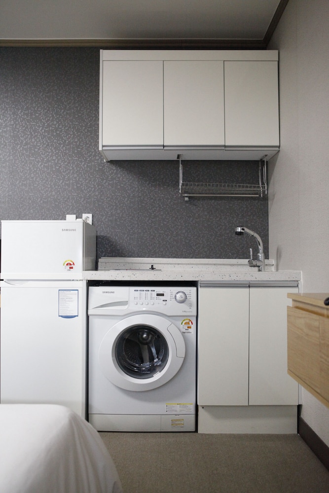 Central location, large rooms and staff friendly and efficient. Breakfast was included and was a simple buffet with western and Korean breakfast items served at the cafe. Our room included a washing machine, large fridge and a cook top, but no cooking utensils or crockery. There were no china cups only single use cupboard cups. There is a convenience store across the road, a large supermarket nearby and lots of restaurants around the hotel. Overall our group had a great stay, I would definitely stay there again.