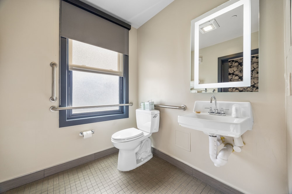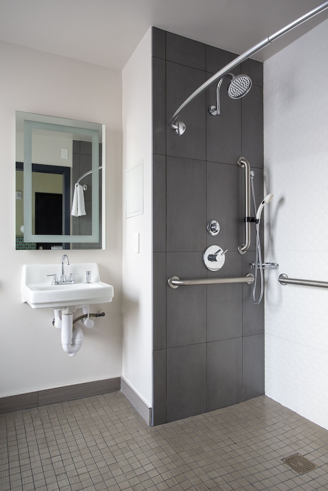 Step-in shower, this was why I chose it. Great & clean bedding, cart to manage luggage & gear, staff nice & helpful. Location near Muni 5 & 38, both going to Golden Gate Park. CVS & Walgreens close by. I have a permanent disability, so accessibility is important, and this place was remodeled & accessible. Front door even had an opener. One just had to be careful about location.