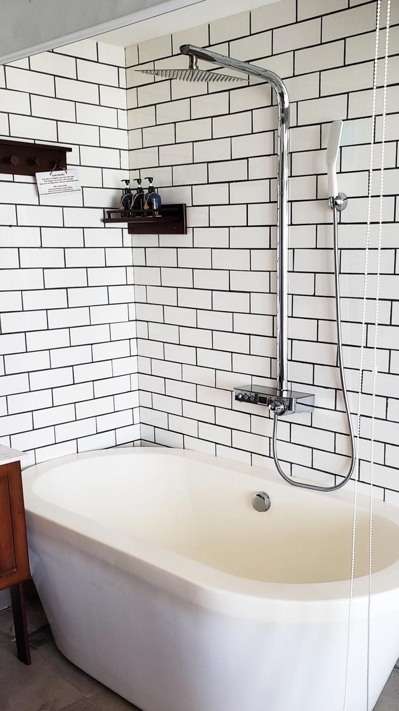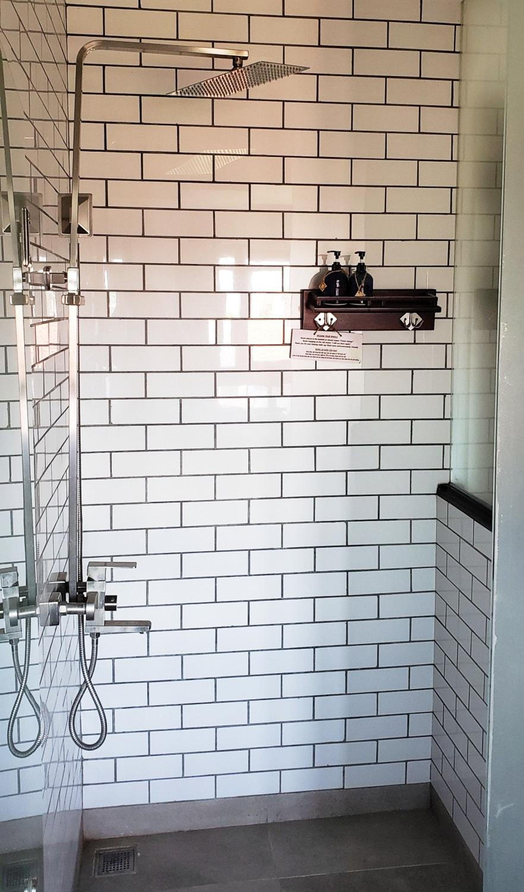 The design of the bath tub / shower area. Looks good but impractical