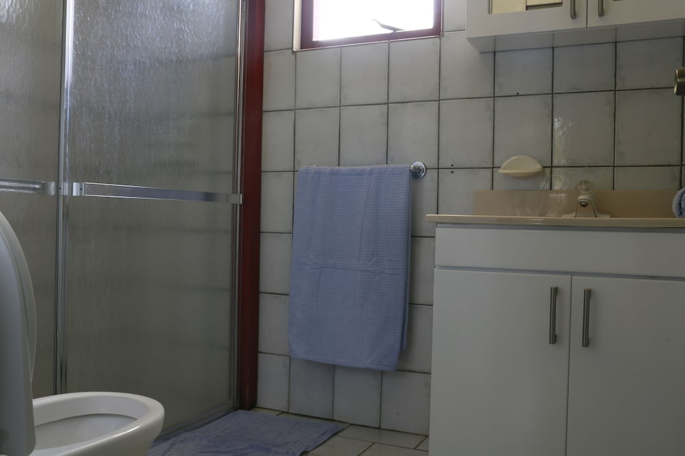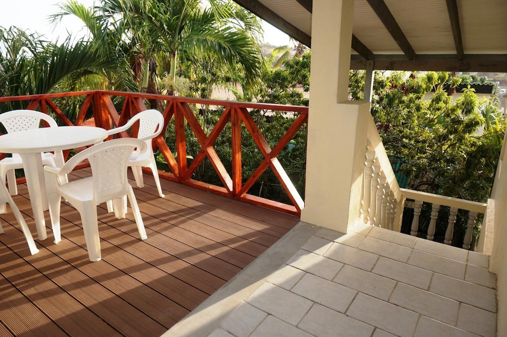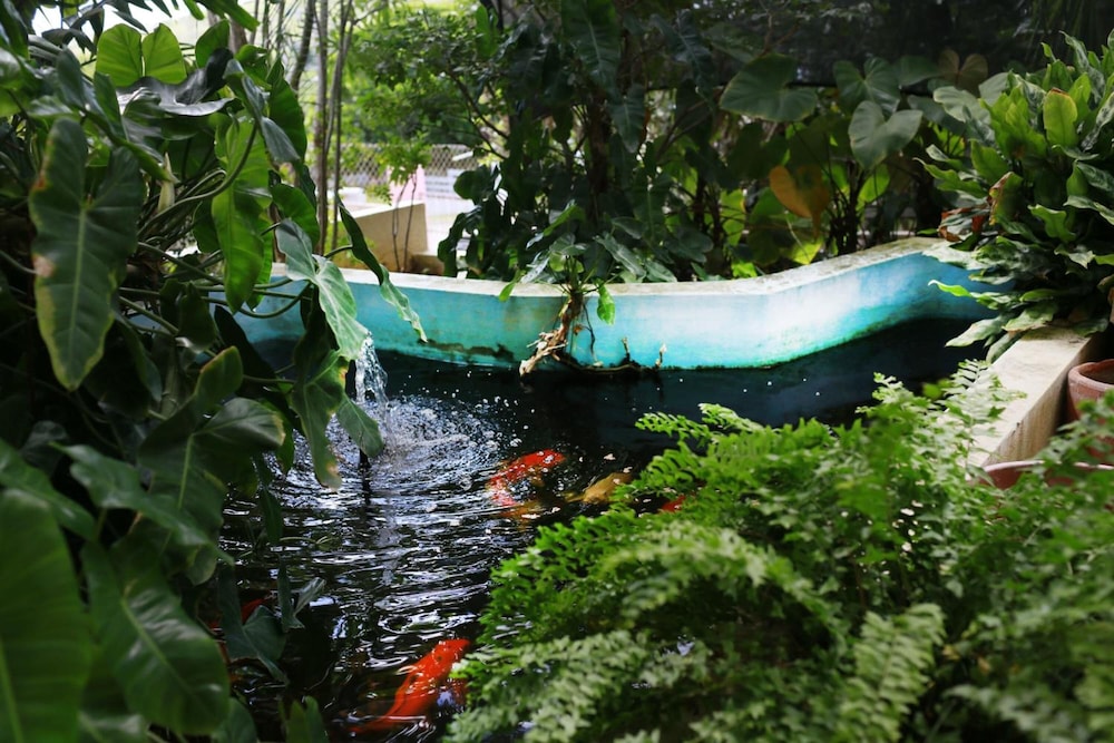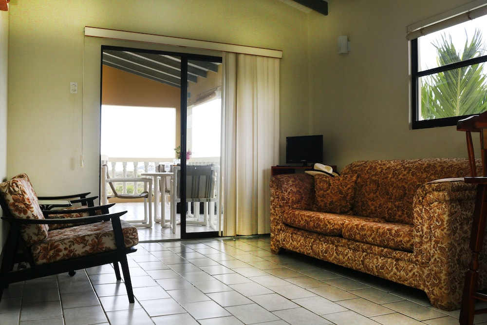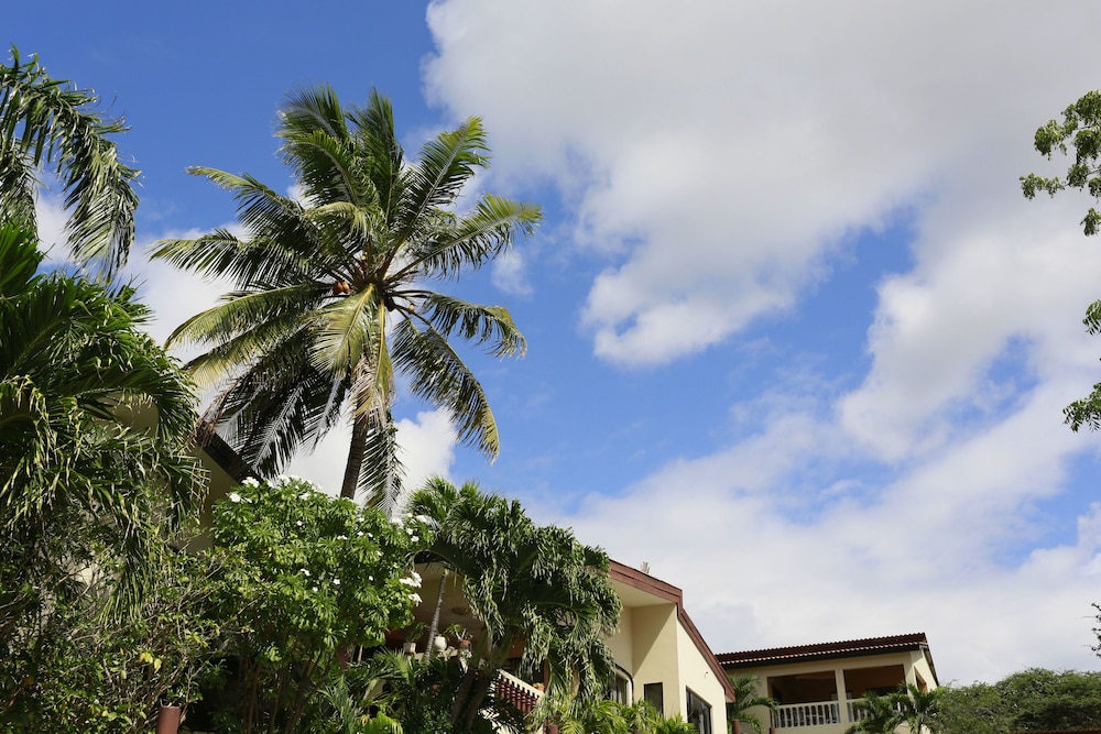 The walkway to the apartments are cool and shady with lots of green palms, fruit trees, and flowers and there is a porch where you can sit and relax. The living area is large and comfortable, with lots of closet space for storage, and cooking amenities.