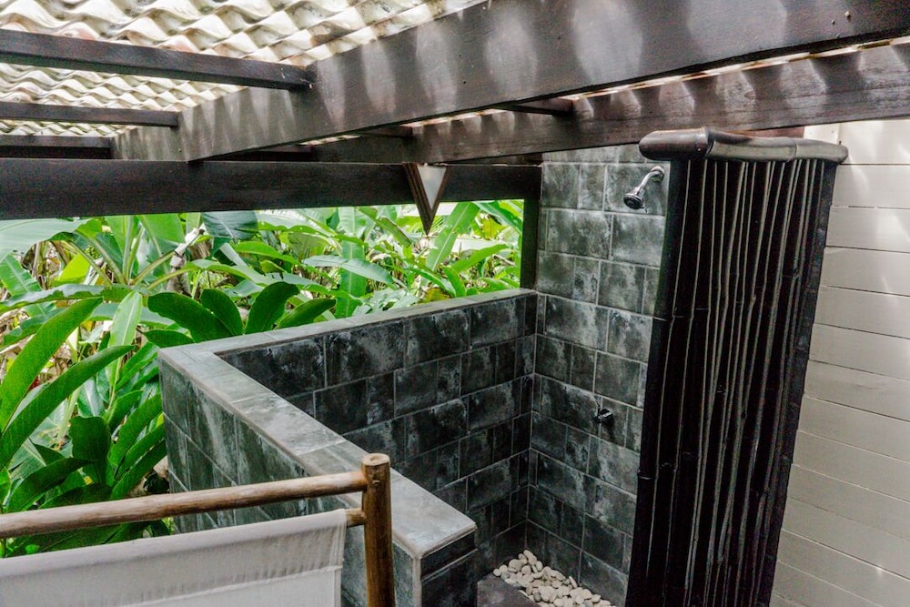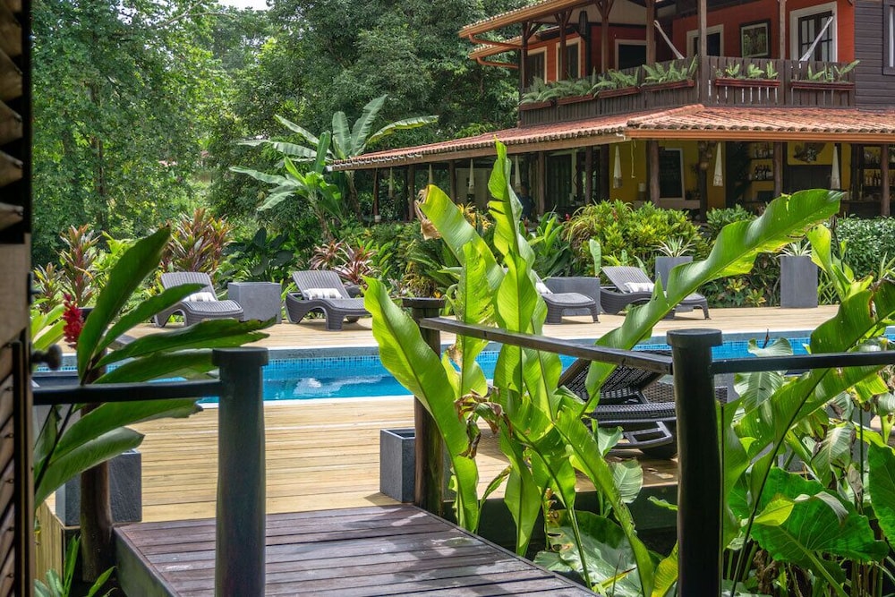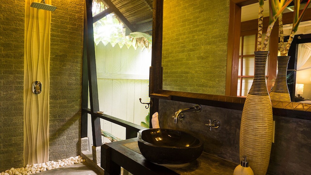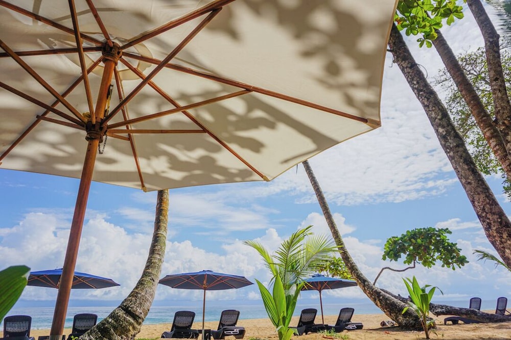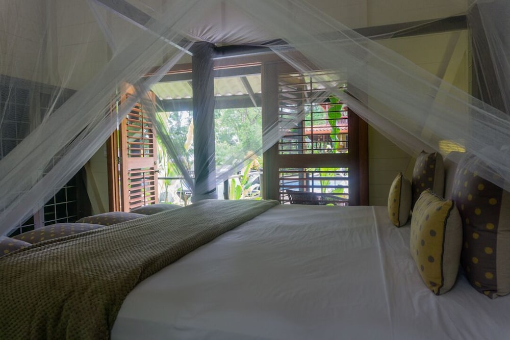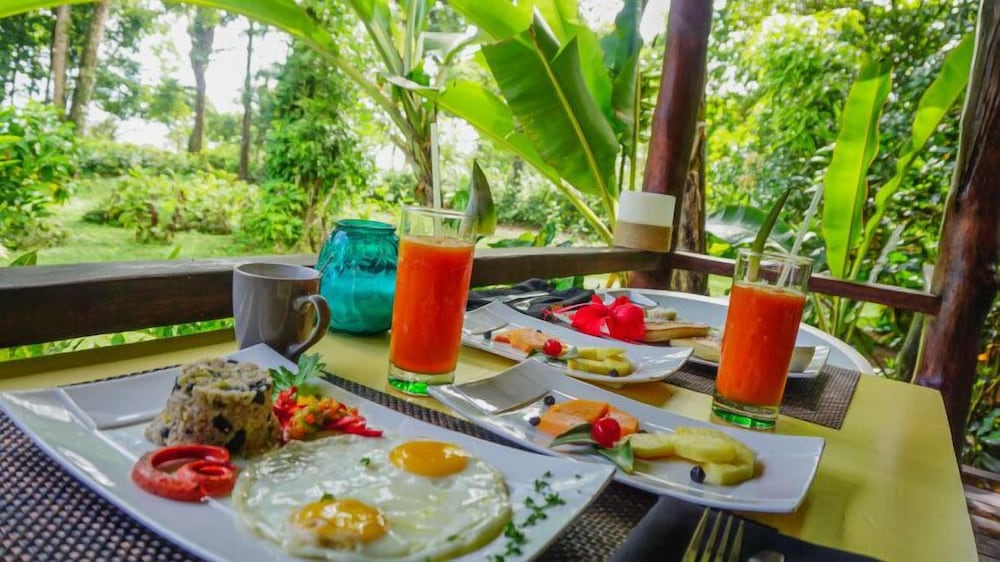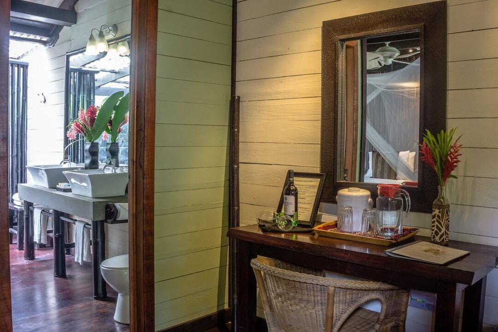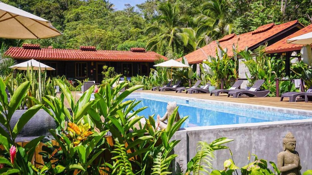 This small resort is located on the edge of the Jungle and only 20yds to a beautiful beach. Their gardens and grounds are very tropical as well as beautiful. The rooms are designed very nice and has an 'outdoor' shower area. The food was good and the service from staff was great. the only negative is no A/C, but we were lucky since it wasn't over 84 whole time.