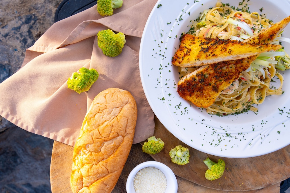 The breakfast was good but the fruit wasn't always fresh and one day the juice tasted a bit sour. We ate at the bar twice and the fish was very good. The chicken fingers were good too. Service was great as well.