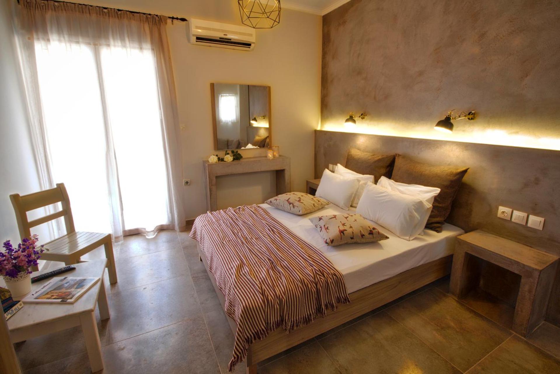 My boyfriend and I spent four lovely nights here while visiting the island early September. The location was perfect, just a short walk to the main road with bars, restaurants and shops, but also a calm Oasis by day and night as we could hear the waterfall in the pool and birds chirping from our balcony. Really enjoyed the pool area (they must have updated the furniture since the photos because they were big comfy wooden loungers around the pool, some others set back, cute chairs and a swing seat too). The pool isn’t heated but was perfect for the 30+ heat in the sun. The rooms are cute, very Greek, good facilities for cooking (fridge, hot plate, toasty machine) although we didn’t use as we dined out. Good size balcony over-looking the pool and great air con too.