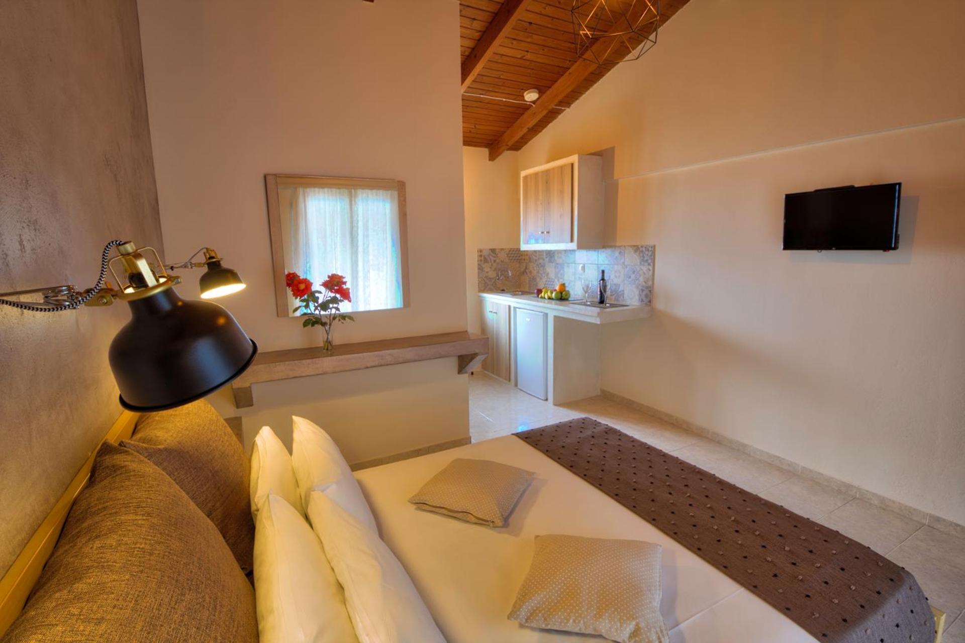 Experience a relaxing stay at Two Brothers, nestled in lush greenery just 1 km from the sandy beach of Kalamaki. The spacious studios, adorned in calming green tones, offer a comfortable retreat with beamed ceilings and tiled floors. Stay connected with complimentary Wi-Fi and unwind on your furnished balcony overlooking the pool and garden.
