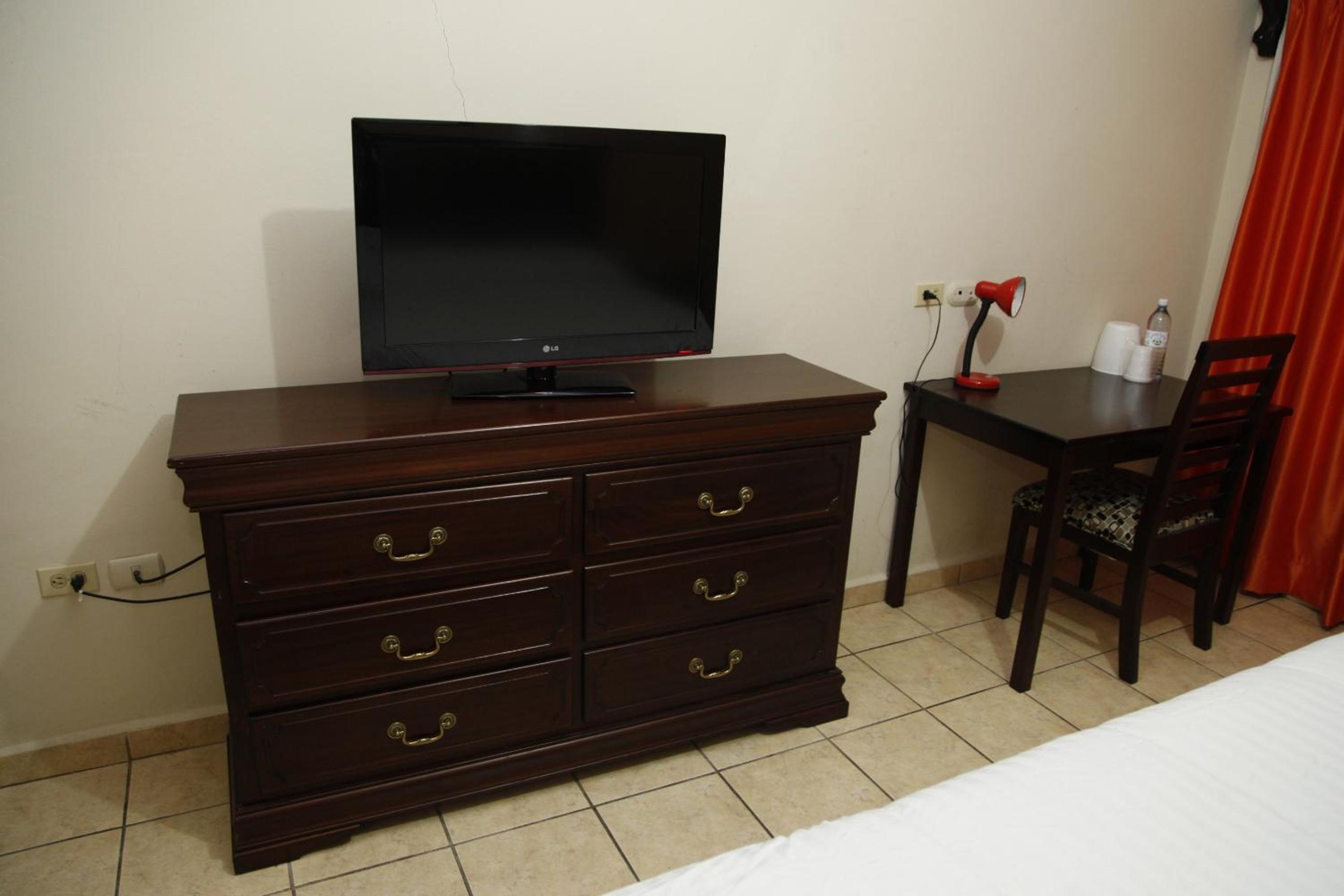Room was clean. It has a pool. Close to the airport. locked up at night with a guard. Food on premises