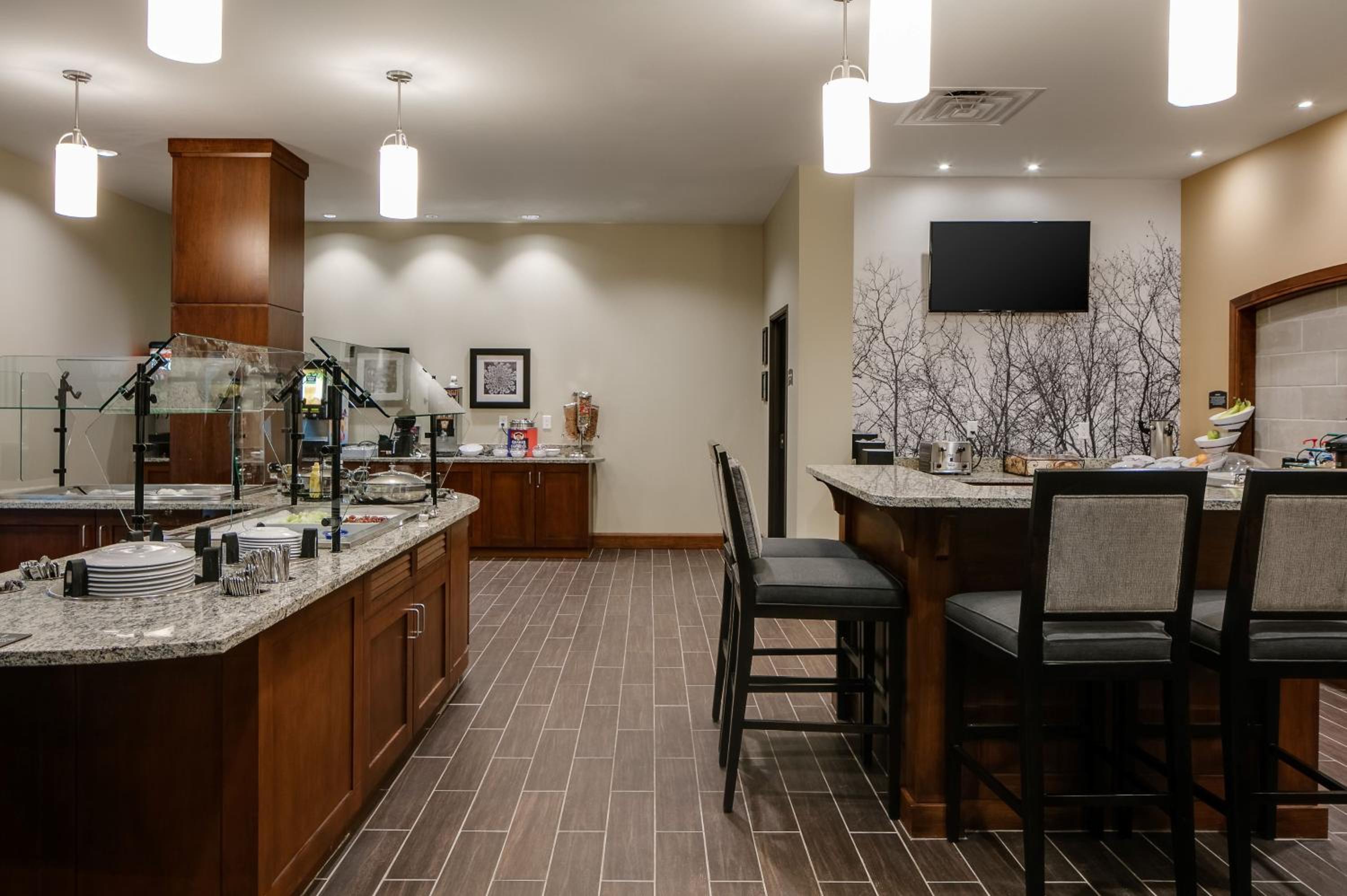 Indulge in comfort at Staybridge Suites Des Moines Downtown with spacious suites featuring flat-screen TVs, work desks, and cozy sofa beds. Each suite boasts a fully equipped kitchen, perfect for preparing meals with a stove, microwave, refrigerator, dishwasher, and dining table.